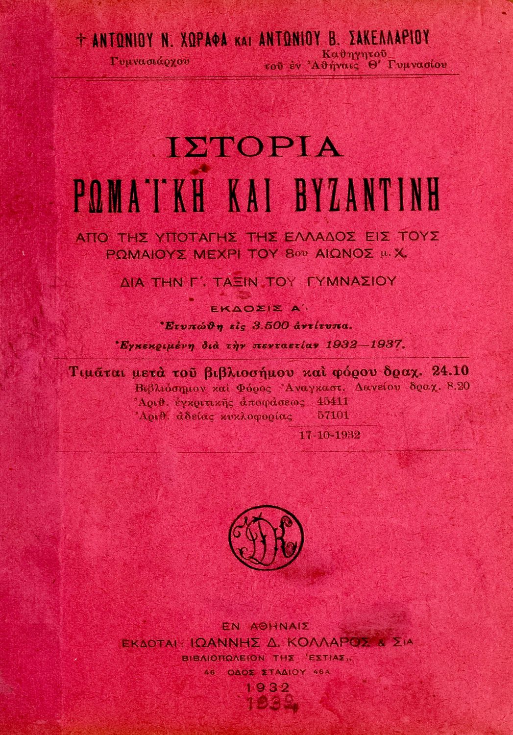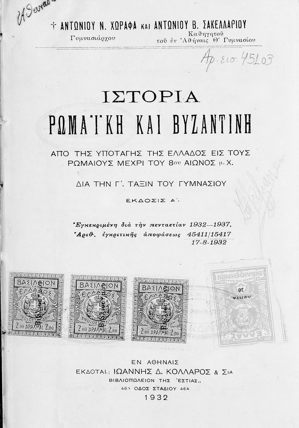 Τίτλος: Ιστορία Ρωμαϊκή και Βυζαντινή από της υποταγής της Ελλάδος εις τους Ρωμαίους μέχρι του 8ου αιώνος μ. Χ. Δια την Γ΄ Τάξιν του Γυμνασίου