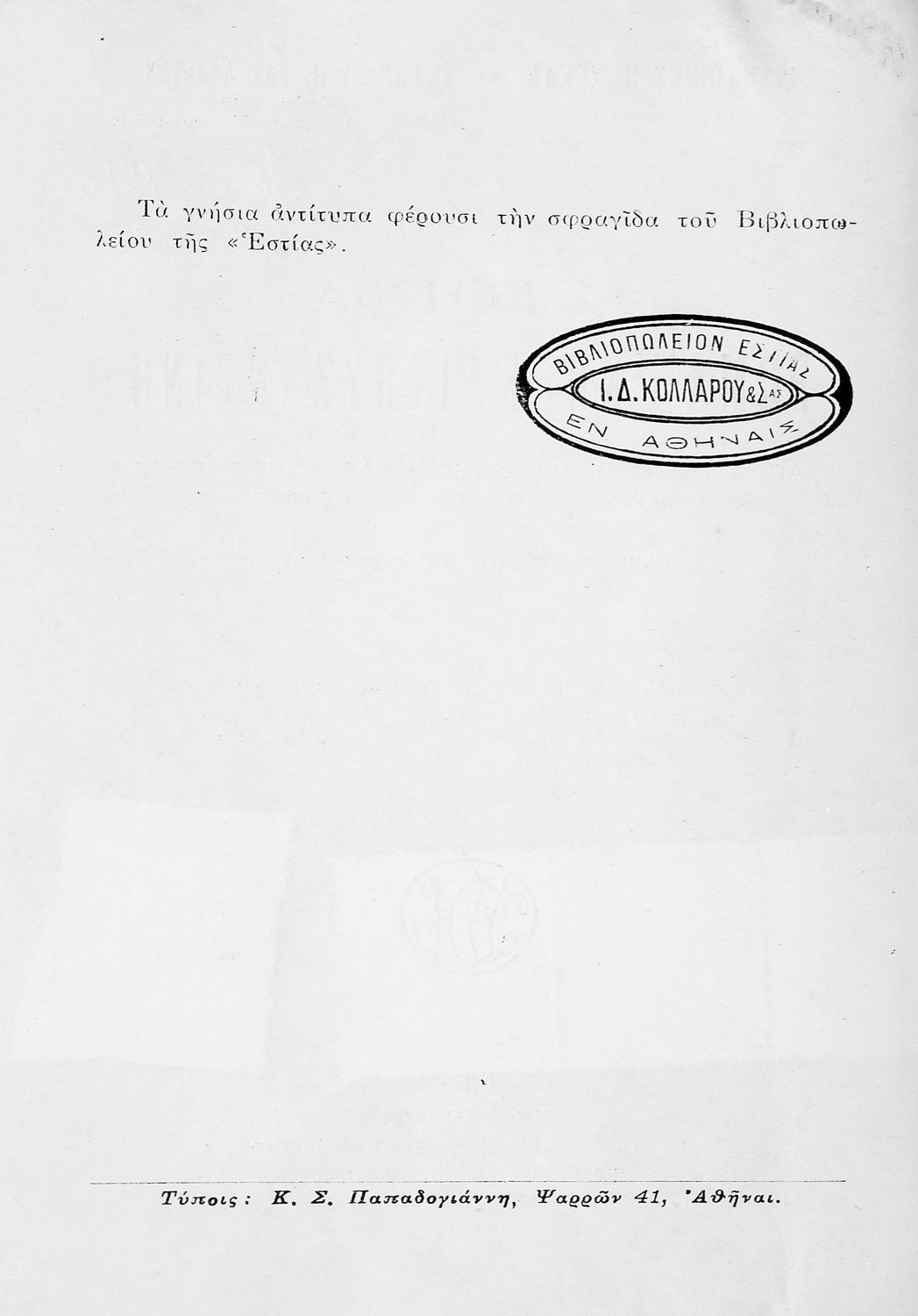 Εκδότης: Ιωάννης Δ. Κολλάρος και ΣΙΑ, Βιβλιοπωλείο της "Εστίας"
