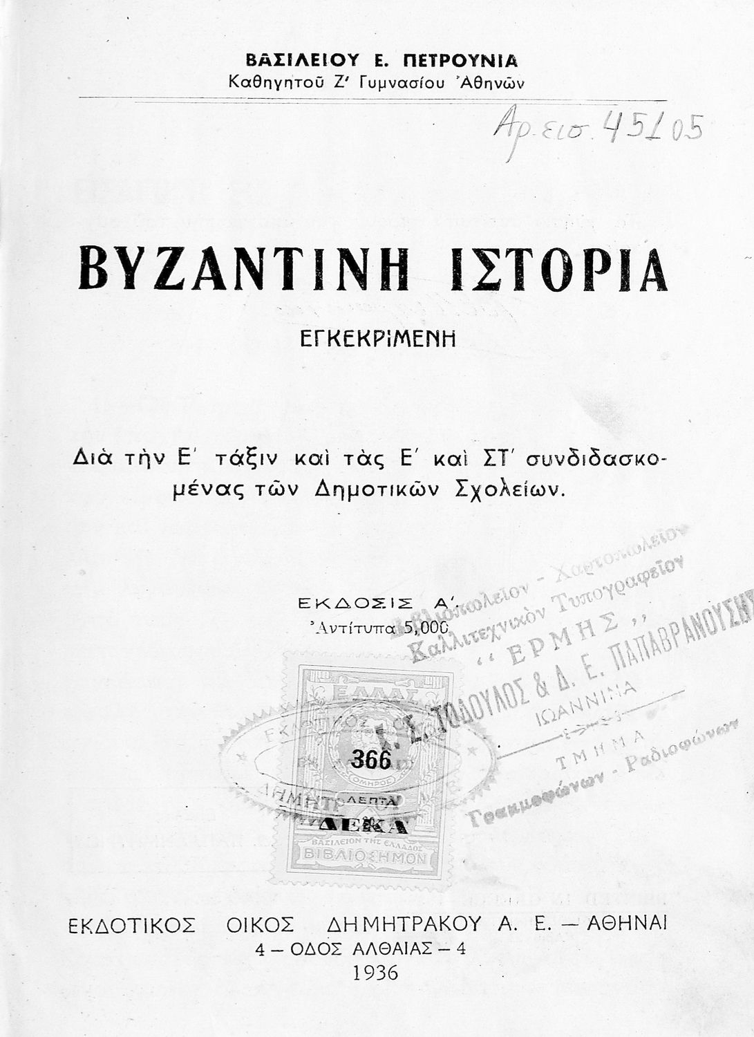 Κωδικός αναγνώρισης: 01-45105 Τίτλος: Βυζαντινή Ιστορία. Δια την Ε΄ Τάξιν και τας Ε΄ και ΣΤ΄ συνδιδασκαλίας των Δημοτικών Σχολείων Συγγραφέας: Βασίλειος Ε. Πετρούνιας Μέγεθος και υπόστρωμα: Σχολικό εγχειρίδιο, σκληρό εξώφυλλο, 126 σελίδες. Σκίτσα, χάρτης, εικόνες (ασπρόμαυρα). |