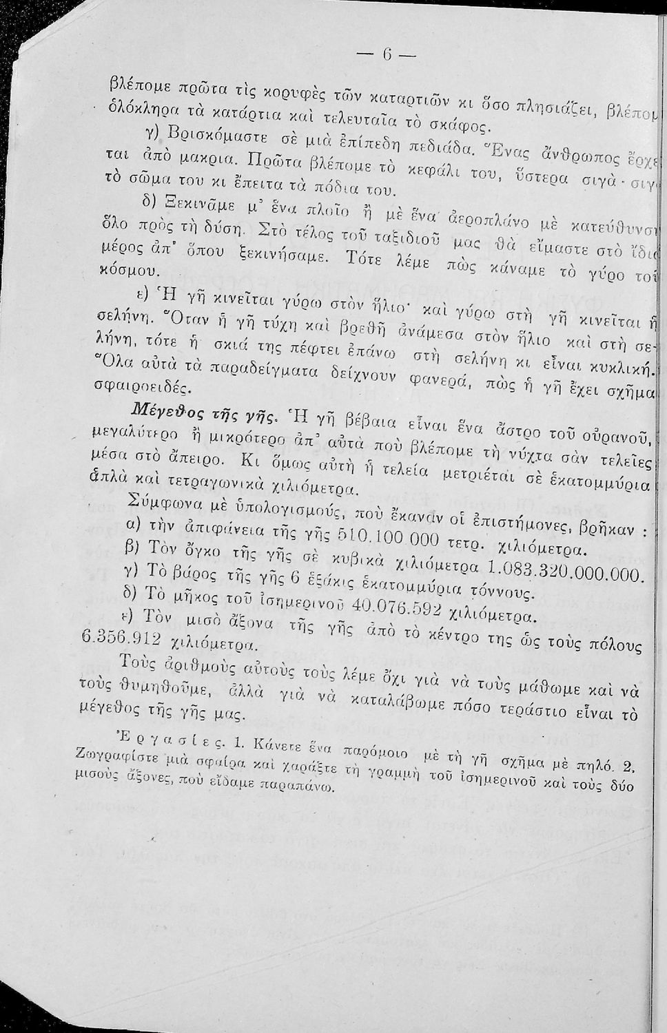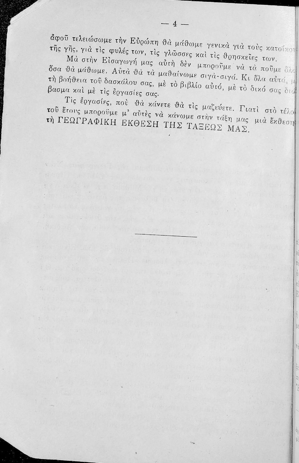 Πρόκειται για σχολικό εγχειρίδιο το οποίο προοριζόταν για τη διδασκαλία του μαθήματος της Γεωγραφίας στην Ε΄ και ΣΤ΄ Δημοτικού. Φέρει λίγες προσωπικές σημειώσεις του μαθητή και το εξώφυλλο παρουσιάζεται αρκετά