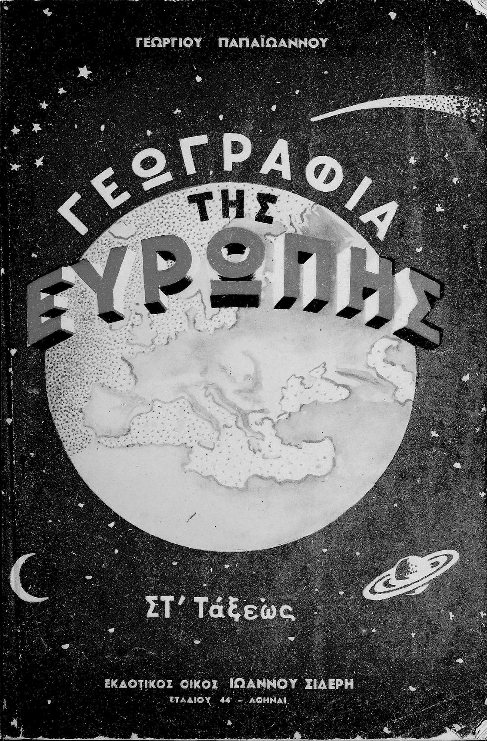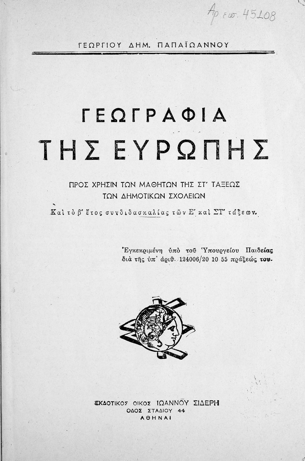 Κωδικός αναγνώρισης: 01-45108 Τίτλος: Γεωγραφία της Ευρώπης, προς χρήσιν των μαθητών της ΣΤ΄ τάξεως των Δημοτικών Σχολείων και το β΄ έτος συνδιδασκαλίας των Ε΄ και ΣΤ΄ τάξεων Συγγραφέας: Γεωργ. Δ. Παπαϊωάννου Μέγεθος και υπόστρωμα: Μαθητικό βοήθημα, μαλακό εξώφυλλο, 136 σελίδες. Εικόνες (ασπρόμαυρες), χάρτες (ασπρόμαυροι). |