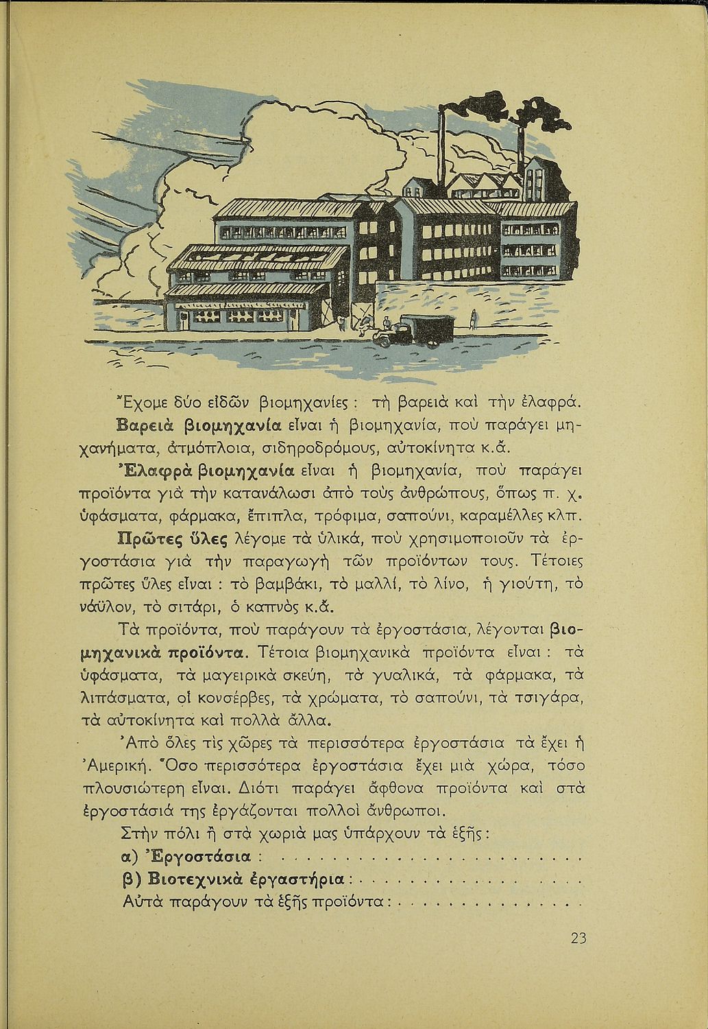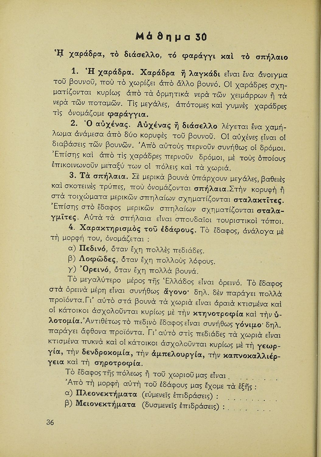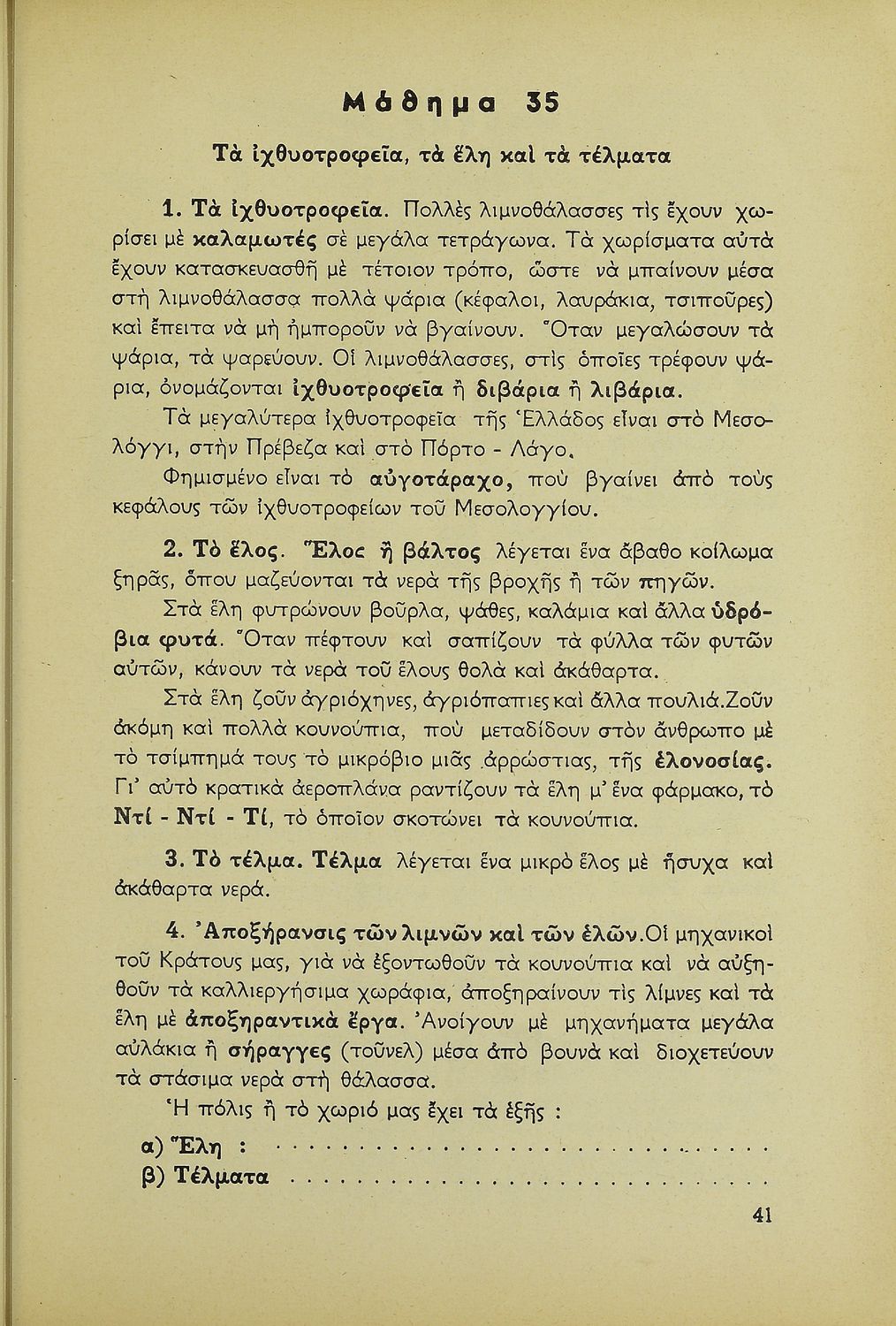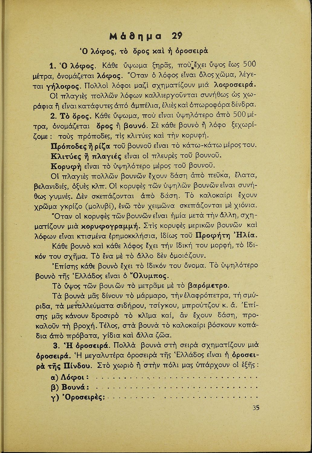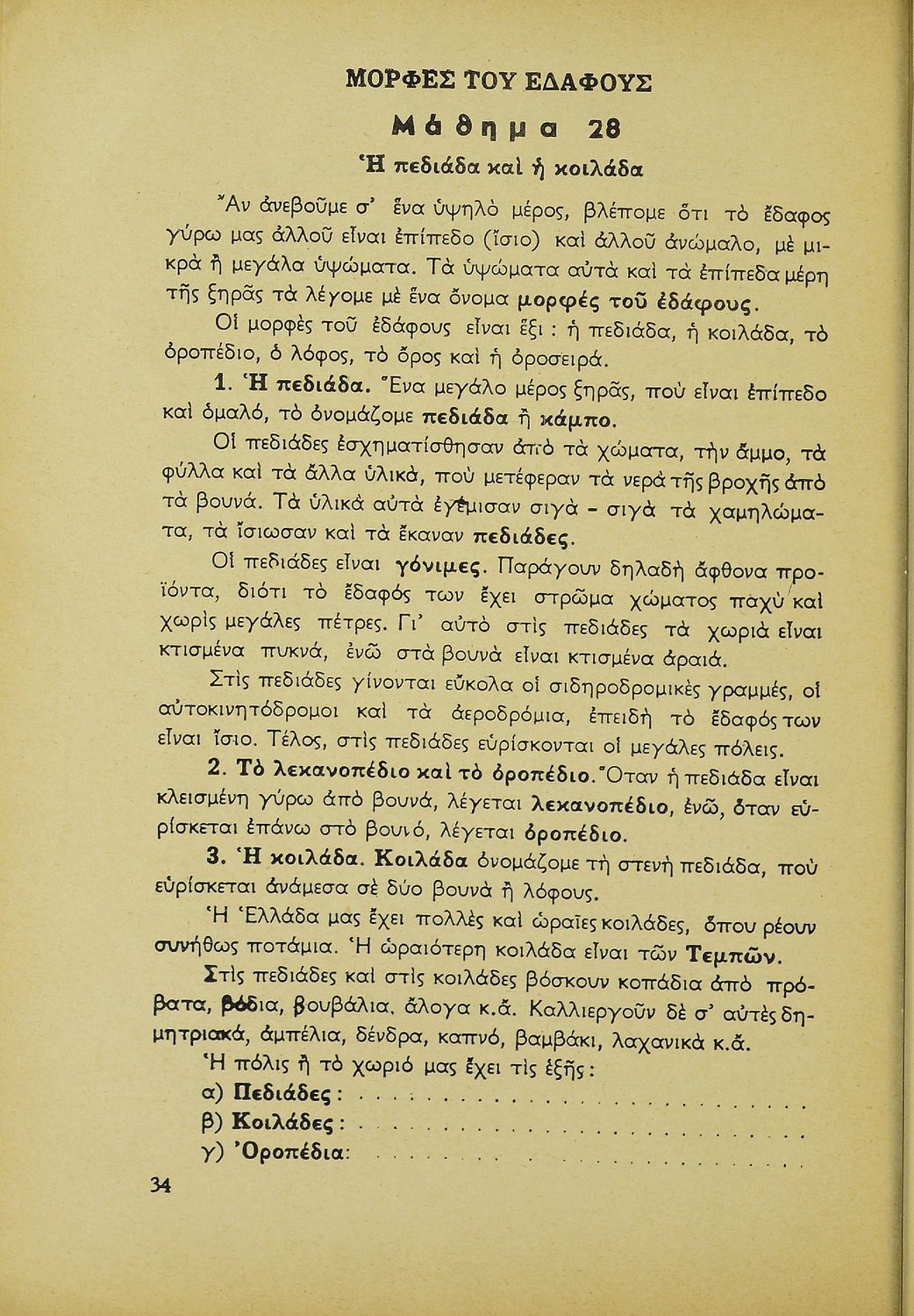 Σχολικό εγχειρίδιο Γεωγραφίας Δημοτικού που περιέχει στοιχεία φυσικής γεωγραφίας και εξετάζει την Ελλάδα ανά διαμέρισμα και νομό από γεωφυσική και οικονομική άποψη.