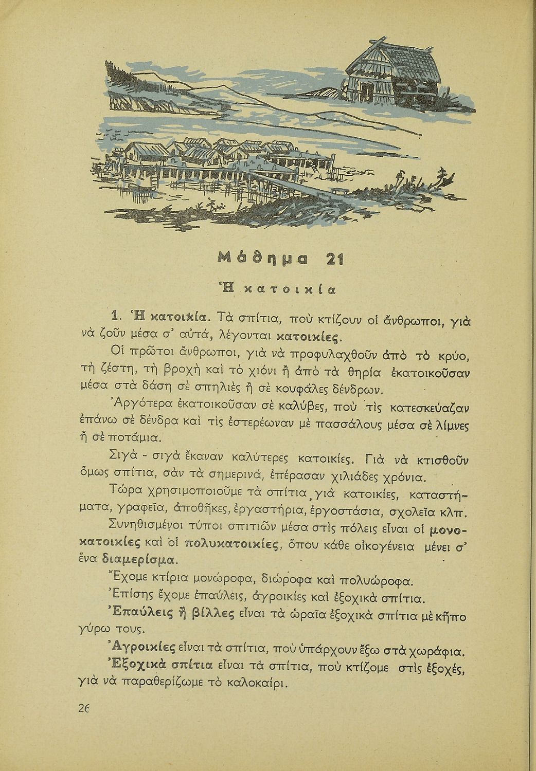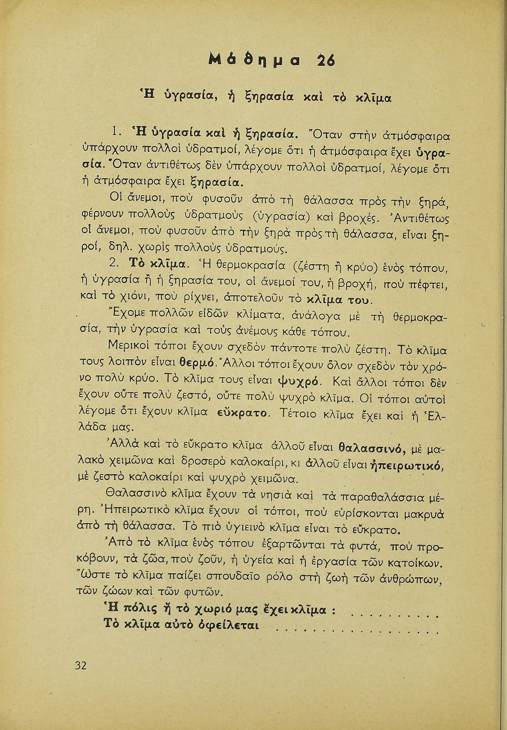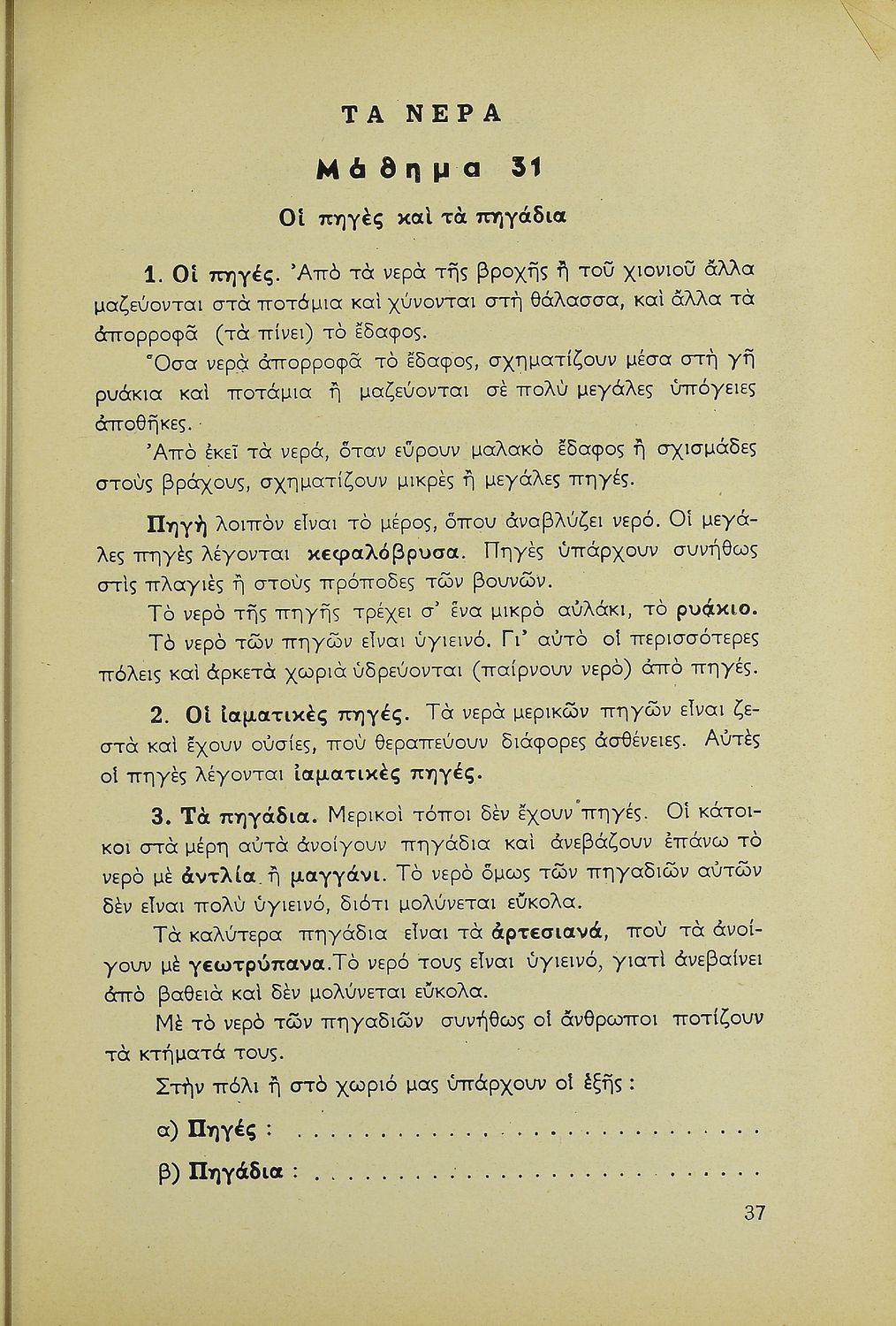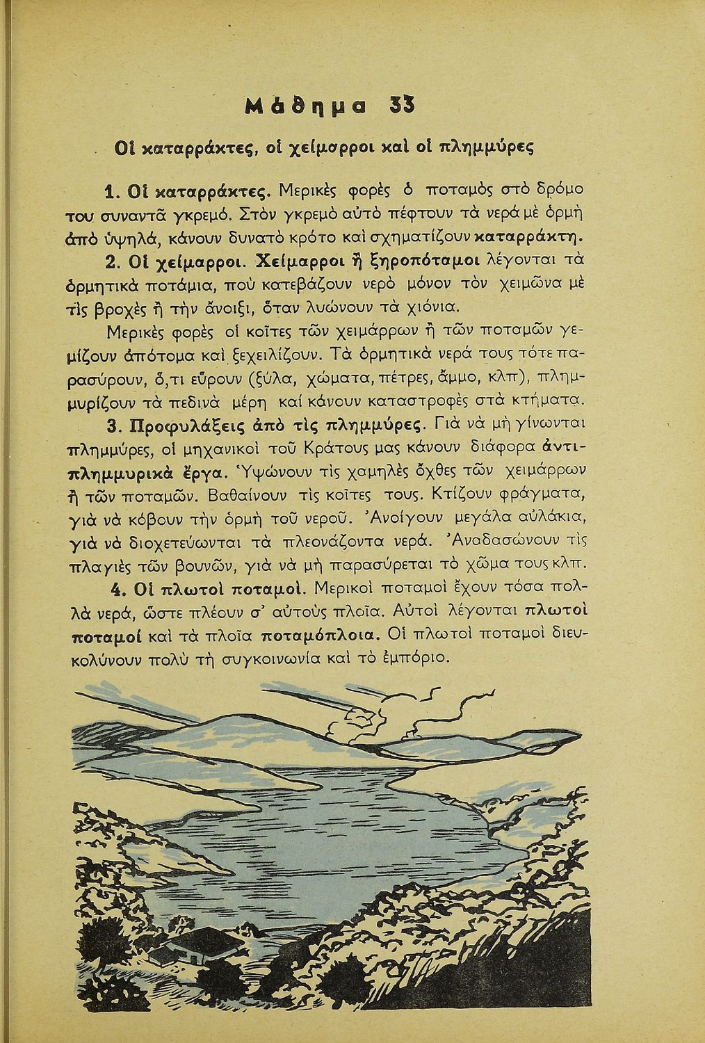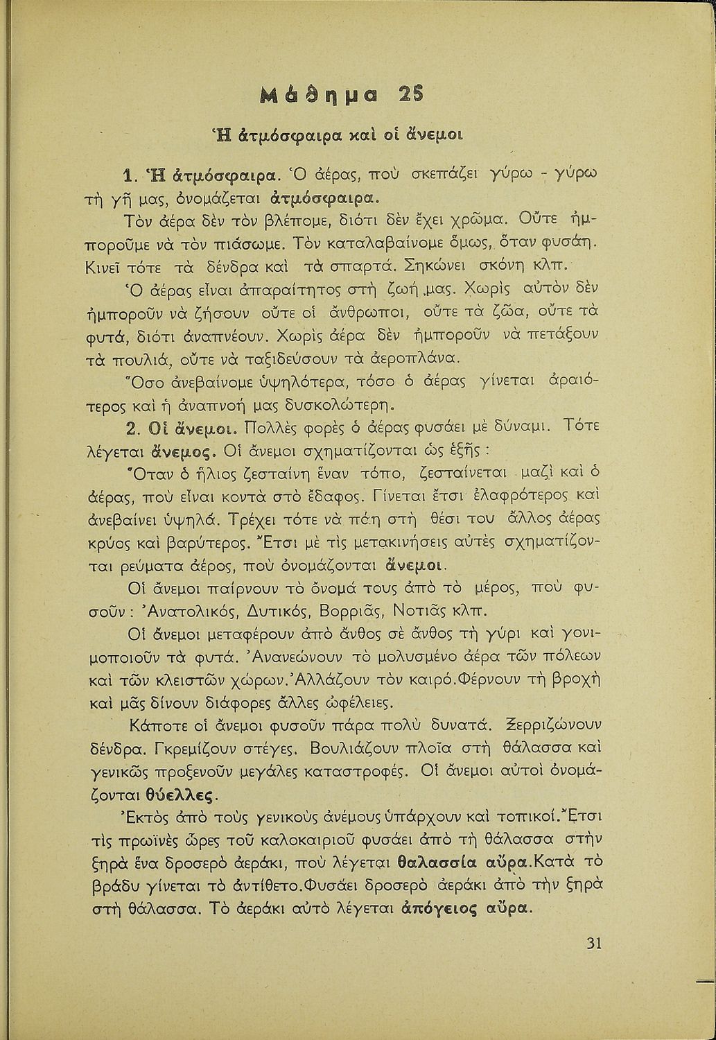 Σχολικό εγχειρίδιο Γεωγραφίας για τις Γ΄, Δ΄, Ε΄, ΣΤ΄ Δημοτικού που περιλαμβάνει εισαγωγή στην πατριδογνωσία και παρουσιάζει την φυσική και πολιτική γεωγραφία της Παλαιάς και Νέας Ελλάδας.