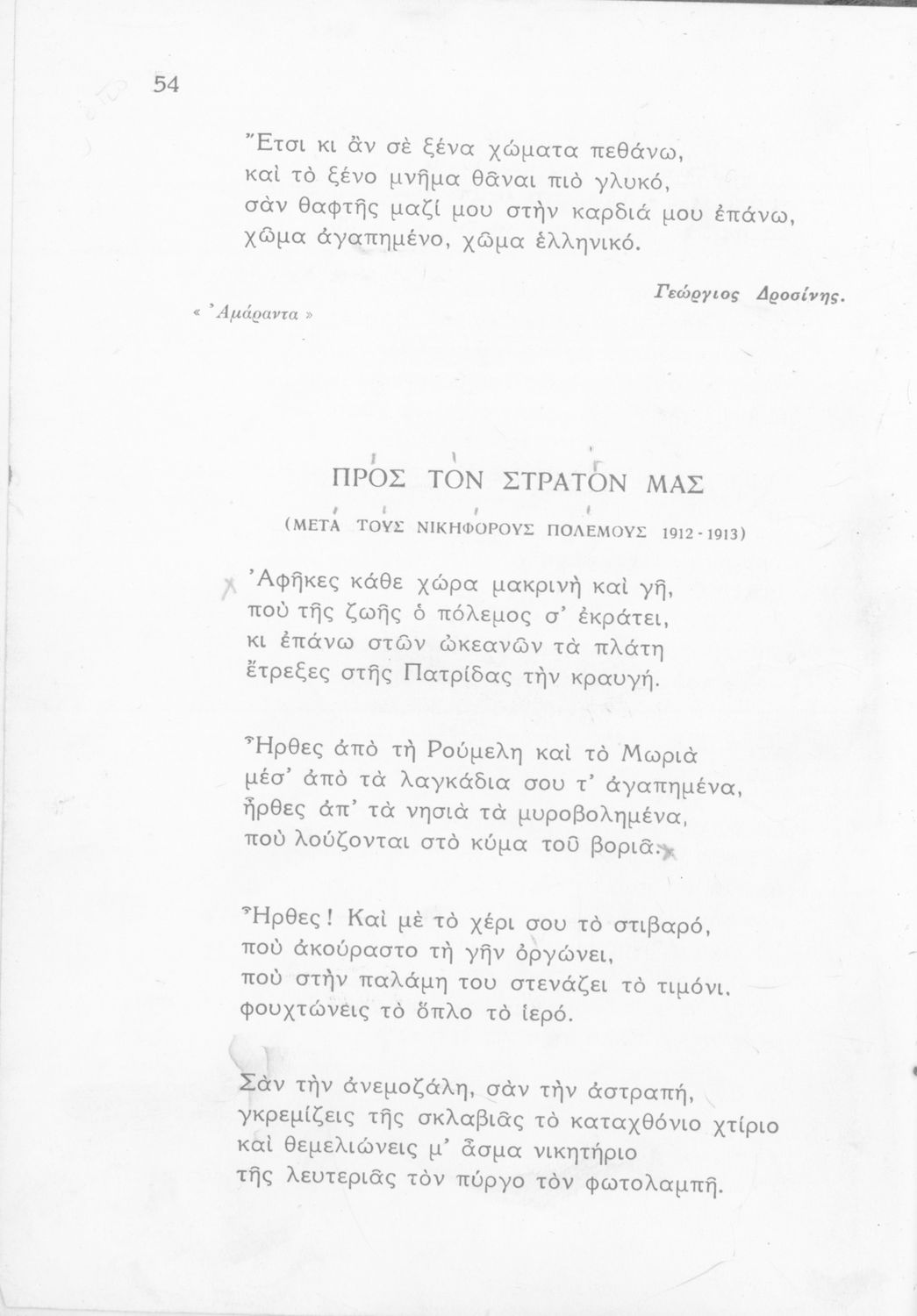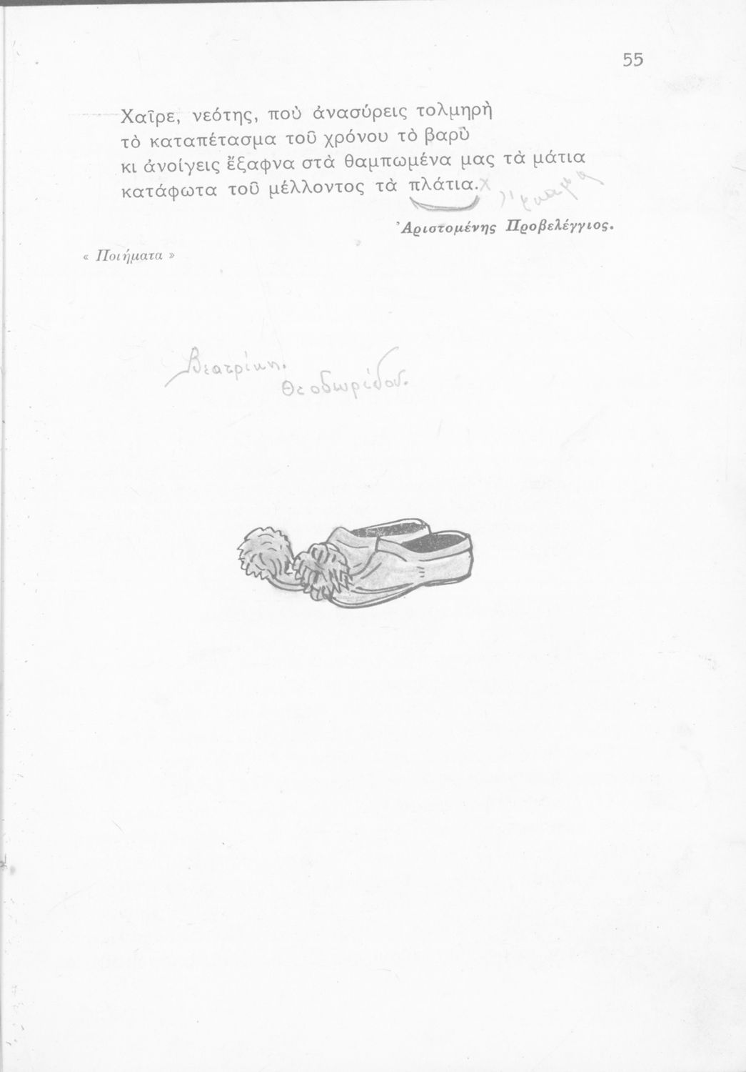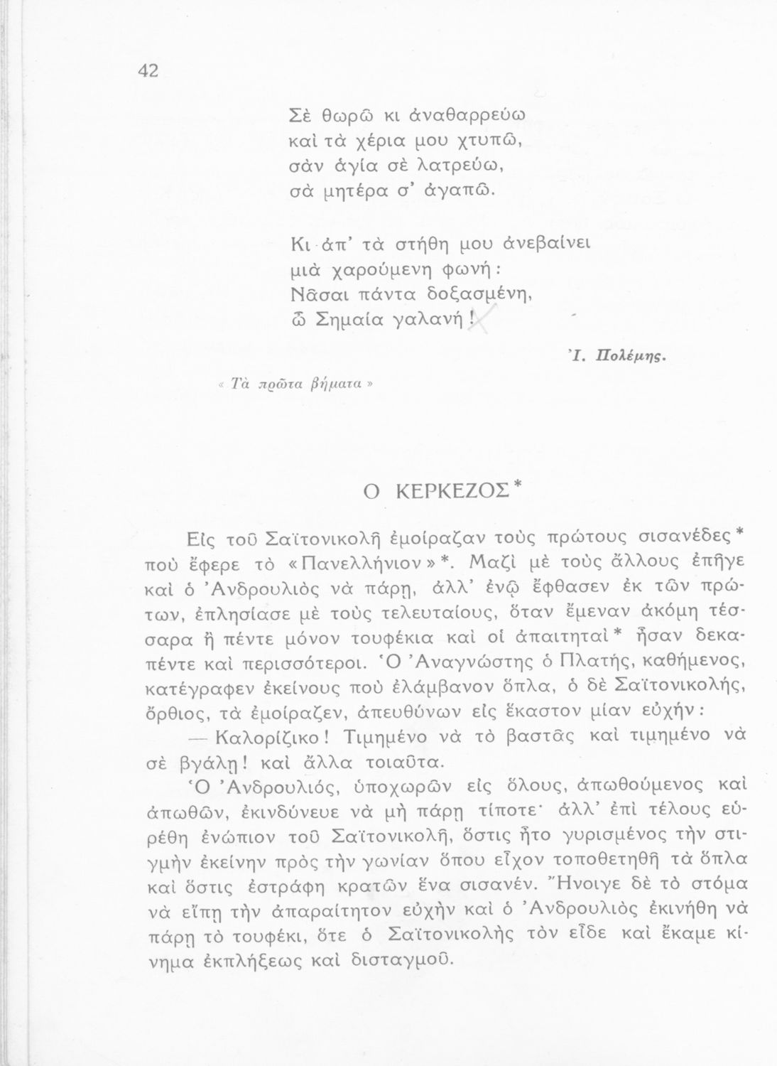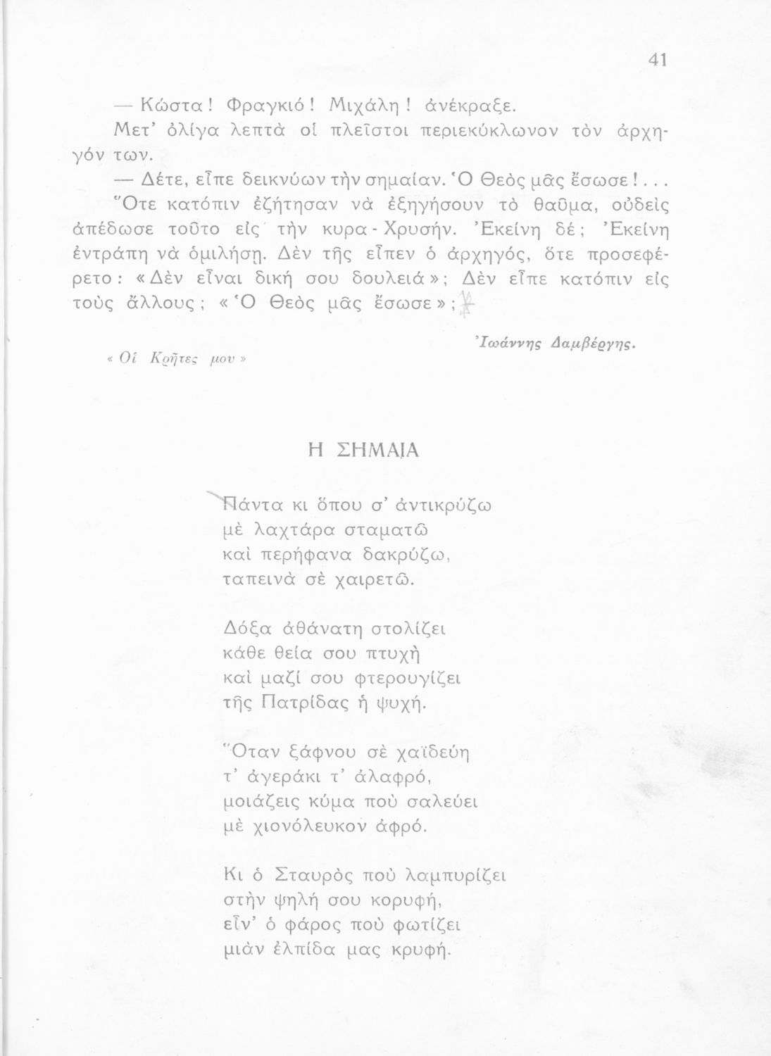Σχολικό εγχειρίδιο Νέων Ελληνικών Α΄ Γυμνασίου που περιλαμβάνει ποιήματα και πεζά Ελλήνων συγγραφέων με θέματα εμπνευσμένα από τη θρησκευτική ζωή, την αρχαία και νεώτερη ελληνική ιστορία, την οικογενειακή και κοινωνική ζωή και την ελληνική ύπαιθρο. Περιέχει και παράρτημα με βιογραφίες των συγγραφέων και λεξιλόγιο.