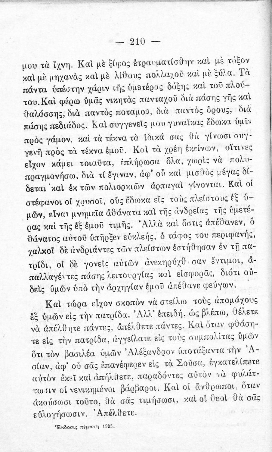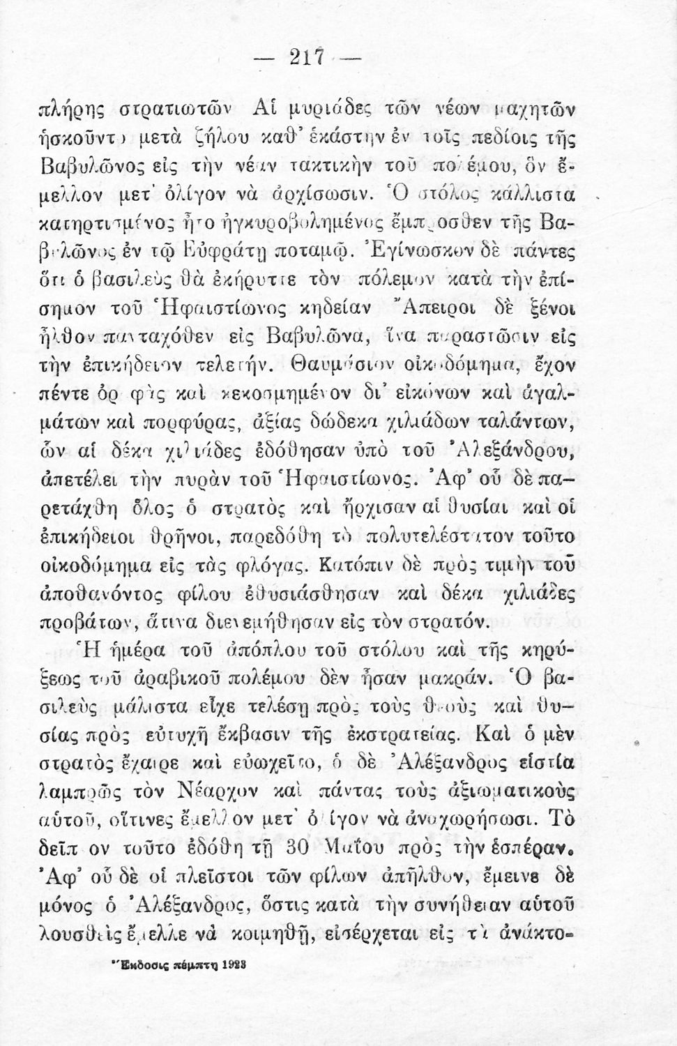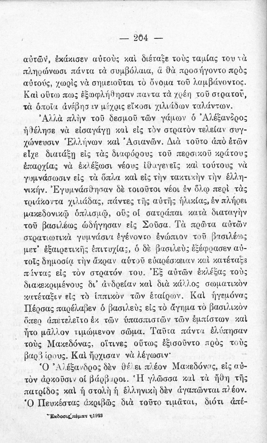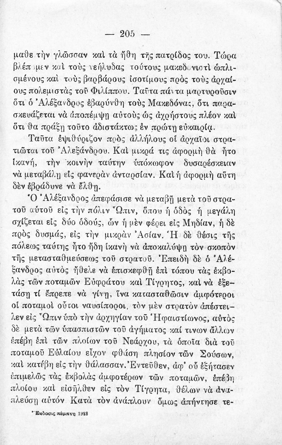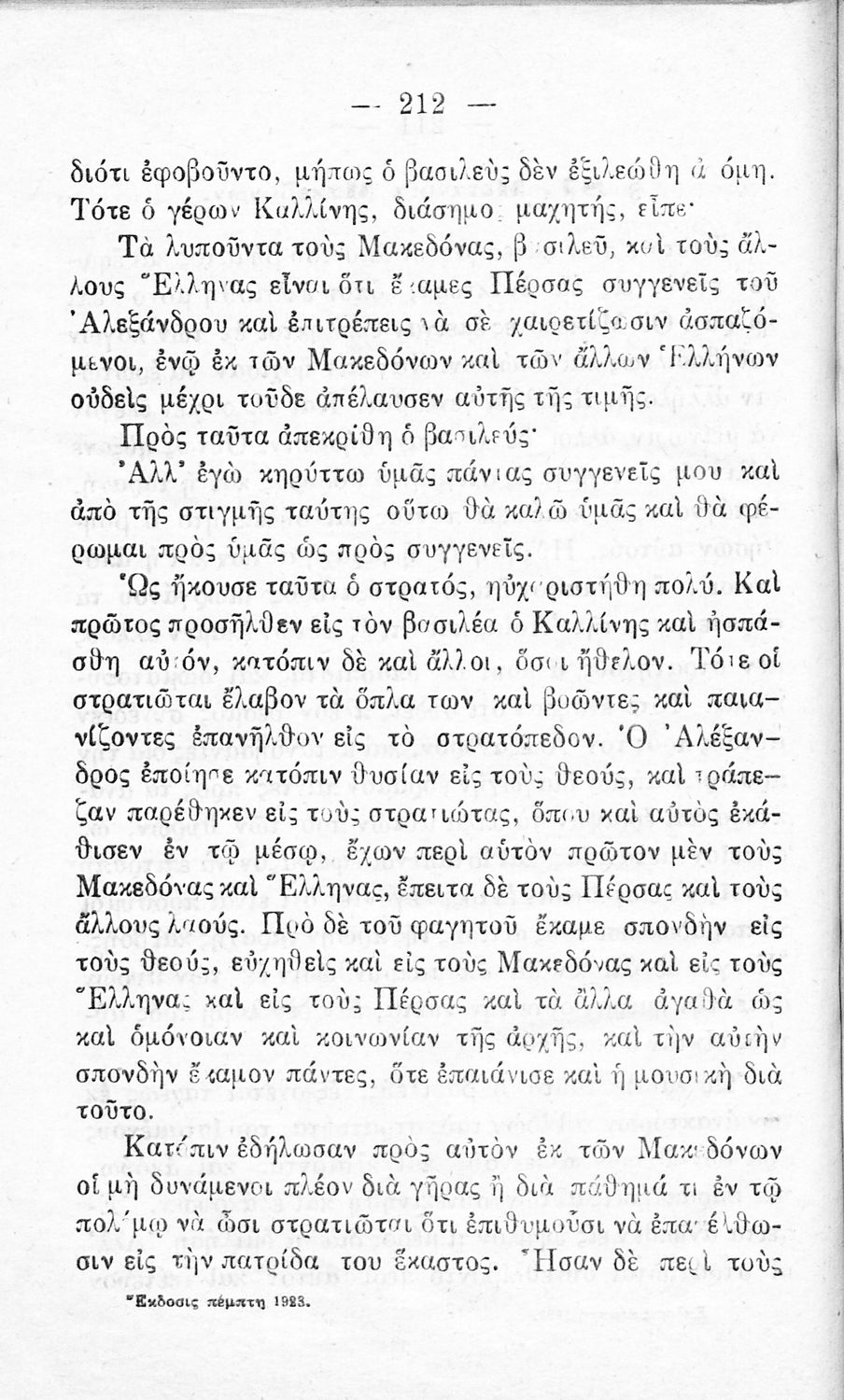Αναγνωστικό για την Ε΄ Δημοτικού που εξιστορεί την ιστορία του Μεγάλου Αλεξάνδρου με σκοπό να εξυψώσει το φρόνημα των Ελλήνων, που έχει "πληγεί από τη Μικρασιατική καταστροφή", και να τους δώσει "παρηγοριά και