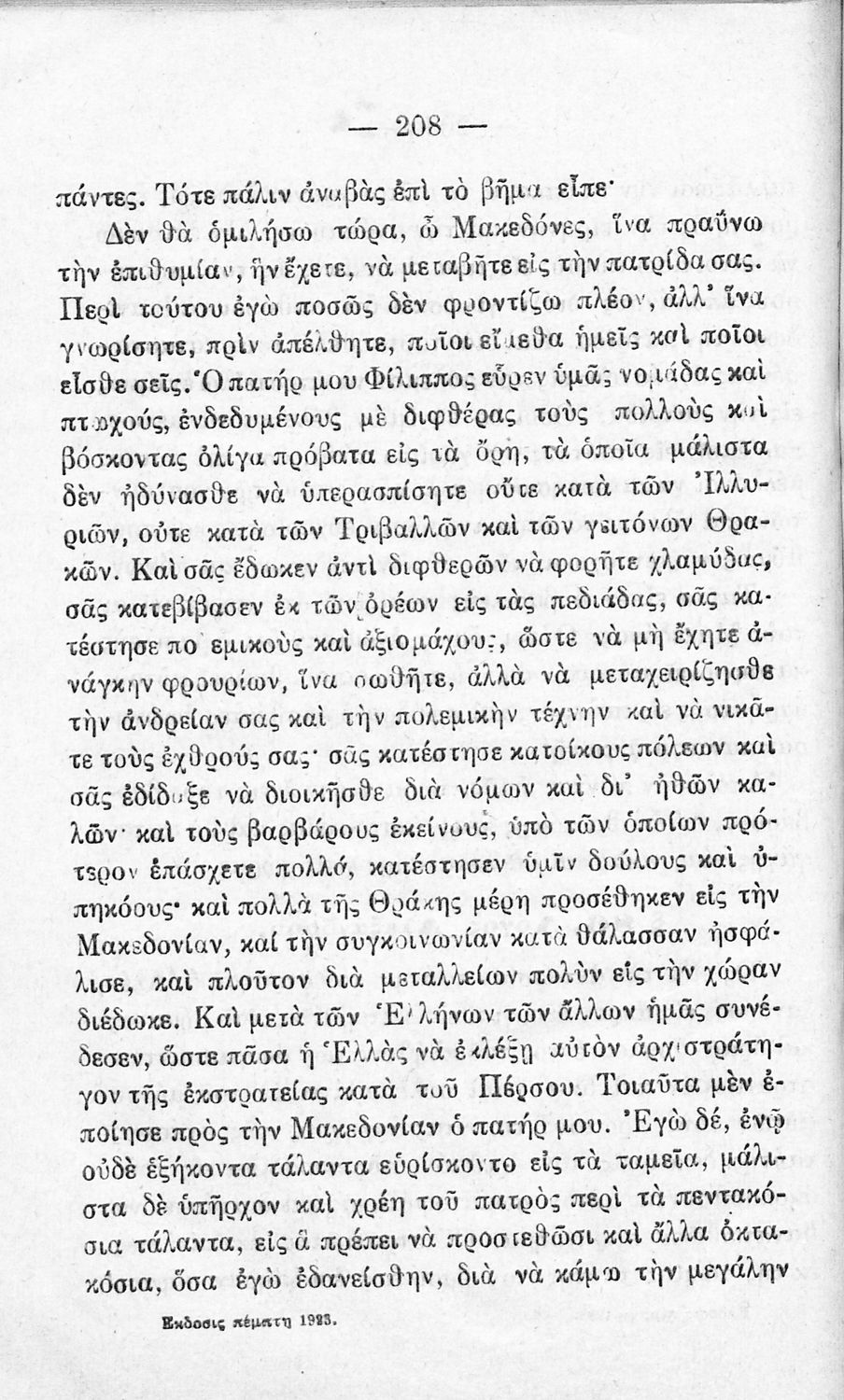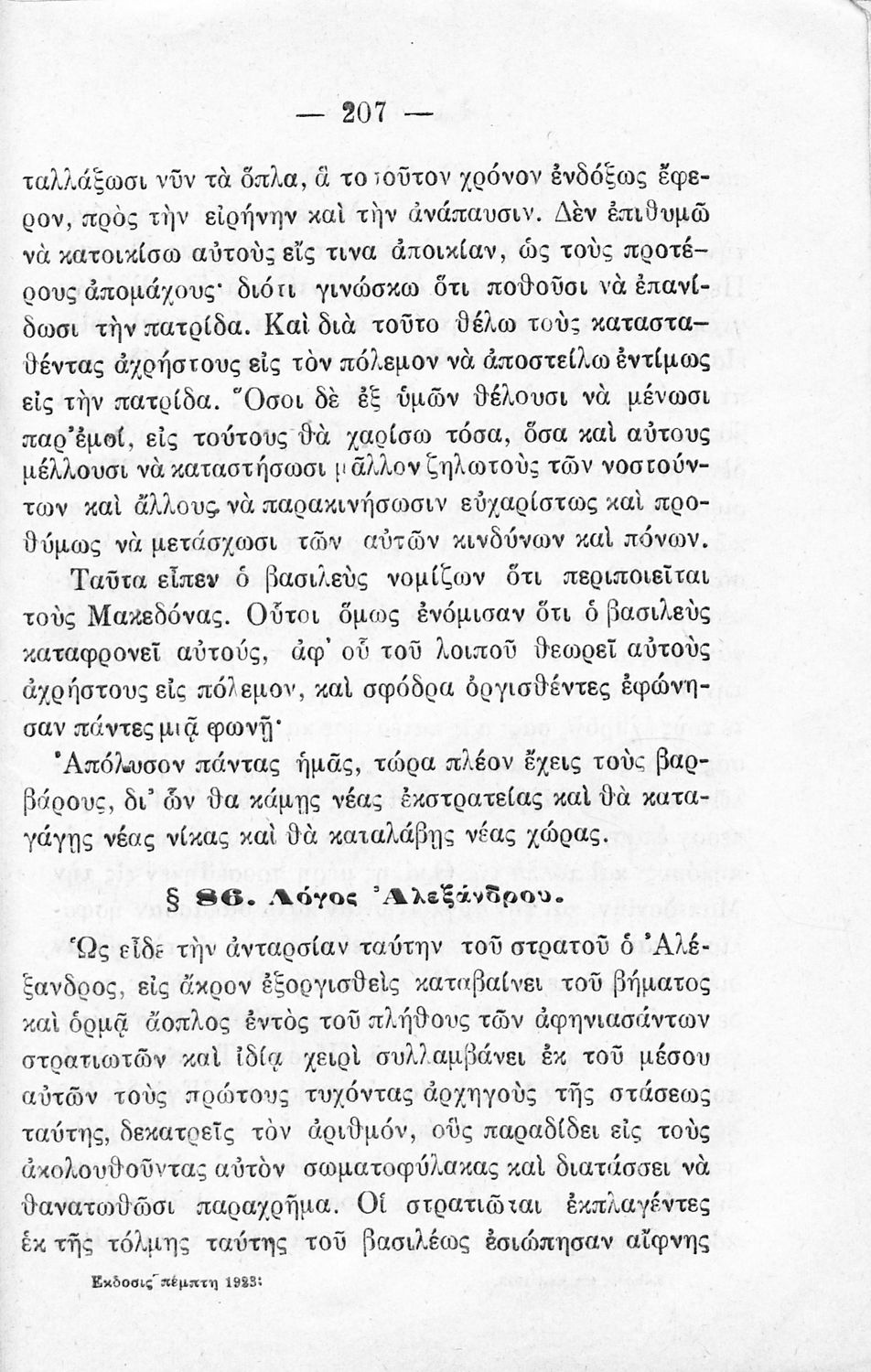 Παρουσίαση περιεχομένου: Αναγνωστικό Ε' Δημοτικού που εξιστορεί τη ζωή και το έργο του Μ. Αλεξάνδρου. Προοριζόταν, όπως αναφέρει η έκθεση των κριτών, να εμπνεύσει "φρονήματα υψηλά και γενναία και να υποθάλψη το συναίσθημα της φιλοπατρίας" στους μαθητές. Περιέχει και ποιήματα πατριωτικού και θρησκευτικού περιεχομένου.