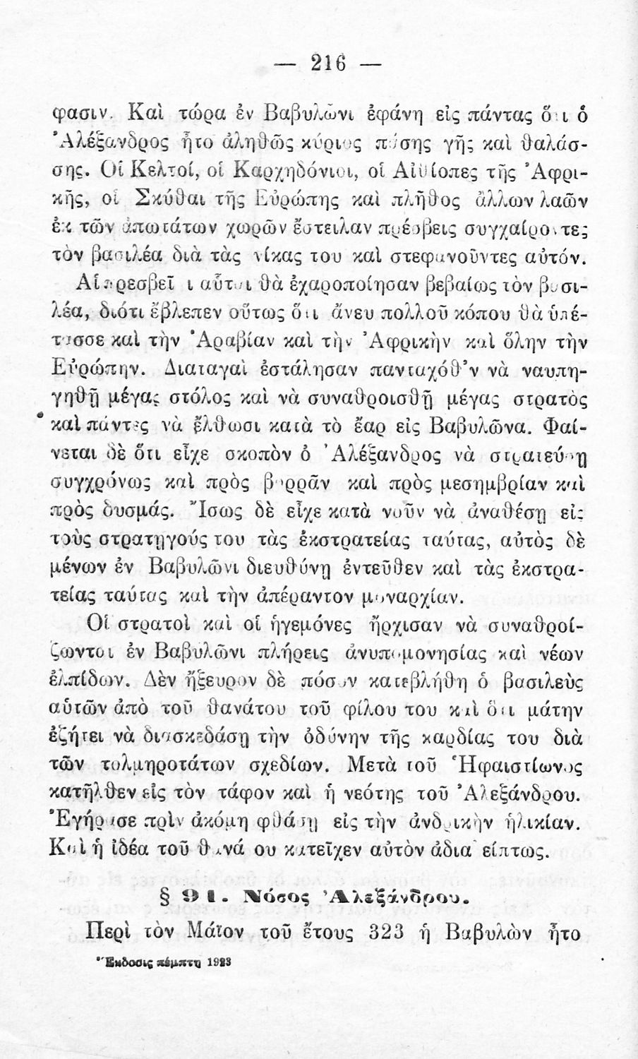 Αναγνωστικό Ε' Δημοτικού που εξιστορεί τη ζωή και το έργο του Μ. Αλεξάνδρου. Προοριζόταν, όπως αναφέρει η έκθεση των κριτών, να εμπνεύσει "φρονήματα υψηλά και γενναία και να υποθάλψη το συναίσθημα της φιλοπατρίας" στους μαθητές. Περιέχει και ποιήματα πατριωτικού και θρησκευτικού περιεχομένου.