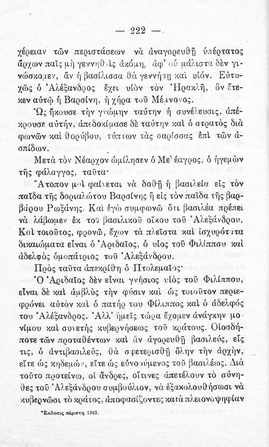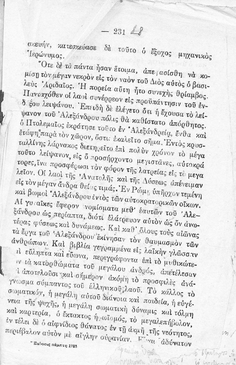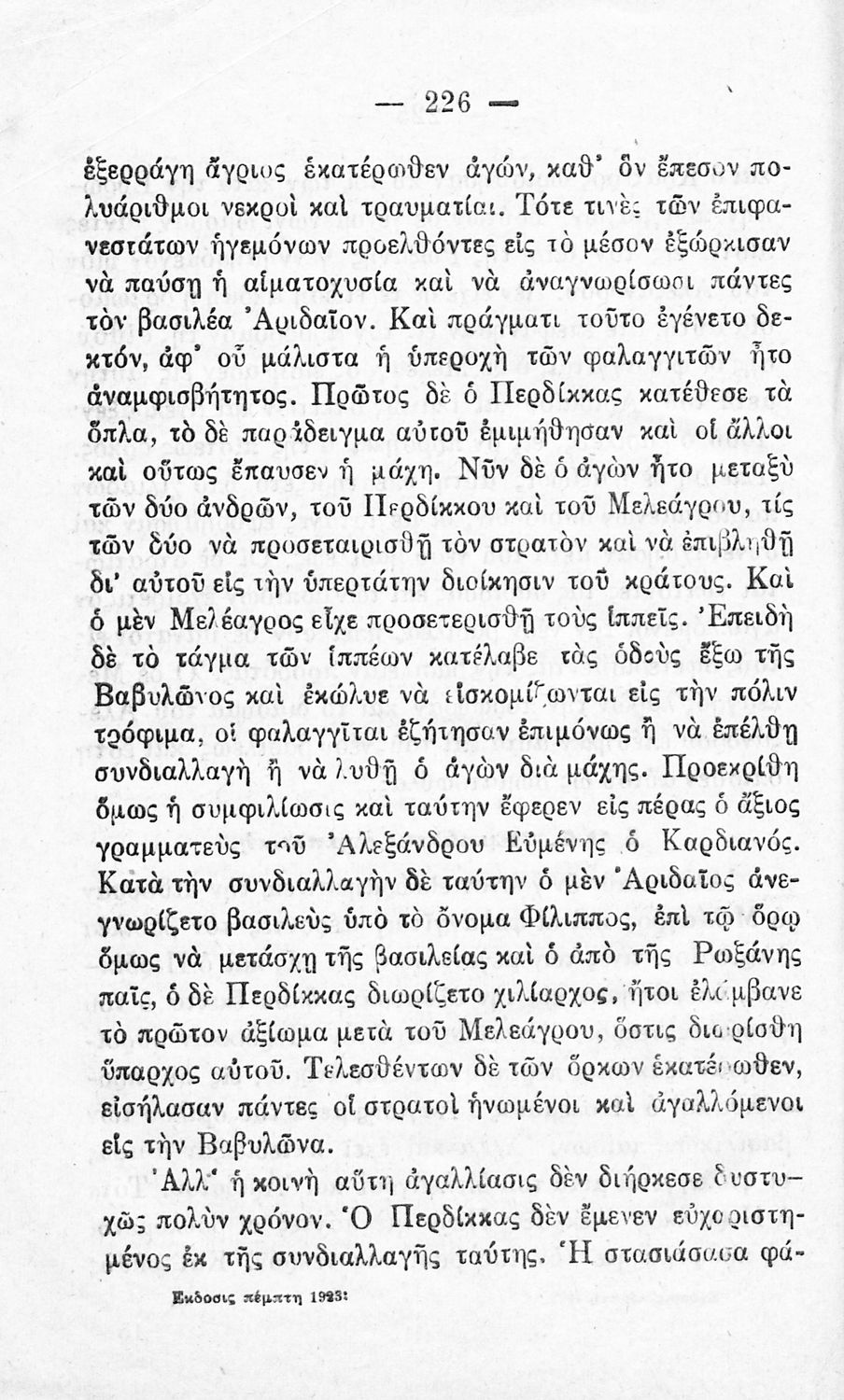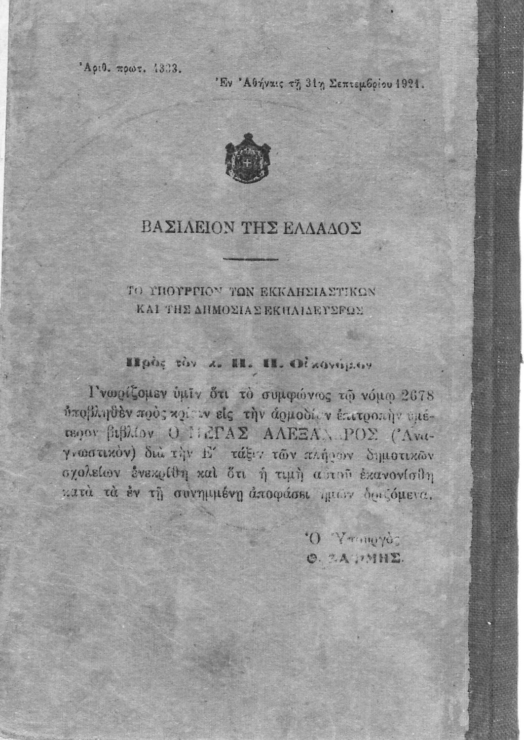 Αναγνωστικό Ε' Δημοτικού που εξιστορεί τη ζωή και το έργο του Μ. Αλεξάνδρου. Προοριζόταν, όπως αναφέρει η έκθεση των κριτών, να εμπνεύσει "φρονήματα υψηλά και γενναία και να υποθάλψη το συναίσθημα της ...
