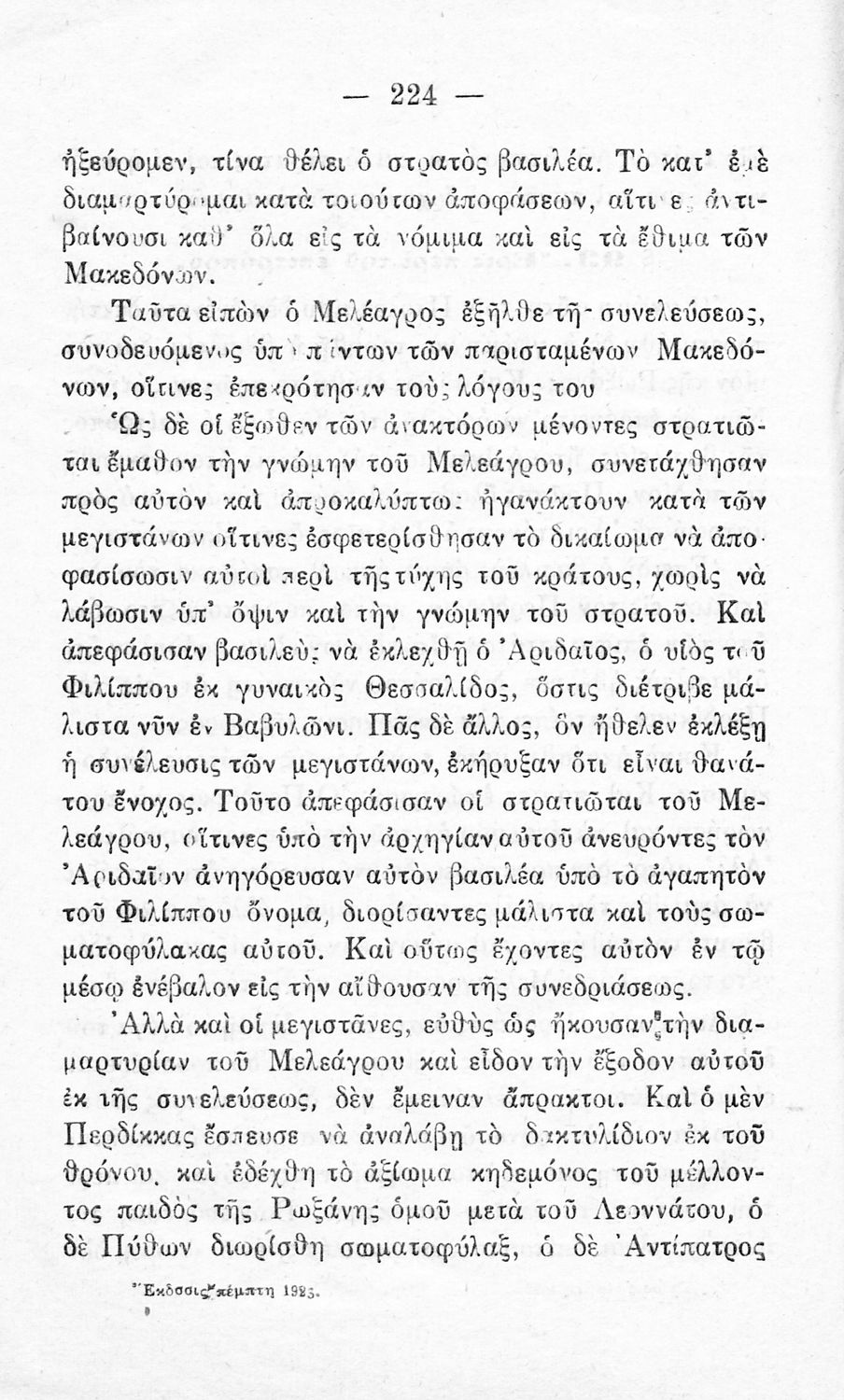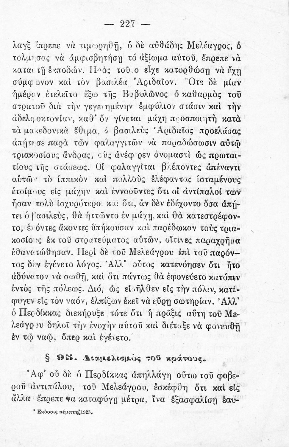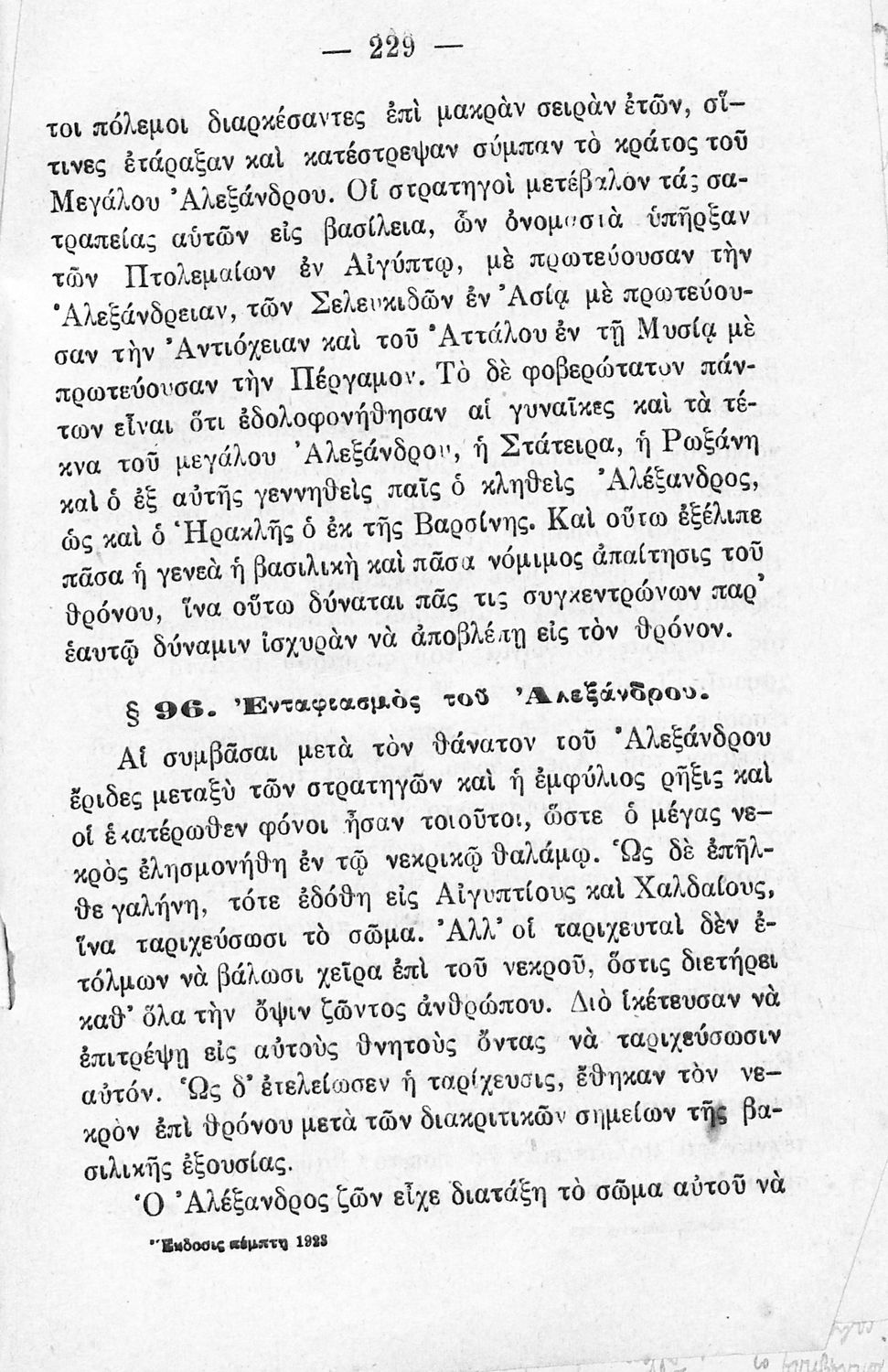 Αναγνωστικό Ε' Δημοτικού που εξιστορεί τη ζωή και το έργο του Μ. Αλεξάνδρου. Προοριζόταν, όπως αναφέρει η έκθεση των κριτών, να εμπνεύσει "φρονήματα υψηλά και γενναία και να υποθάλψη το συναίσθημα της φιλοπατρίας" στους μαθητές. Περιέχει και ποιήματα πατριωτικού και θρησκευτικού περιεχομένου.