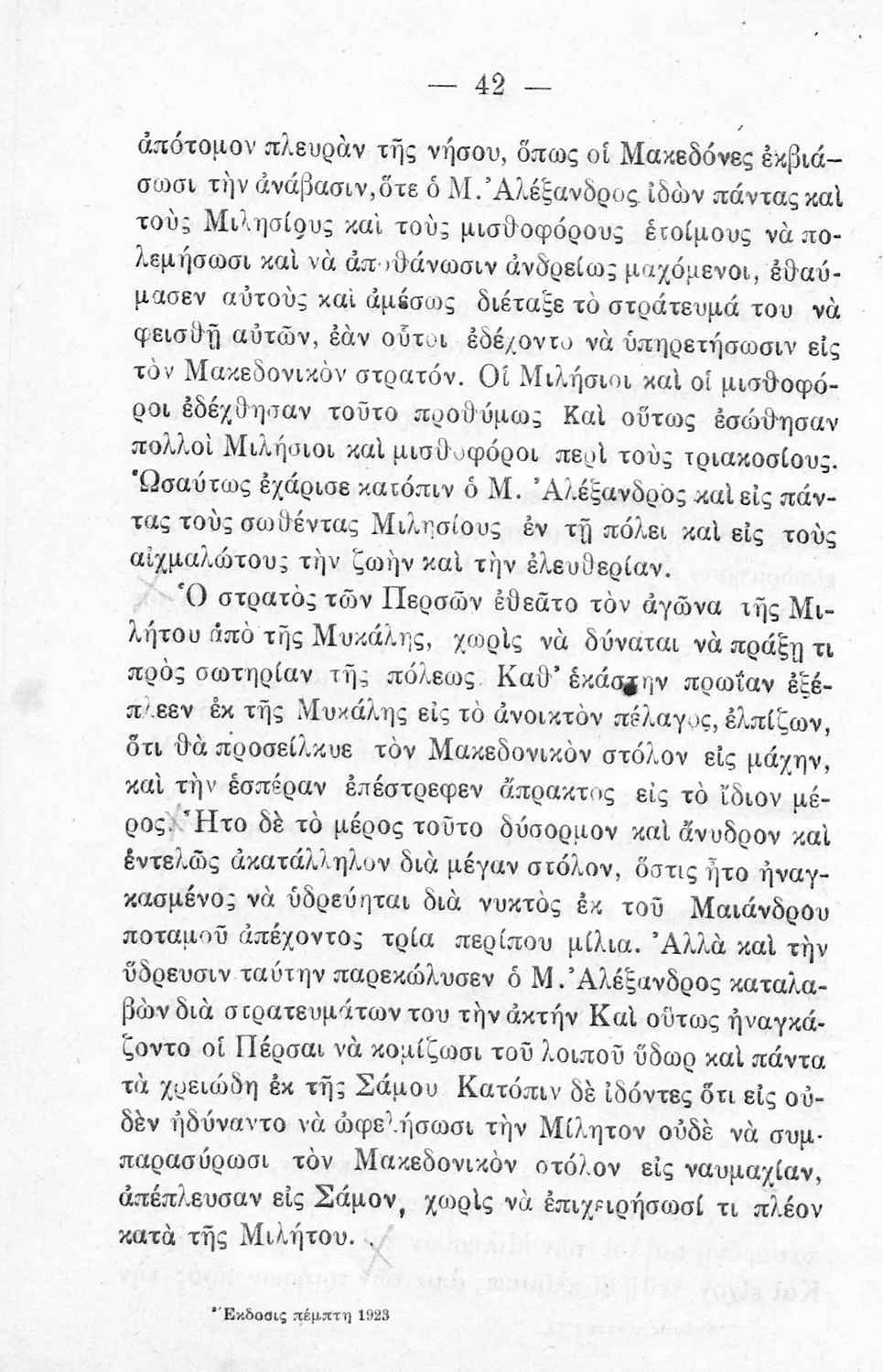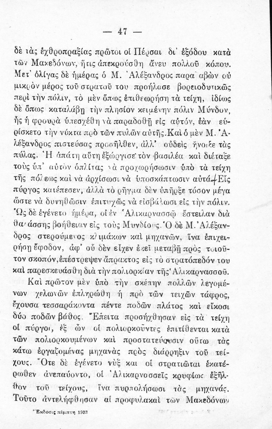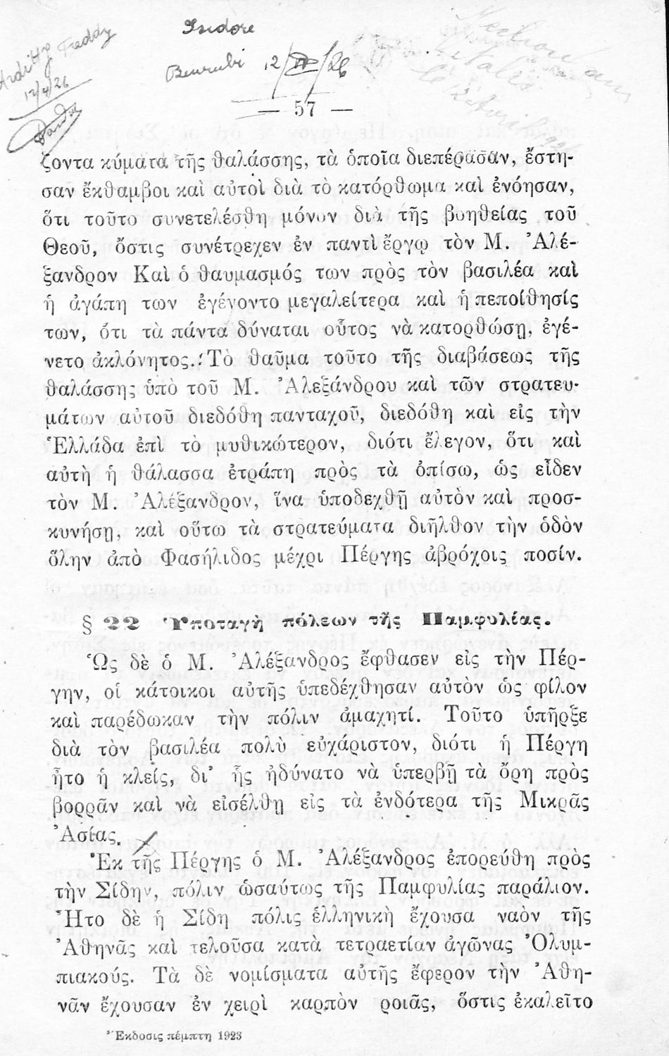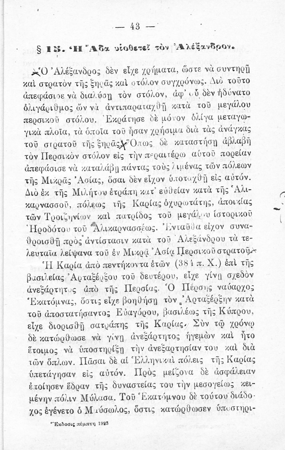 Αναγνωστικό για την Ε΄ Δημοτικού που εξιστορεί την ιστορία του Μεγάλου Αλεξάνδρου με σκοπό να εξυψώσει το φρόνημα των Ελλήνων, που έχει "πληγεί από τη Μικρασιατική καταστροφή", και να τους δώσει "παρηγοριά και