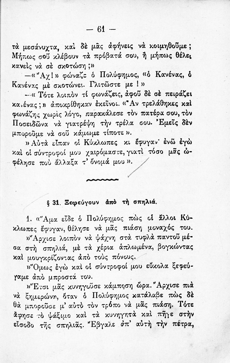 Κωδικός αναγνώρισης: 01-45112 Τίτλος: Οδύσσεια Διασκευή, Αναγνωστικό Γ΄ Δημοτικού Συγγραφέας: Δημοσθένης Μ. Ανδρεάδης Εικονογράφος: Π. Ρούμπος, Αλφρ. Ρέντζ, Φ. Πρέλλερ Μέγεθος και υπόστρωμα: Σχολικό εγχειρίδιο, 20εκ., σκληρό εξώφυλλο, 222 σελίδες. Εικόνες (ασπρόμαυρες), σκίτσα (ασπρόμαυρα). |