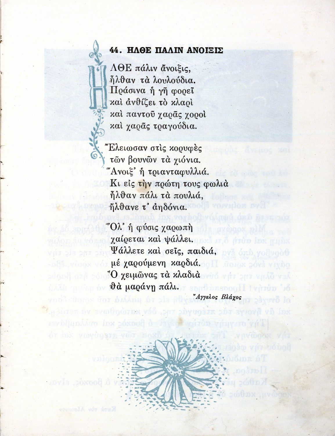 Αναγνωστικό Δ' Δημοτικού που είναι χωρισμένο σύμφωνα με τις εποχές του χρόνου και περιλαμβάνει ποιήματα και πεζά εμπνευσμένα από τη ζωή στην ύπαιθρο, την εθνική, οικογενειακή και κοινωνική ζωή, τη θρησκευτική παράδοση, τις ασχολίες των ανθρώπων, και την ελληνική φύση, ιστορία και μυθολογία.