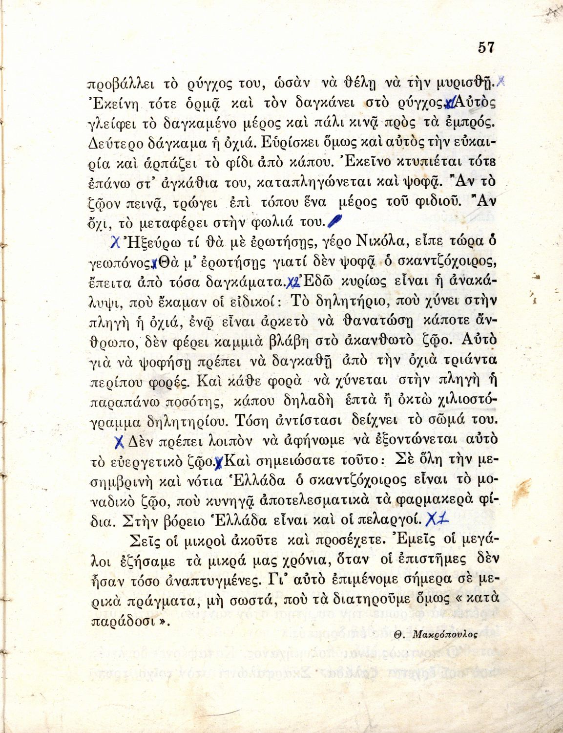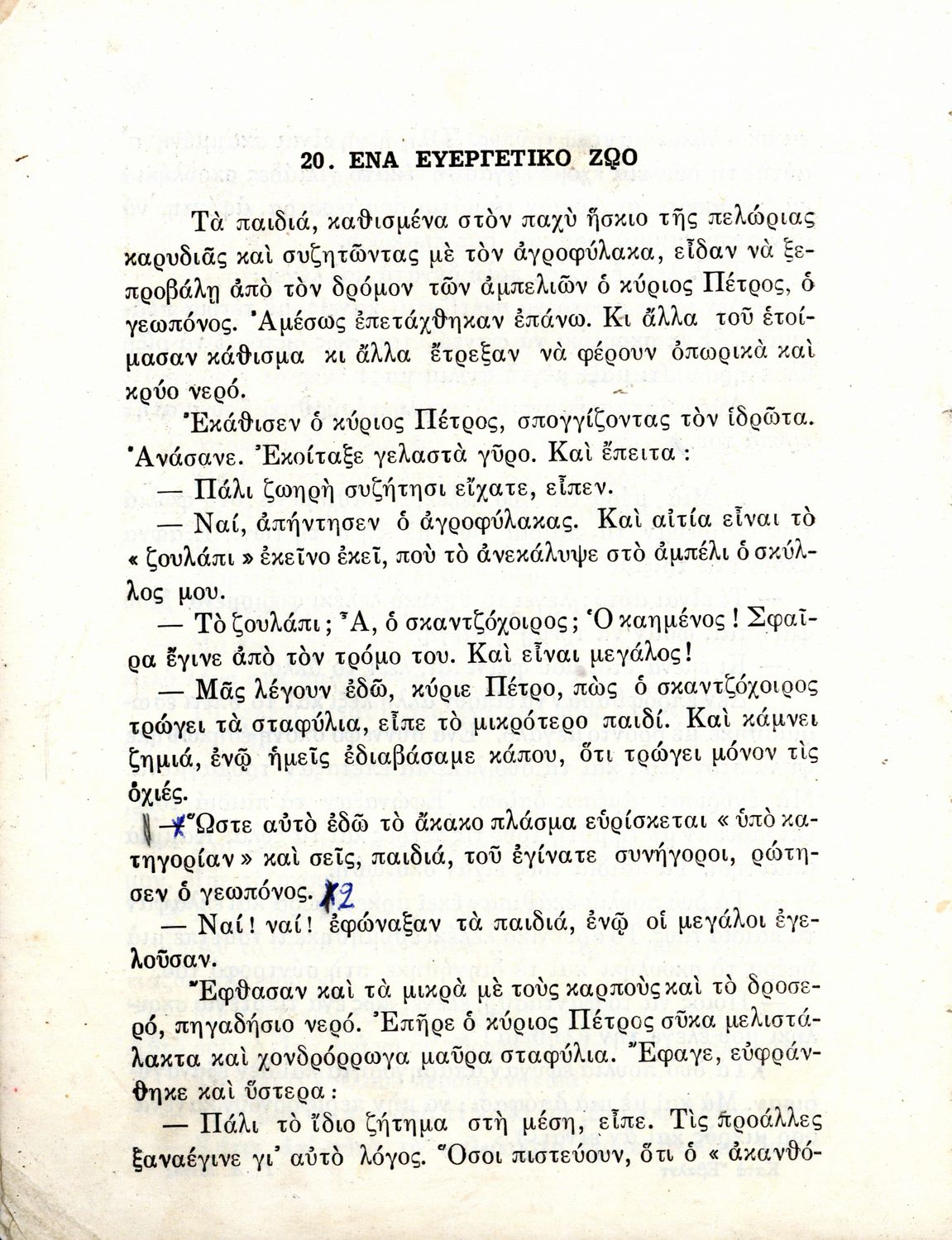 Βαθμίδα εκπαίδευσης: Πρωτοβάθμια Τάξη: Δ' Δημοτικού Μάθημα: Νέα Ελληνικά Γλώσσα: Δημοτική, Καθαρεύουσα Παρουσίαση περιεχομένου: Αναγνωστικό Δ' Δημοτικού που είναι χωρισμένο σύμφωνα με τις εποχές του χρόνου και περιλαμβάνει ποιήματα και πεζά εμπνευσμένα από τη ζωή στην ύπαιθρο, την εθνική, οικογενειακή και κοινωνική ζωή, τη θρησκευτική παράδοση, τις ασχολίες των ανθρώπων, και την ελληνική φύση, ιστορία και μυθολογία. |