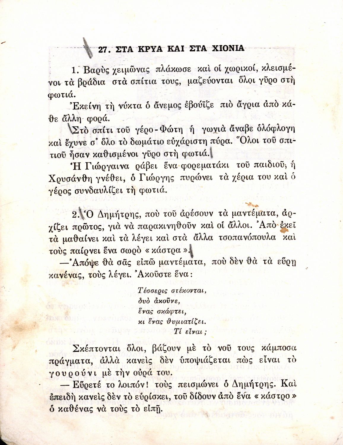 Βαθμίδα εκπαίδευσης: Πρωτοβάθμια Τάξη: Δ' Δημοτικού Μάθημα: Νέα Ελληνικά Γλώσσα: Δημοτική, Καθαρεύουσα Παρουσίαση περιεχομένου: Αναγνωστικό Δ' Δημοτικού που είναι χωρισμένο σύμφωνα με τις εποχές του χρόνου και περιλαμβάνει ποιήματα και πεζά εμπνευσμένα από τη ζωή στην ύπαιθρο, την εθνική, οικογενειακή και κοινωνική ζωή, τη θρησκευτική παράδοση, τις ασχολίες των ανθρώπων, και την ελληνική φύση, ιστορία και μυθολογία. |
