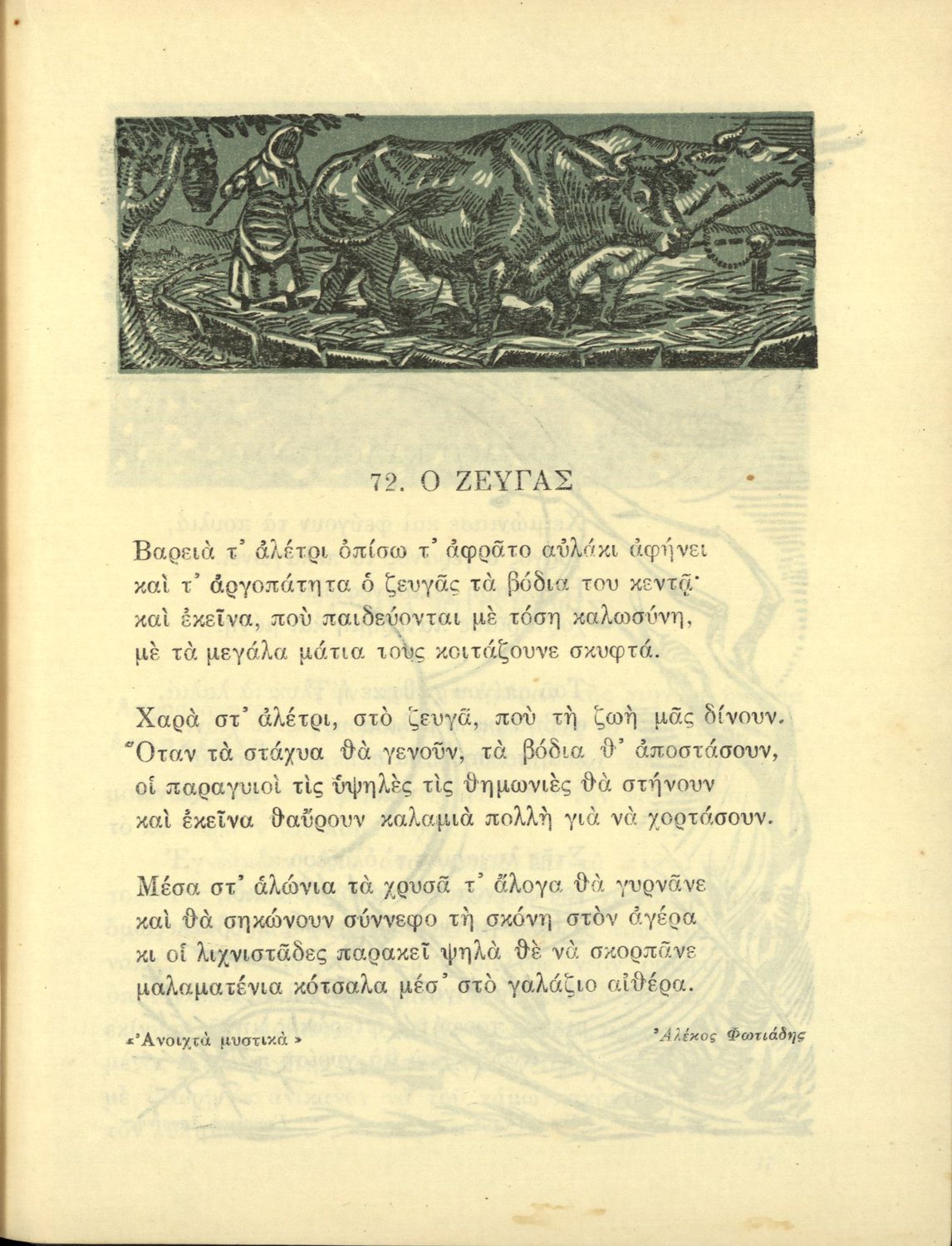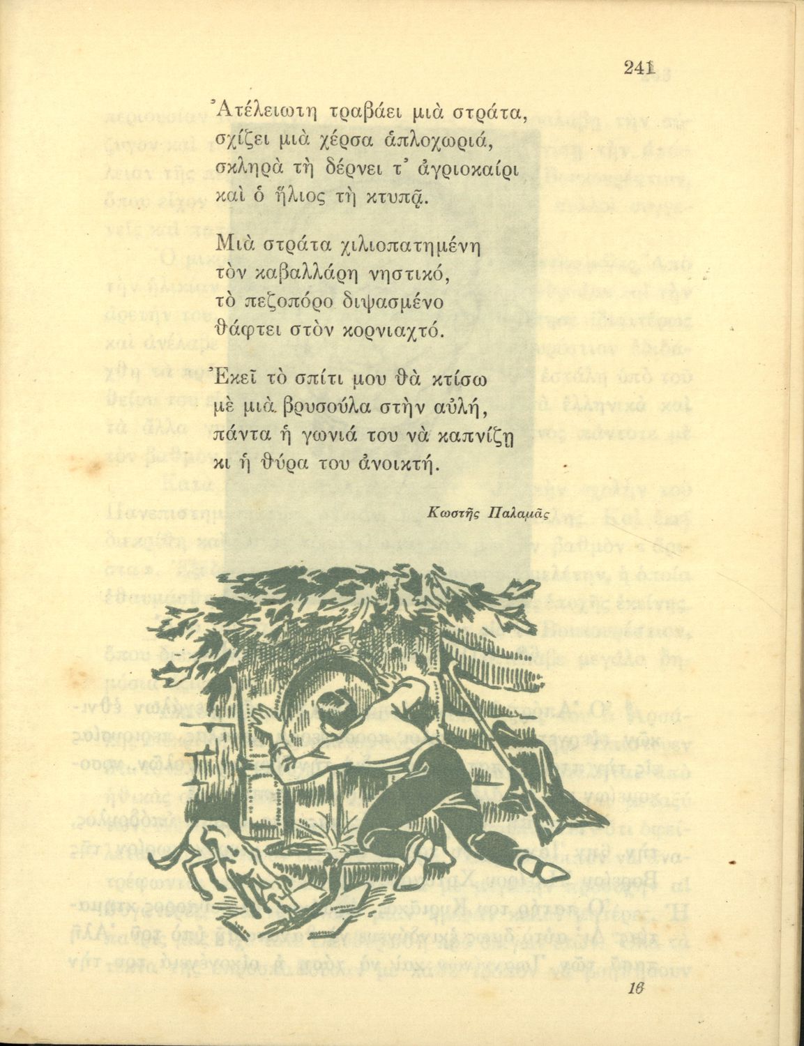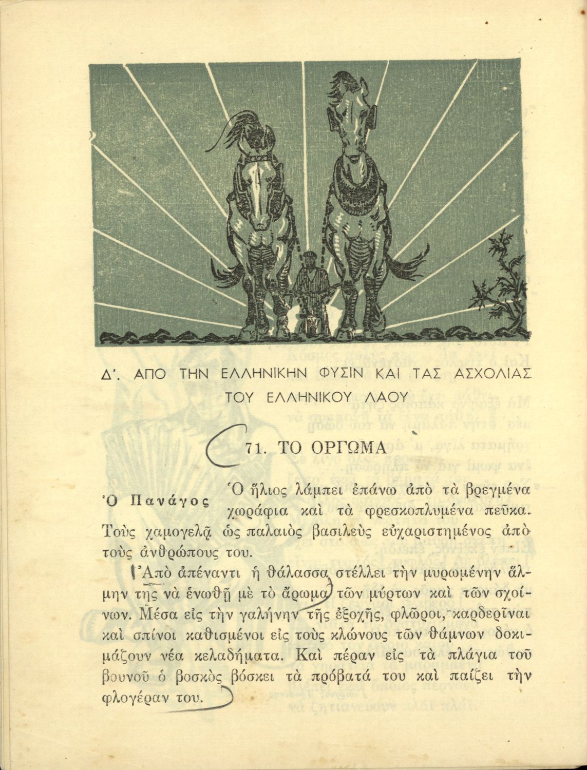 Αναγνωστικό Ε΄ Δημοτικού που περιέχει κείμενα εμπνευσμένα από την εθνική, κοινωνική και οικογενειακή ζωή και την ελληνική φύση, μυθολογία και ιστορία. Φέρει το σύμβολο της δικτατορίας.