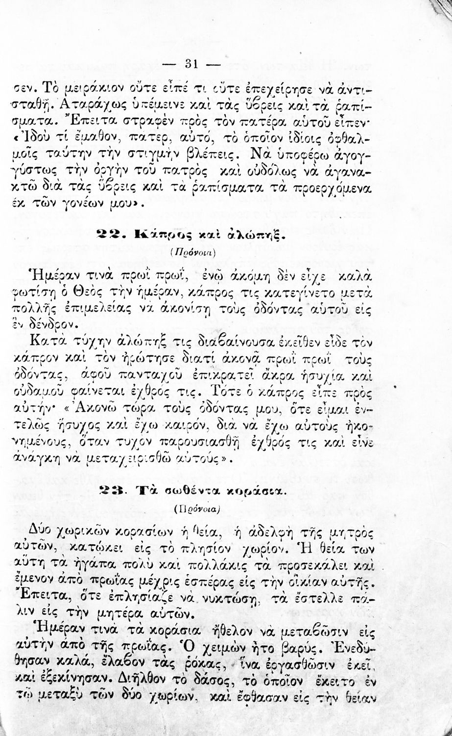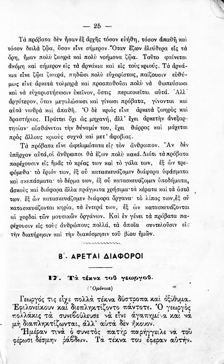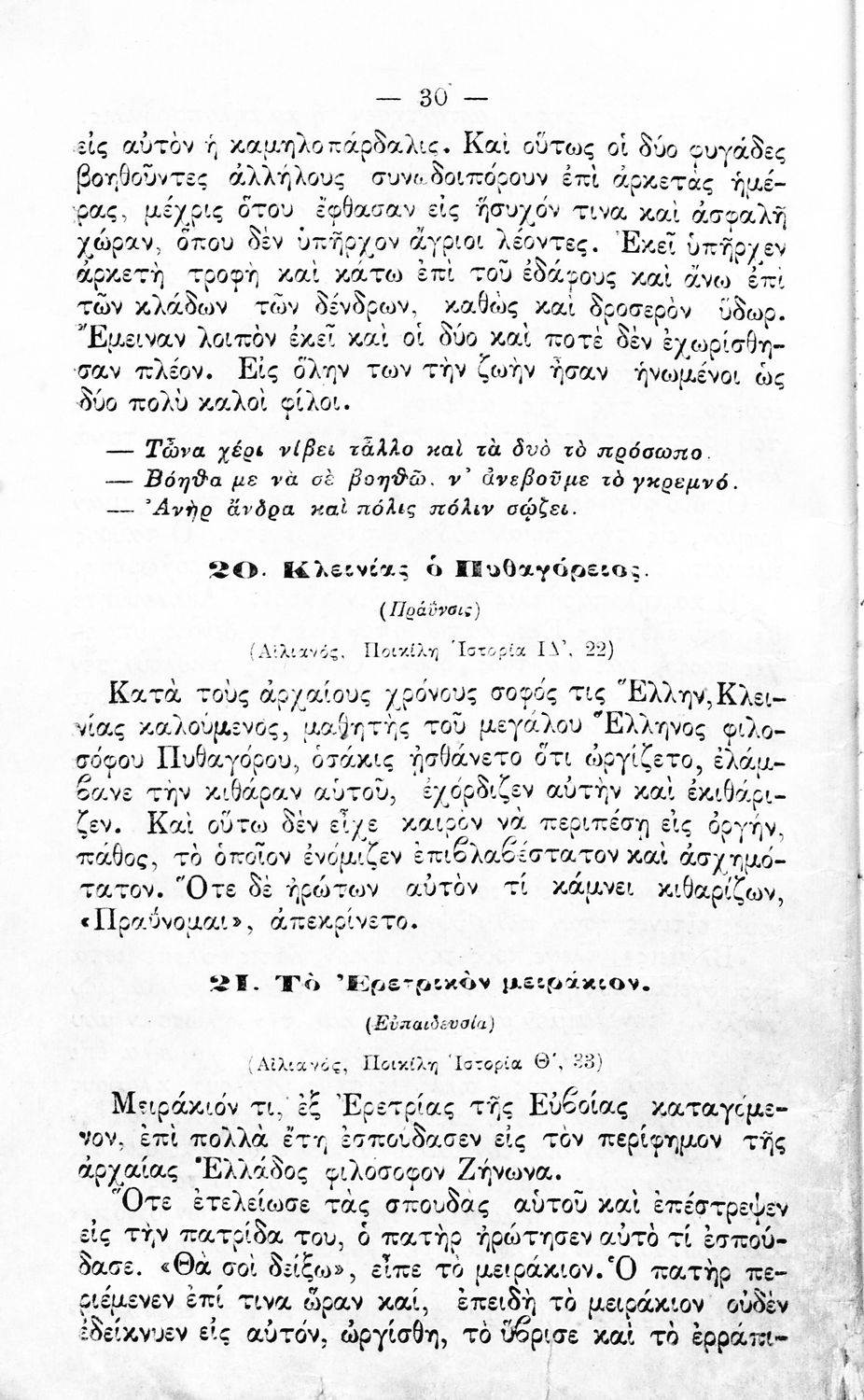 Βαθμίδα εκπαίδευσης: Πρωτοβάθμια Τάξη: Δ' Δημοτικού Μάθημα: Νέα Ελληνικά Γλώσσα: Καθαρεύουσα Παρουσίαση περιεχομένου: Αναγνωστικό Δ' Δημοτικού που περιέχει κείμενα πεζά και ποιήματα τα οποία αντλούν τα θέματά τους από τις ηθικές αξίες, το εθνικό παρελθόν, την οικογενειακή ζωή, την ελληνική φύση και την ελληνική μυθολογία. |