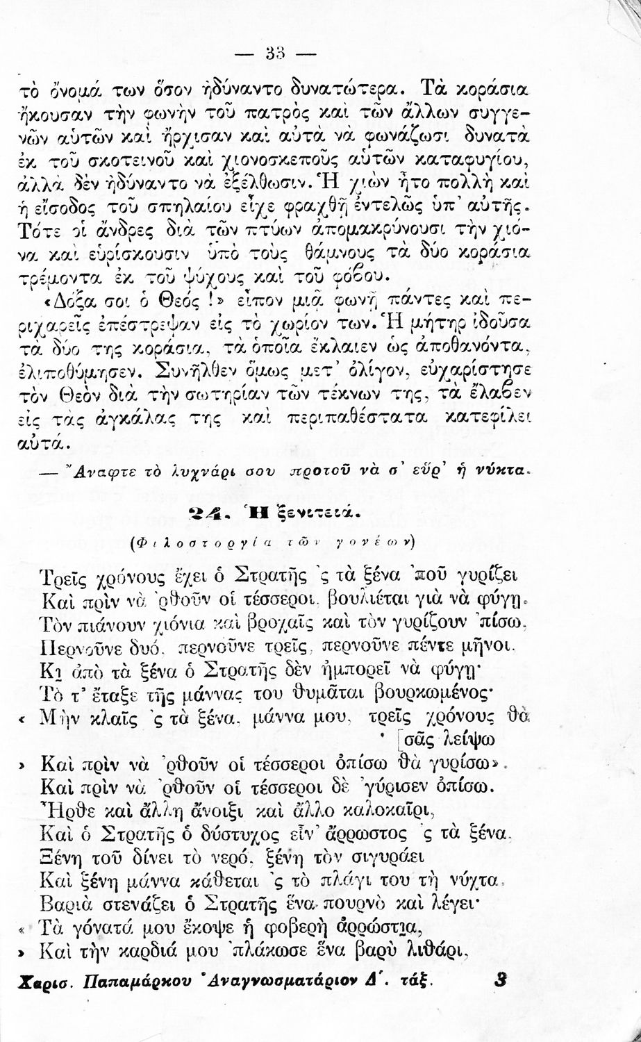 Κωδικός αναγνώρισης: 01-45124 Τίτλος: Ελληνικόν αναγνωσματάριον διά τους μαθητάς της τετάρτης τάξεως των σχολείων της Στοιχειώδους Εκπαιδεύσεως Συγγραφέας: Χαρίσιος Παπαμάρκος Μέγεθος και υπόστρωμα: Σχολικό εγχειρίδιο, 20εκ., σκληρό εξώφυλλο, 192 σελίδες. Σκίτσα (ασπρόμαυρα). |