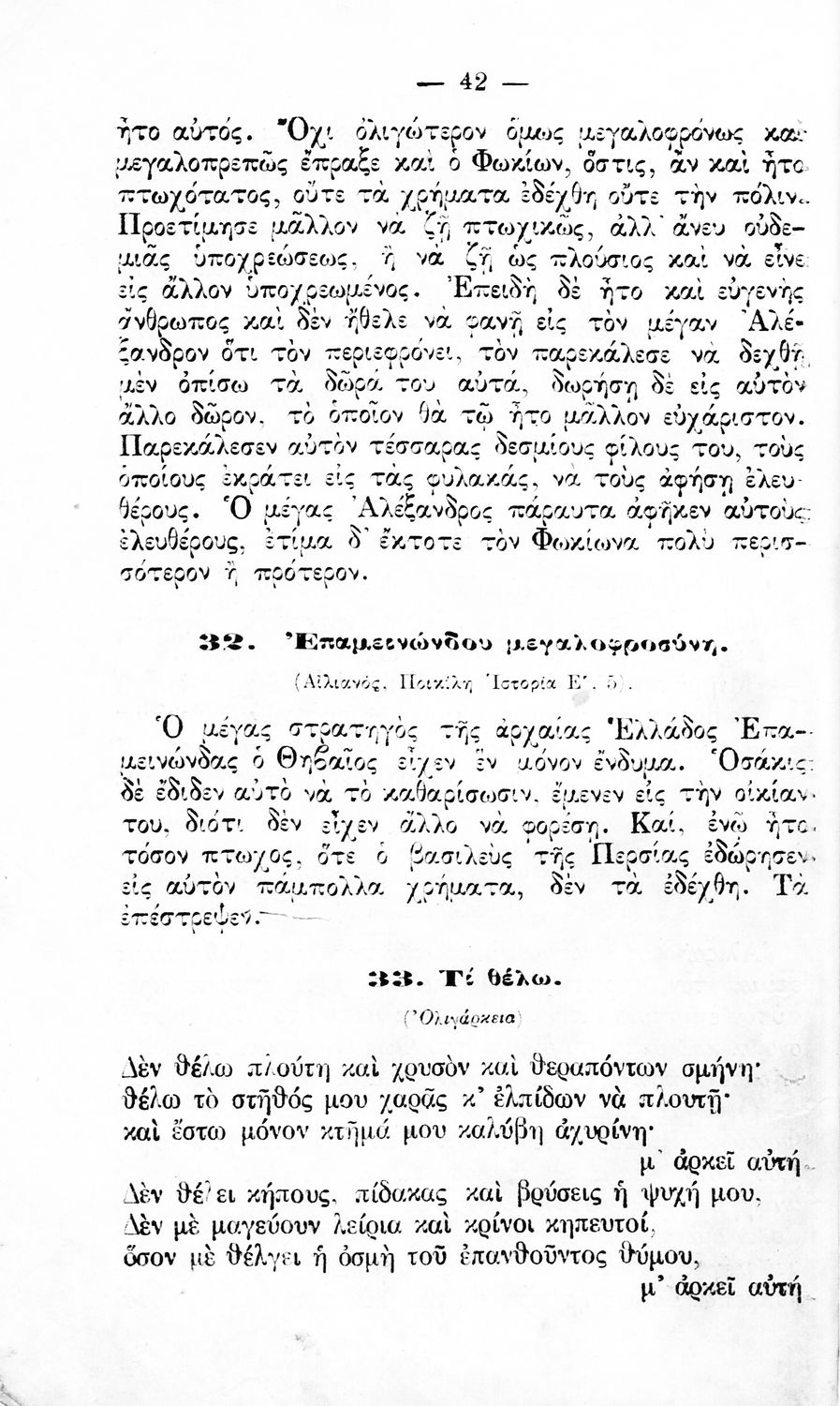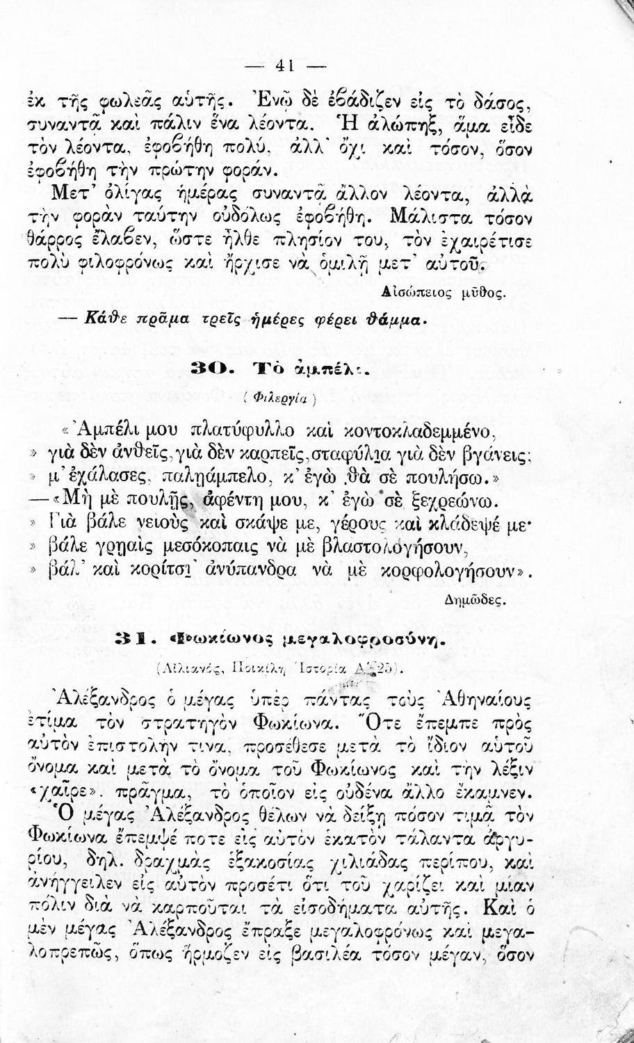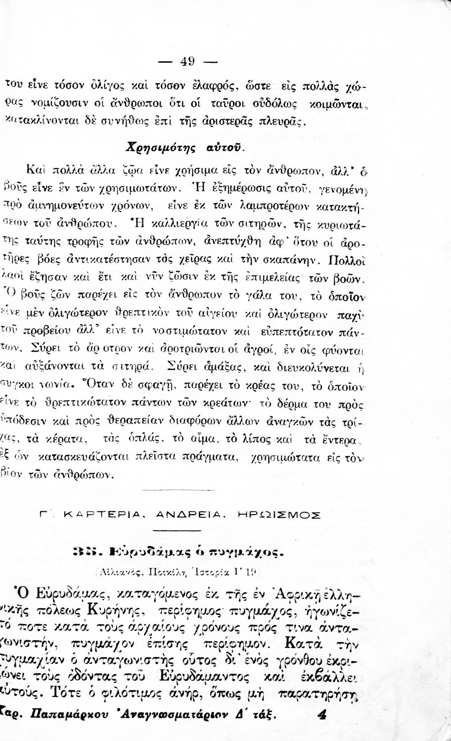Βαθμίδα εκπαίδευσης: Πρωτοβάθμια Τάξη: Δ' Δημοτικού Μάθημα: Νέα Ελληνικά Γλώσσα: Καθαρεύουσα Παρουσίαση περιεχομένου: Αναγνωστικό Δ' Δημοτικού που περιέχει κείμενα πεζά και ποιήματα τα οποία αντλούν τα θέματά τους από τις ηθικές αξίες, το εθνικό παρελθόν, την οικογενειακή ζωή, την ελληνική φύση και την ελληνική μυθολογία. |