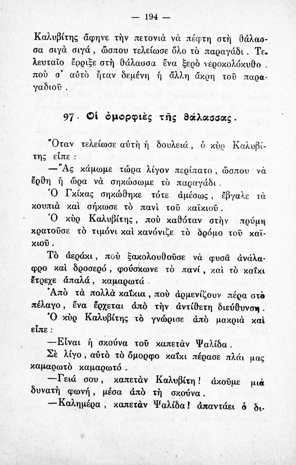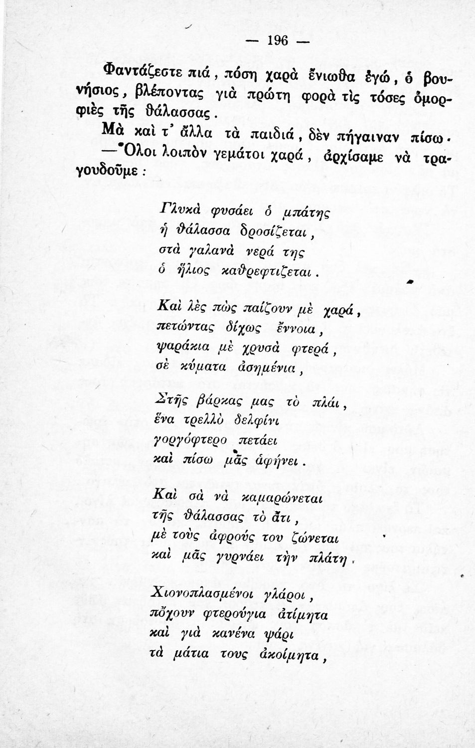 Αναγνωστικό για την Δ΄ τάξη του Δημοτικού. Περιλαμβάνει ένα κείμενο στο οποίο παρεμβάλλονται ποιήματα δημοτικά και Ελλήνων ποιητών.