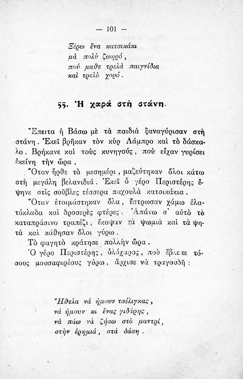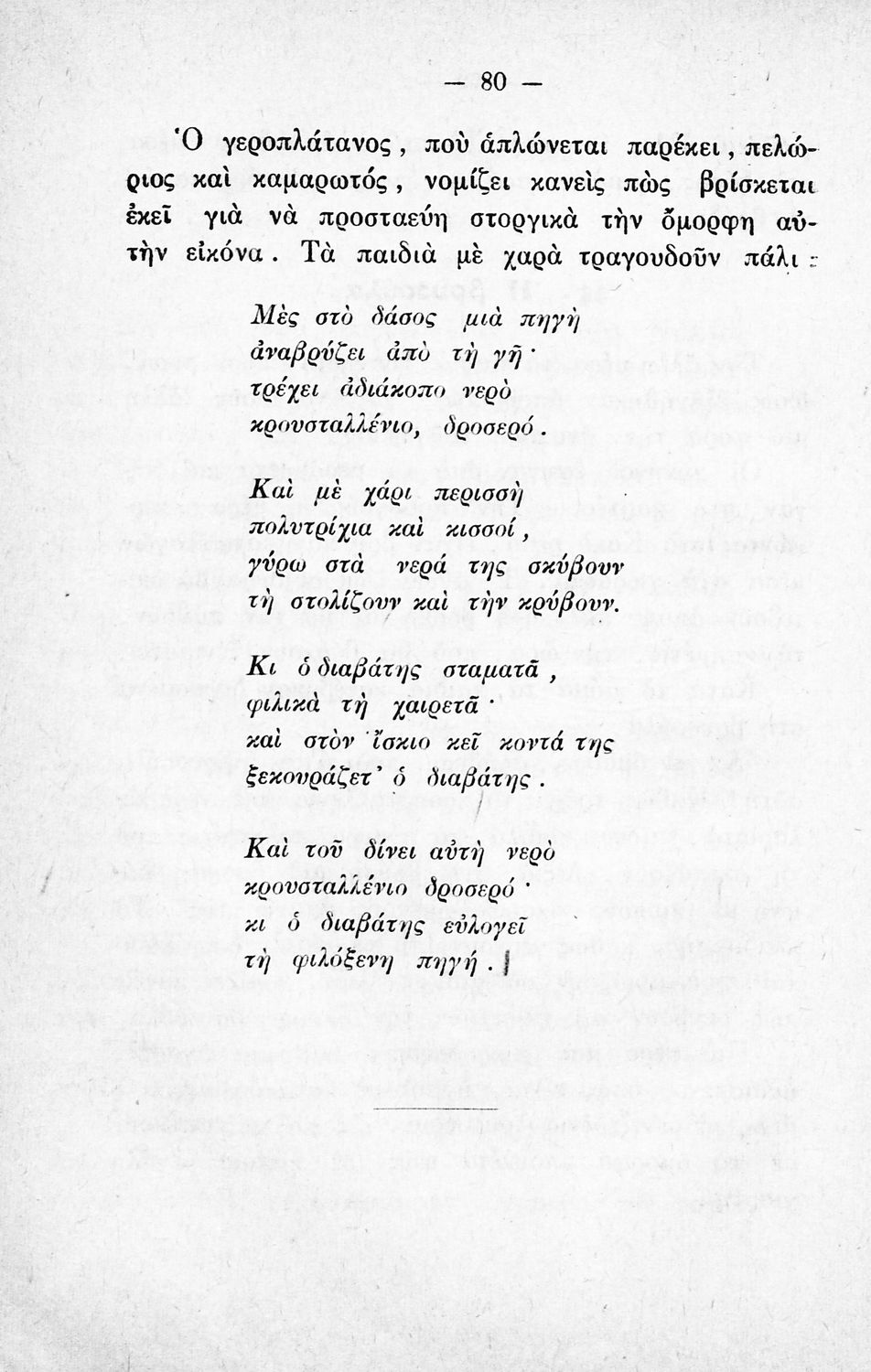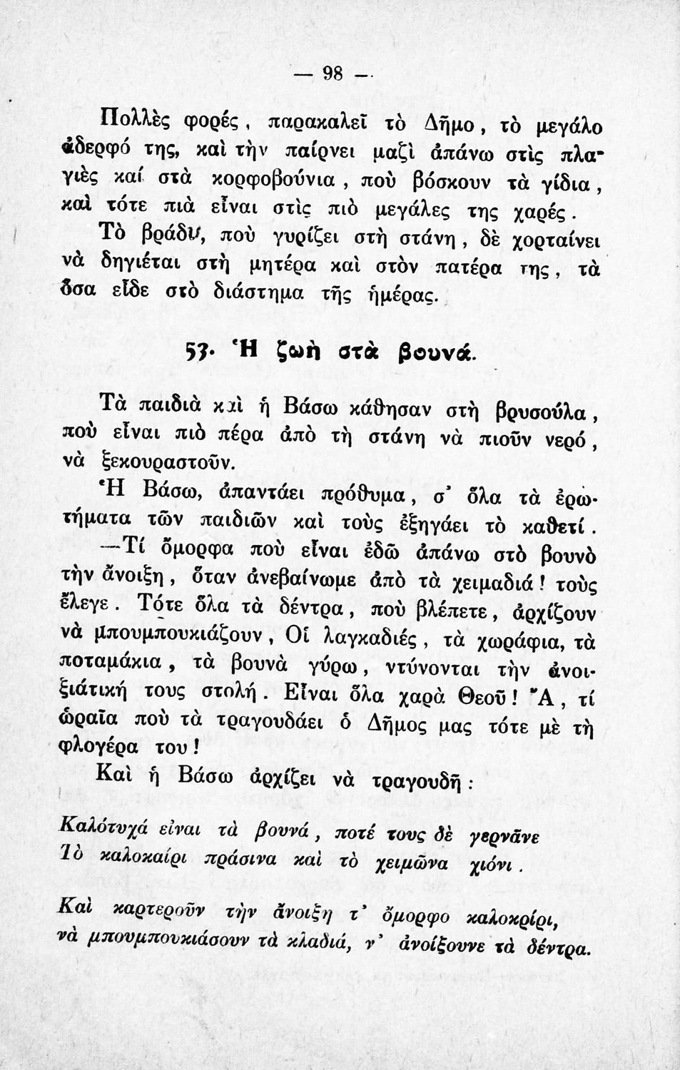 Αναγνωστικό για την Δ΄ τάξη του Δημοτικού. Περιλαμβάνει ένα κείμενο στο οποίο παρεμβάλλονται ποιήματα δημοτικά και Ελλήνων ποιητών.