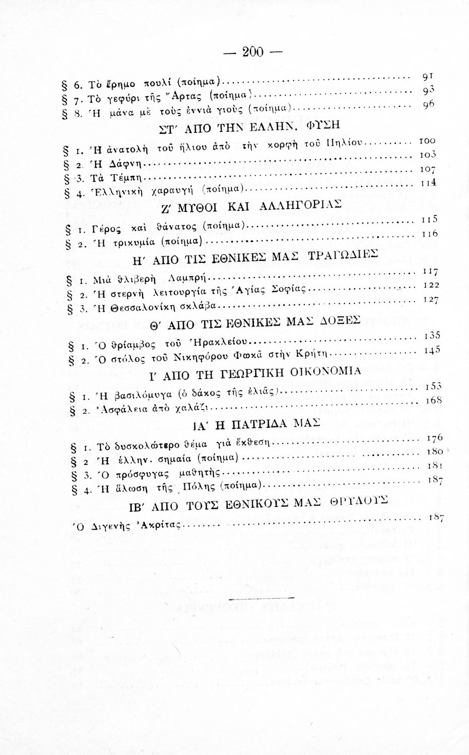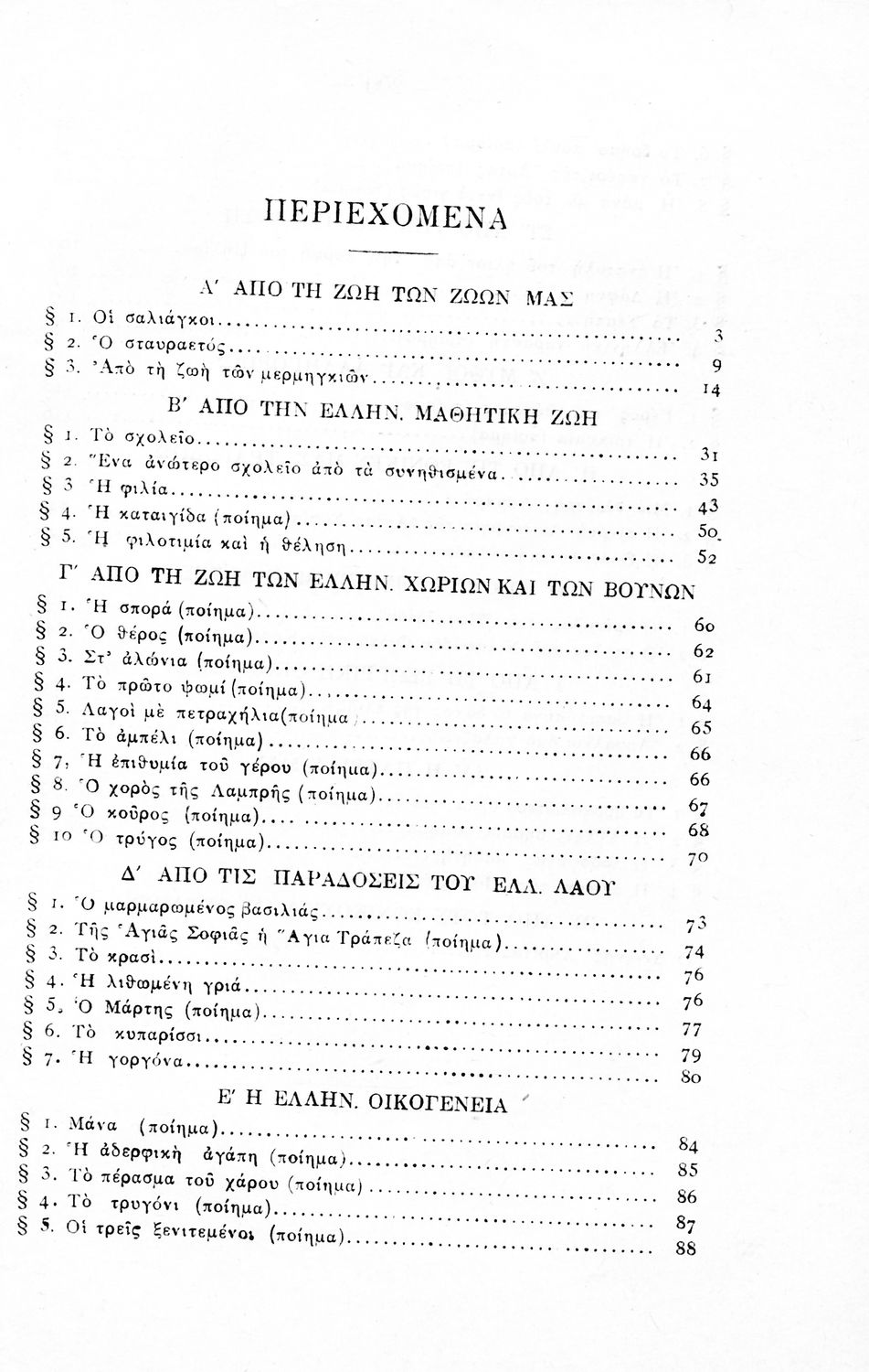 Αναγνωστικό Ε΄ Δημοτικού που περιλαμβάνει πεζά και ποιήματα Ελλήνων λογοτεχνών με θέματα από την καθημερινή και οικογενειακή ζωή, τις "εθνικές τραγωδίες και δόξες" και την ελληνική φύση.
