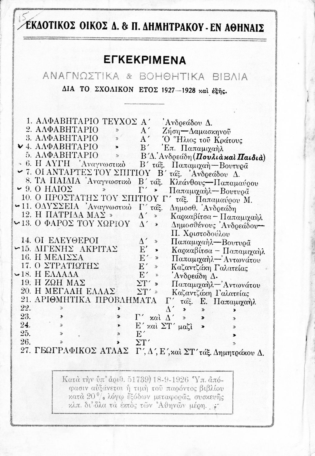 Αναγνωστικό Ε΄ Δημοτικού που περιέχει κείμενα εμπνευσμένα από την εθνική, κοινωνική και οικογενειακή ζωή και την ελληνική φύση, μυθολογία και ιστορία. Φέρει το σύμβολο της δικτατορίας.
