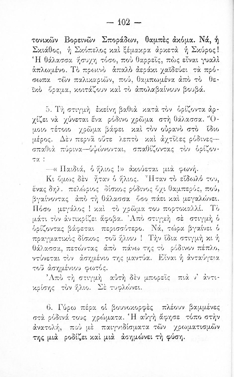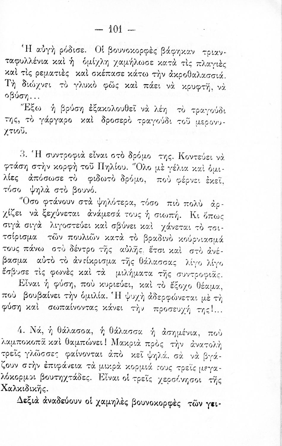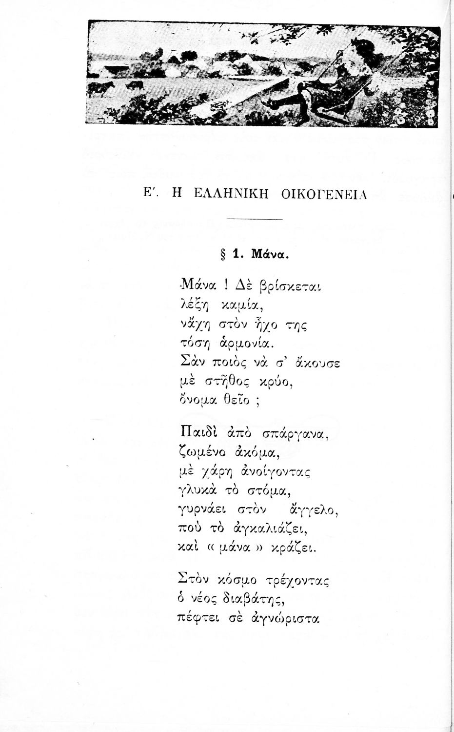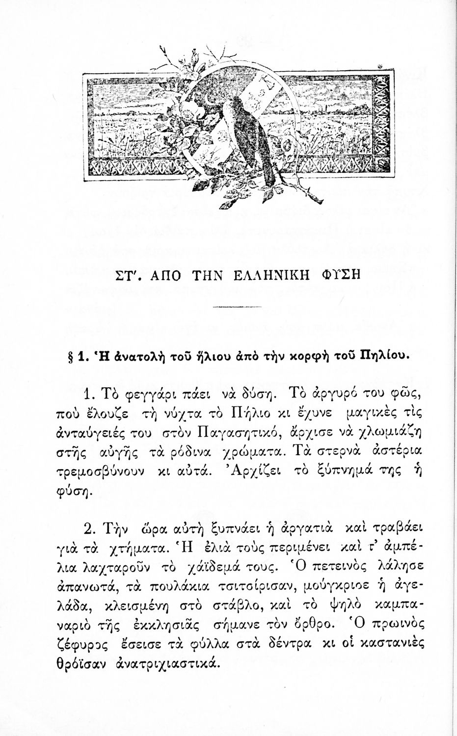 Αναγνωστικό Ε΄ Δημοτικού που περιλαμβάνει πεζά και ποιήματα Ελλήνων λογοτεχνών με θέματα από την καθημερινή και οικογενειακή ζωή, τις "εθνικές τραγωδίες και δόξες" και την ελληνική φύση.