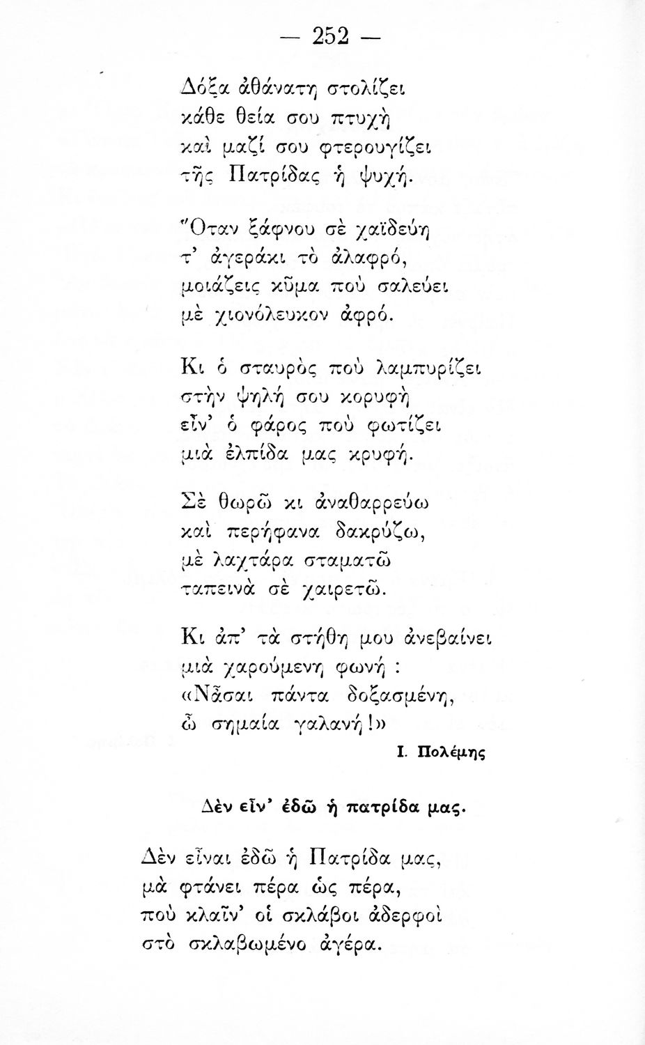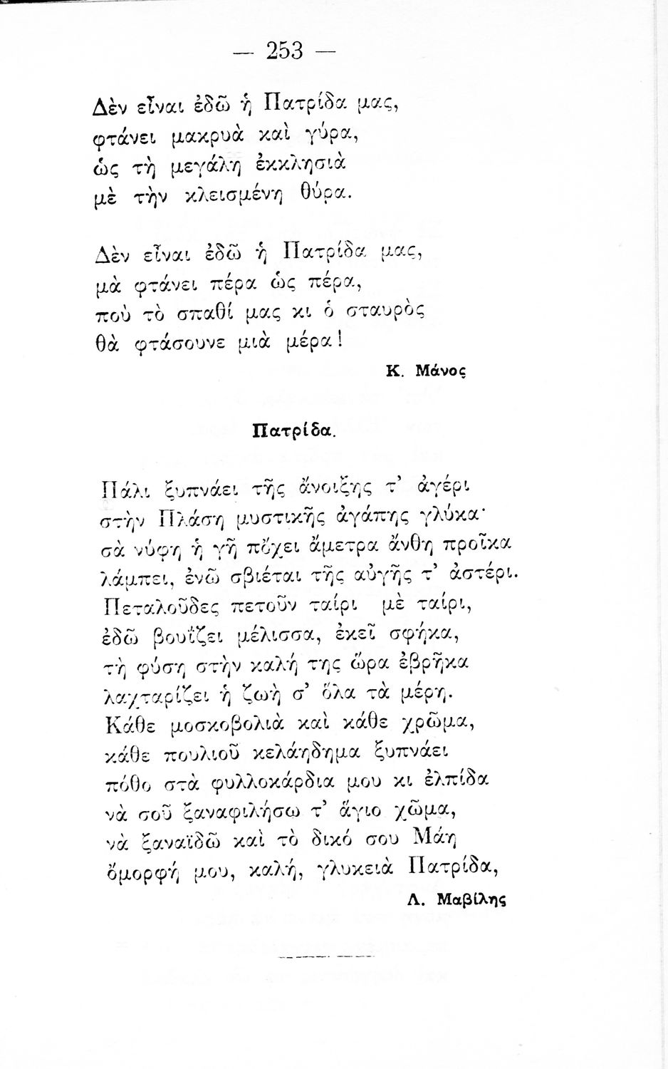 Αναγνωστικό ΣΤ΄ Δημοτικού που περιλαμβάνει πεζά και ποιήματα πατριωτικού περιεχομένου εμπνευσμένα, κατά βάση, από την σύγχρονη ελληνική ιστορία και δη την Ελληνική Επανάσταση.