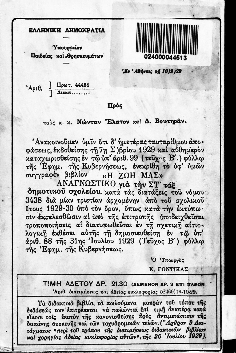Αναγνωστικό της ΣΤ΄ Δημοτικού που κυκλοφόρησε σε 7.000 αντίτυπα 25 ημέρες πριν την 4η Αυγούστου 1936, οπότε κατά την επόμενη σχολική χρονιά διδάχτηκε ελάχιστα και η έκδοσή του με αυτή την μορφή σταμάτησε.