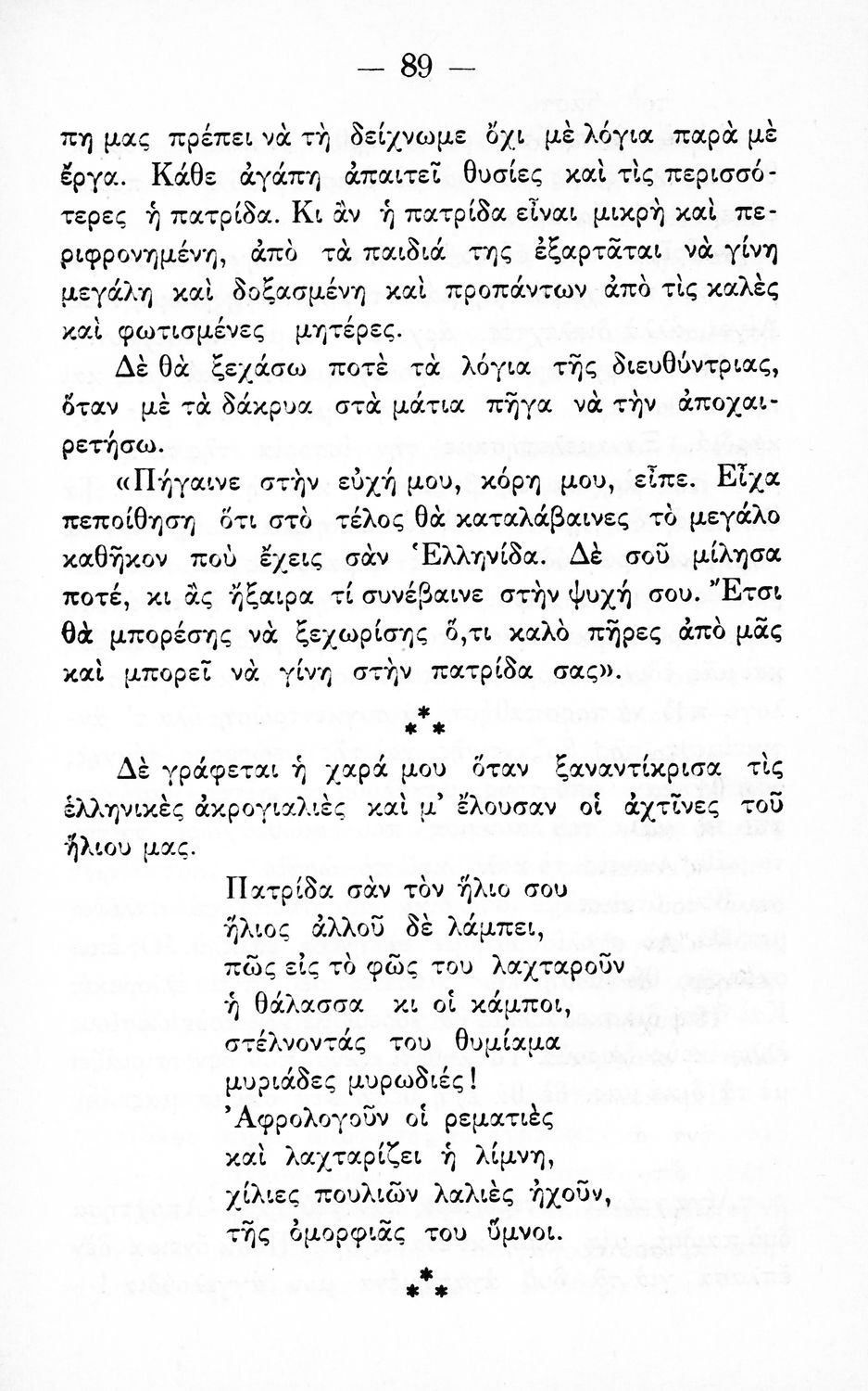 Αναγνωστικό ΣΤ΄ Δημοτικού που περιλαμβάνει πεζά και ποιήματα πατριωτικού περιεχομένου εμπνευσμένα, κατά βάση, από την σύγχρονη ελληνική ιστορία και δη την Ελληνική Επανάσταση.