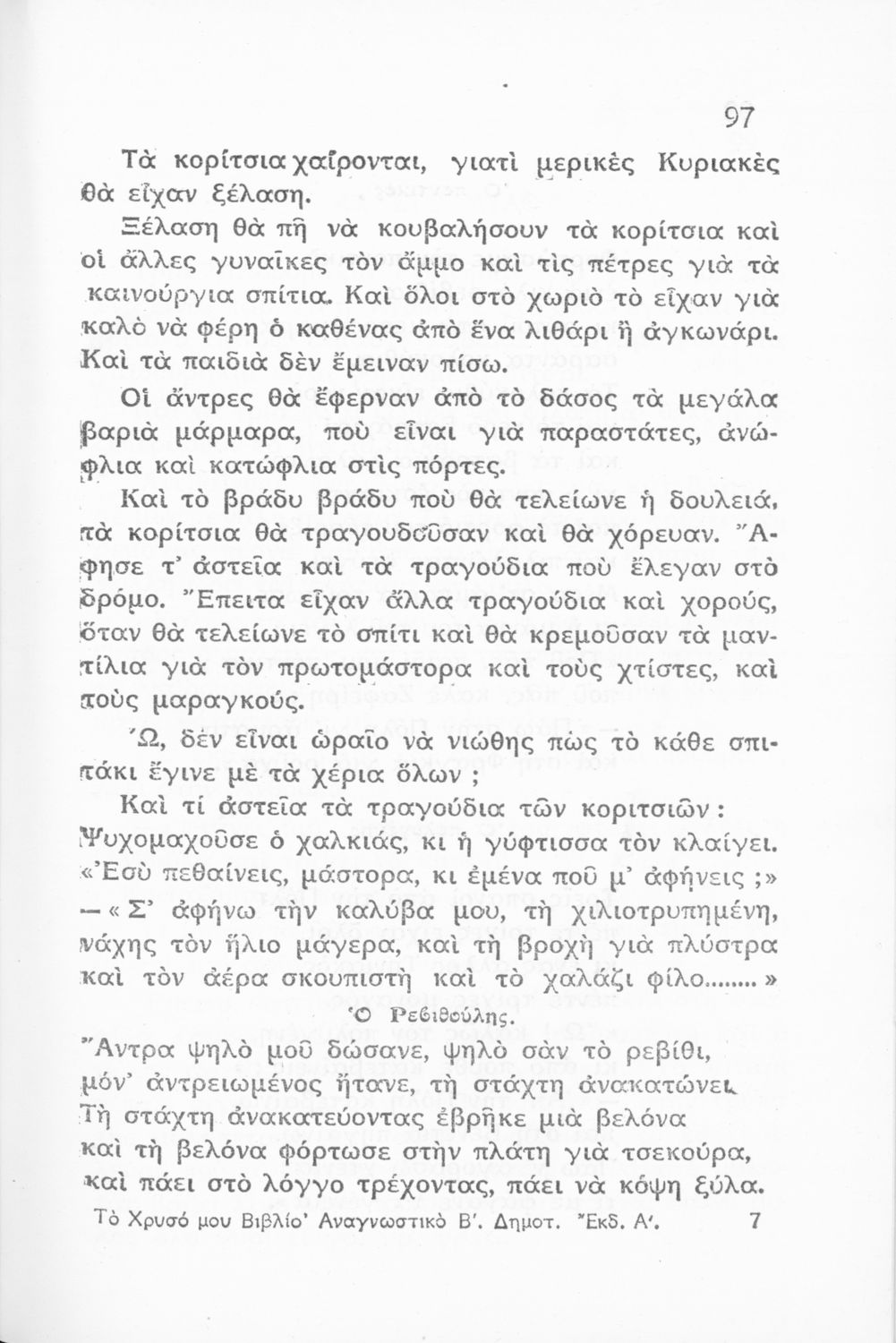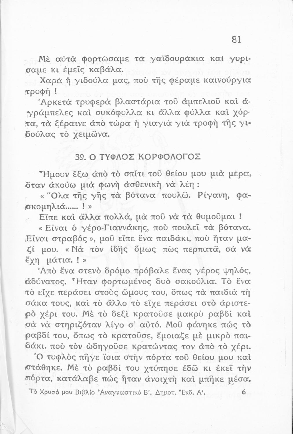 Αναγνωστικό για τη Β΄ Δημοτικού που περιέχει ποιήματα και πεζά που αντλούν τα θέματά τους από τη φύση και την παράδοση της Ελλάδας και την κοινωνική και επαγγελματική ζωή των κατοίκων της.