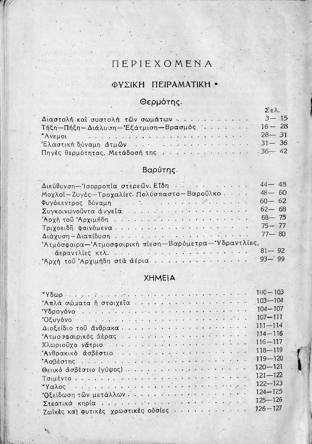 Σχολικό εγχειρίδιο της Ε' Δημοτικού για το μάθημα της Φυσικής . Παρέχει βασικές γνώσεις της φυσικής επιστήμης και της χημείας. Αναλύει τις ιδιότητες των σωμάτων, καθώς και της θερμότητας, του ηλεκτρισμού και του μαγνητισμού, την υδροστατική, την βαρύτητα και την αεροστατική. Από τη χημεία αναφέρει τις ιδιότητες των στοιχείων, των μετάλλων, τις βάσεις, τα οξέα και τα άλατα. Περιέχει εικόνες και σχεδιαγράμματα τα οποία βοηθούν τη διδασκαλία.