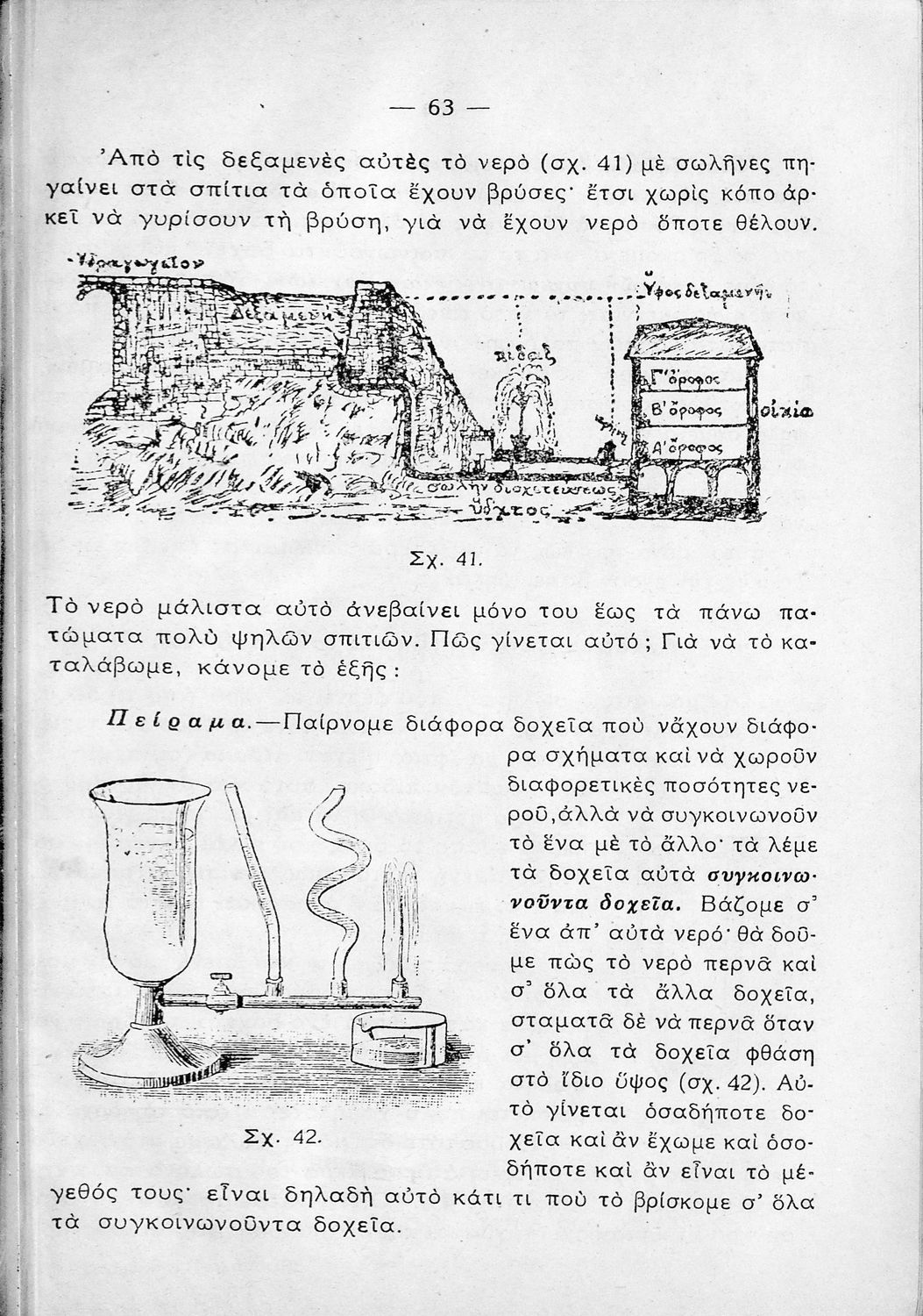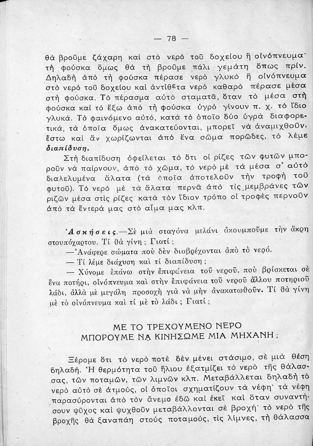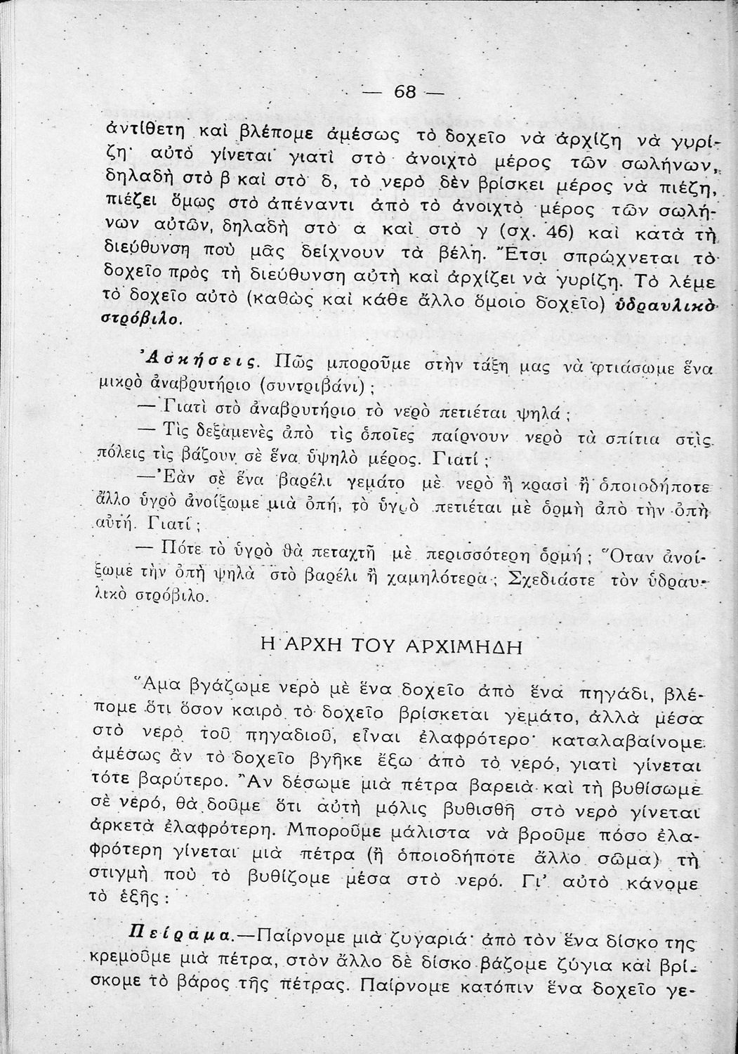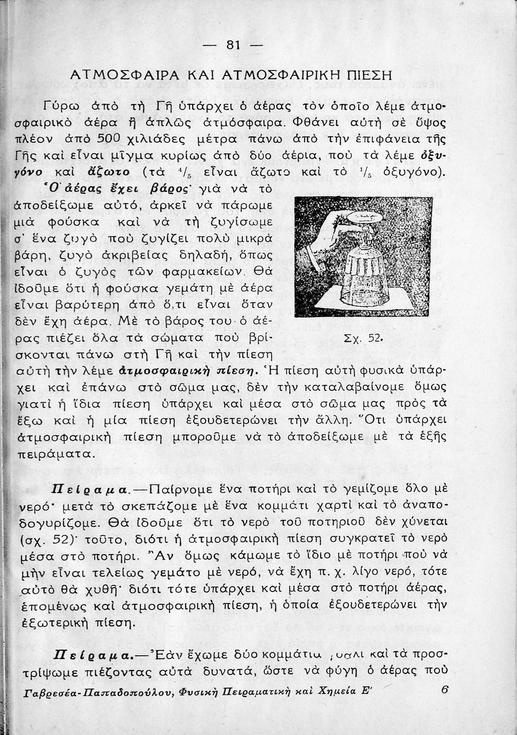 Σχολικό εγχειρίδιο της Ε' Δημοτικού για το μάθημα της Φυσικής . Παρέχει βασικές γνώσεις της φυσικής επιστήμης και της χημείας. Αναλύει τις ιδιότητες των σωμάτων, καθώς και της θερμότητας, του ηλεκτρισμού και του μαγνητισμού, την υδροστατική, την βαρύτητα και την αεροστατική. Από τη χημεία αναφέρει τις ιδιότητες των στοιχείων, των μετάλλων, τις βάσεις, τα οξέα και τα άλατα. Περιέχει εικόνες και σχεδιαγράμματα τα οποία βοηθούν τη διδασκαλία.