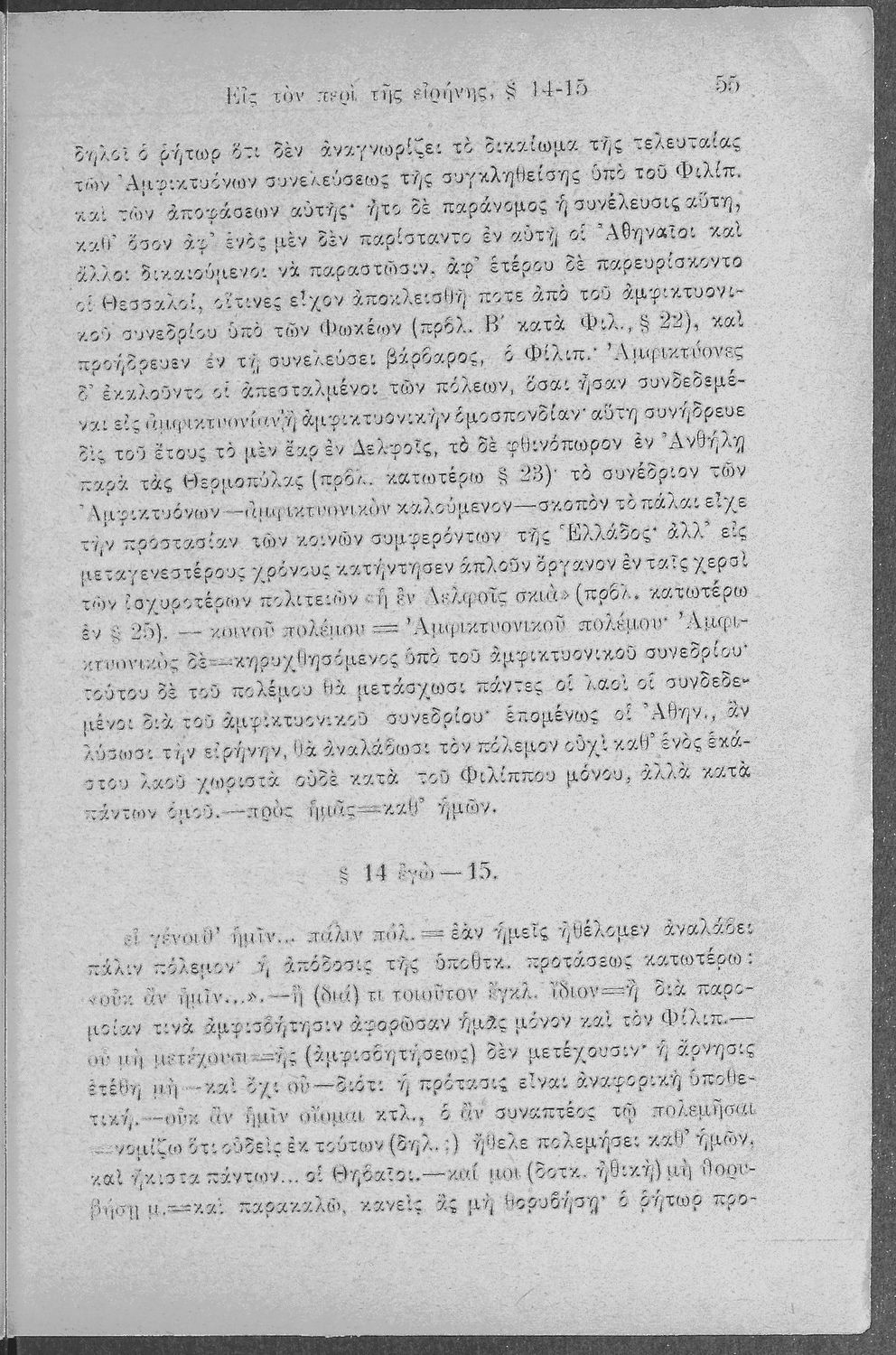 Σχολικό εγχειρίδιο Αρχαίων Ελληνικών Γ΄ Γυμνασίου που περιλαμβάνει τους Λόγους του Δημοσθένη Περί της ειρήνης και Β΄ κατά Φιλίππου, εισαγωγή στη ζωή και το έργο του και ερμηνευτικά και γραμματικά σχόλια.
