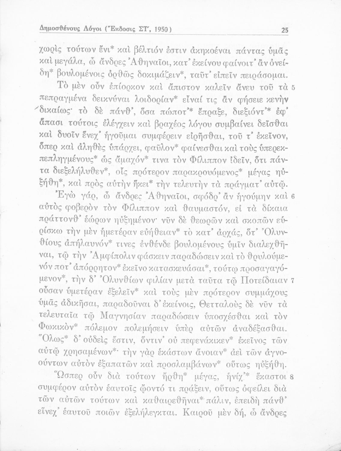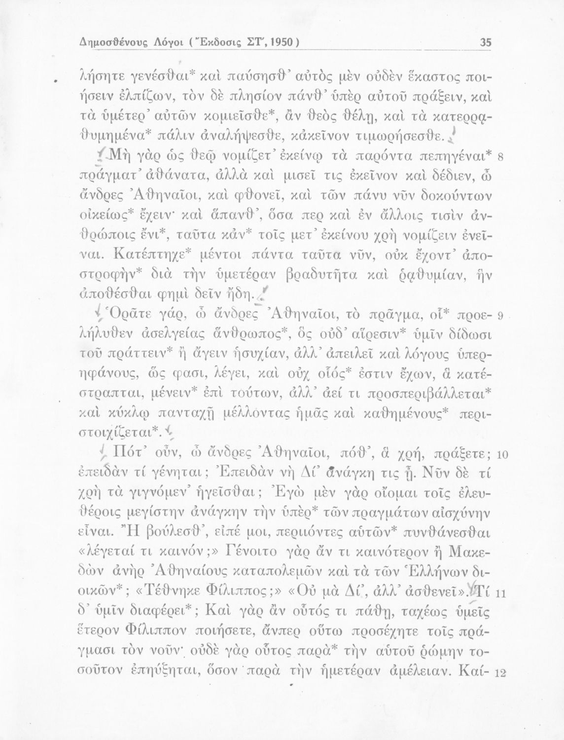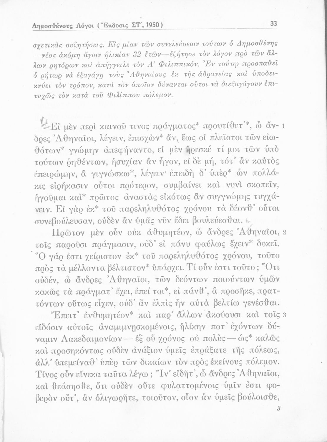 Σχολικό εγχειρίδιο Αρχαίων Ελληνικών Δ΄ Γυμνασίου που περιλαμβάνει εισαγωγή στη ζωή και στο έργο του Δημοσθένη, τον Α΄ κατά Φιλίππου, και τους Α΄ και Β΄ Ολυνθιακούς και ερμηνευτικά και ετυμολογικά σχόλια.