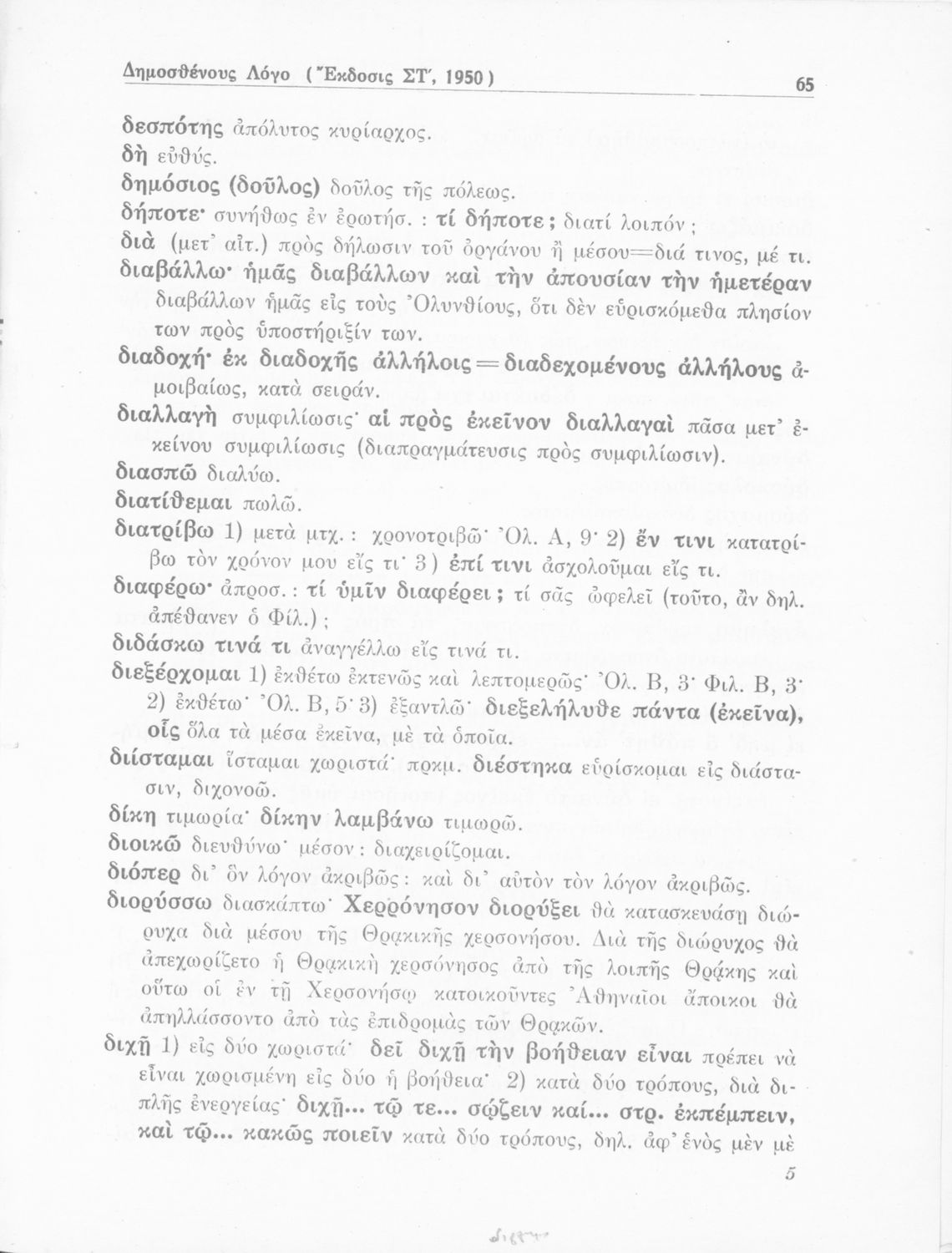 Σχολικό εγχειρίδιο Αρχαίων Ελληνικών Δ΄ και Ε΄ Γυμνασίου που περιέχει τους Ολυνθιακούς Α΄ και Β΄ και τους Φιλιππικούς Α΄ και Β΄ του Δημοσθένη, βιογραφικό σημείωμα, λεξιλόγιο και ερμηνευτικά και ετυμολογικά ...
