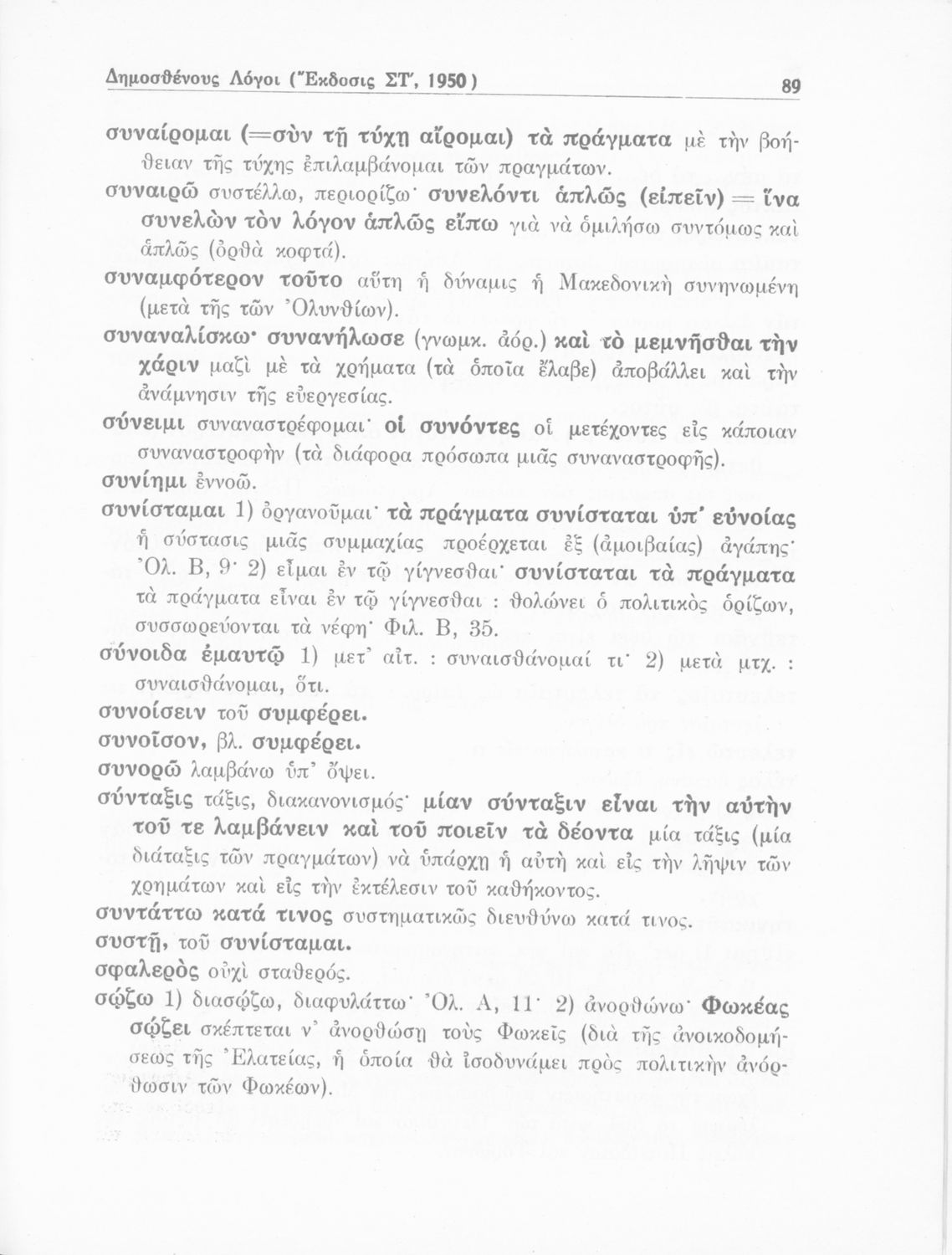Σχολικό εγχειρίδιο Αρχαίων Ελληνικών Ε΄ Γυμνασίου που περιέχει τους Ολυνθιακούς Α΄ και Β΄ και τους Φιλιππικούς Α΄ και Β΄ του Δημοσθένη, βιογραφικό σημείωμα, λεξιλόγιο και ερμηνευτικά και ετυμολογικά σχόλια.