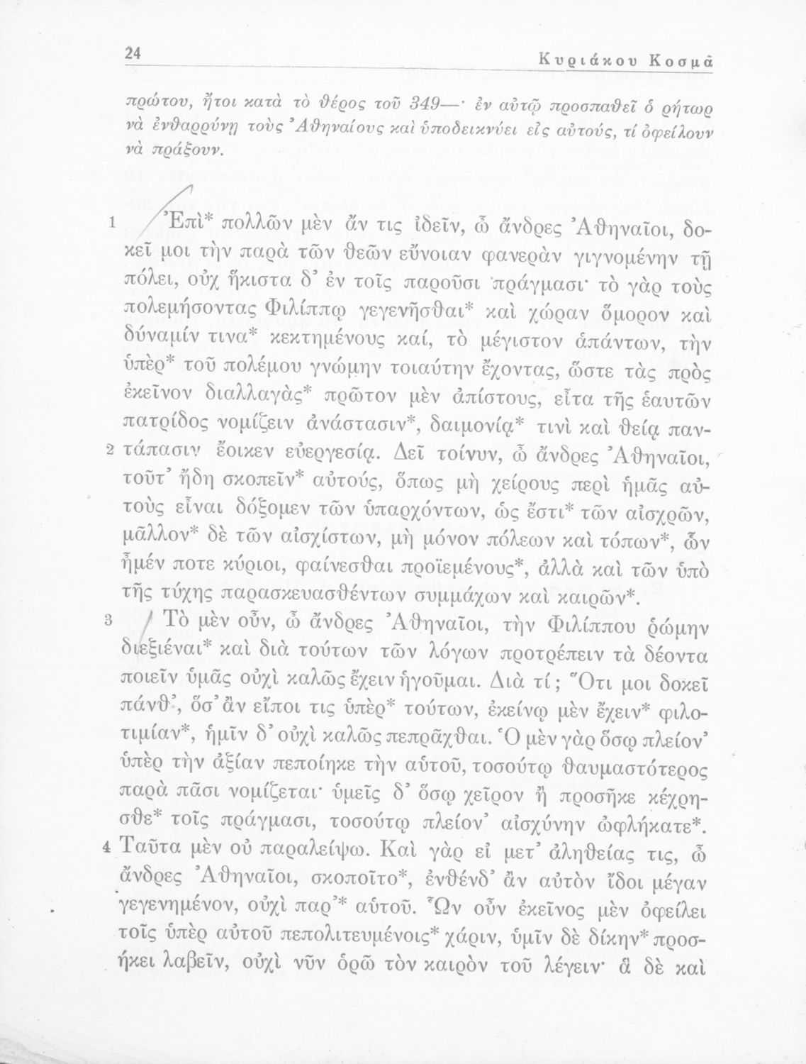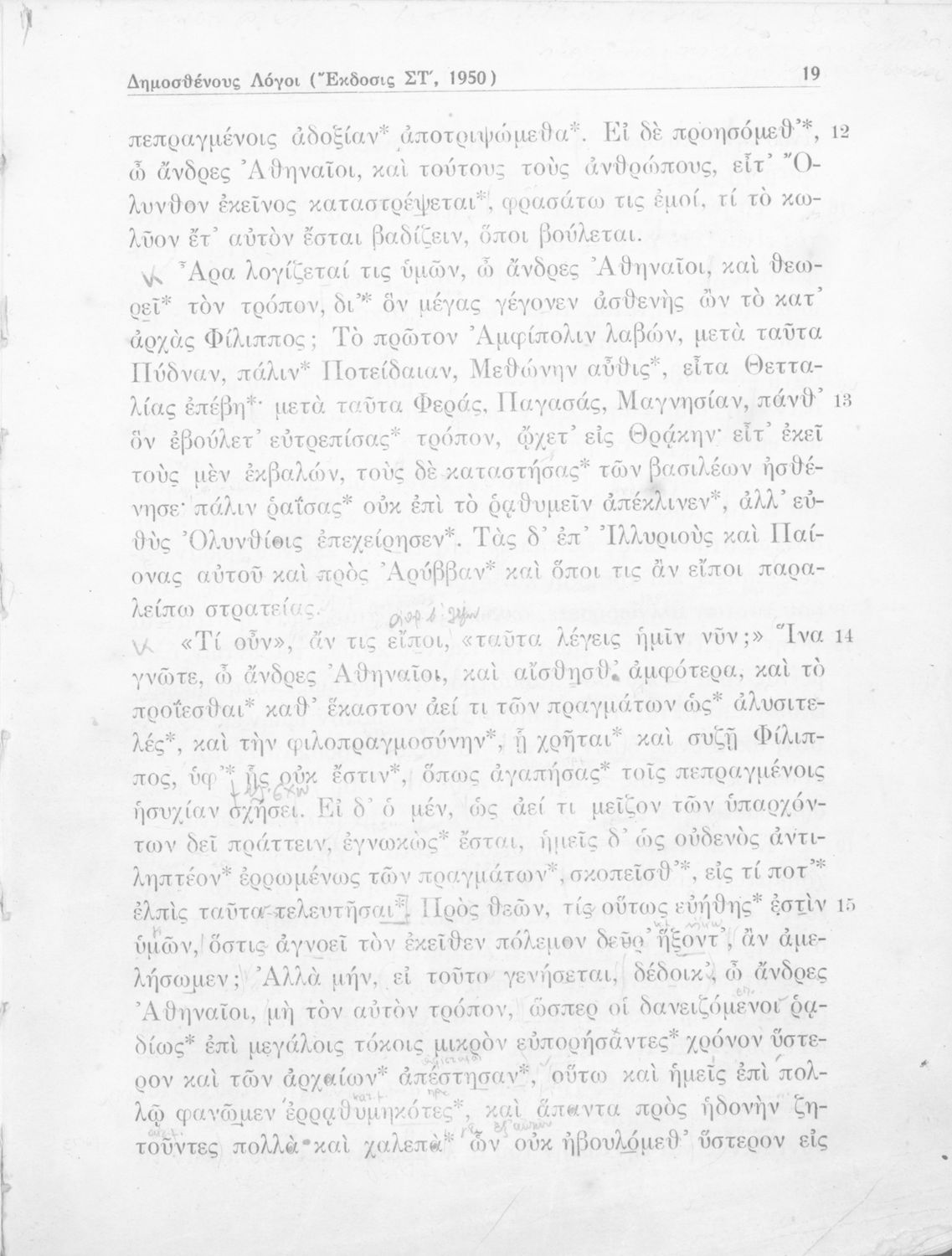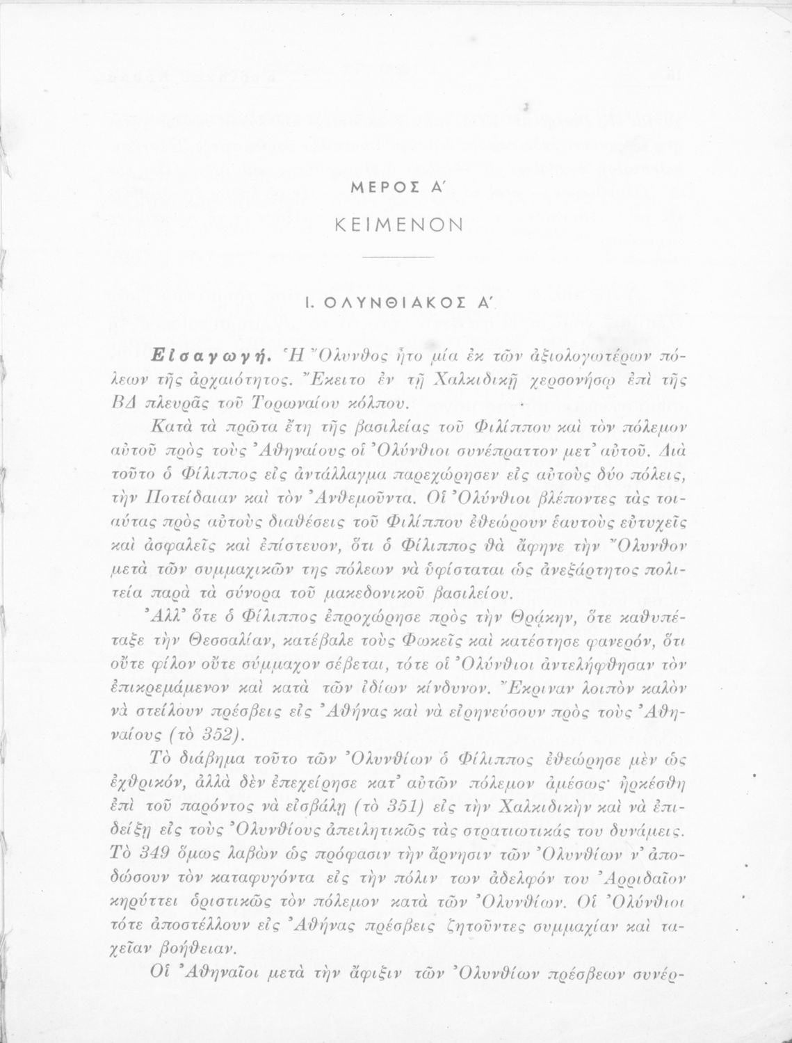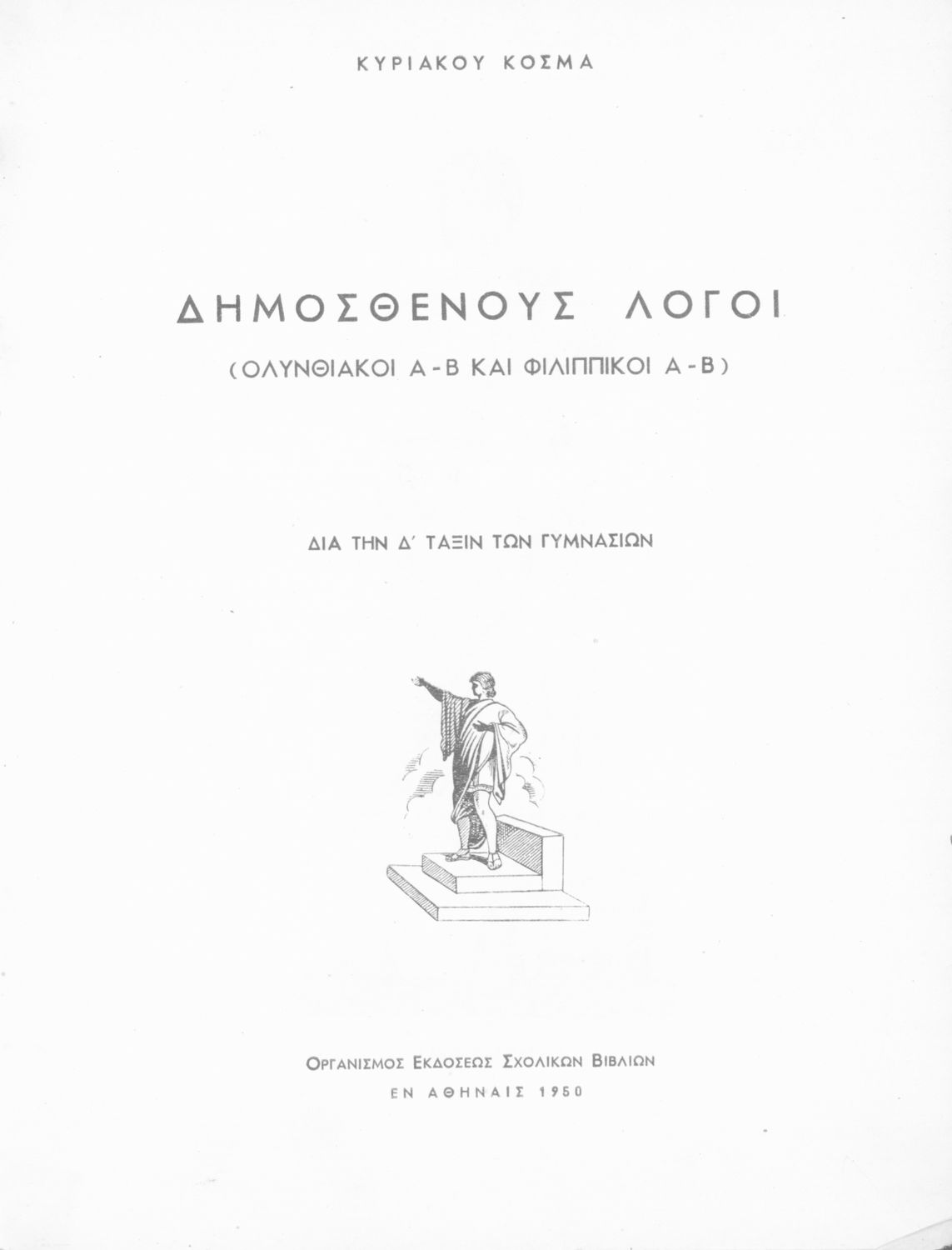 Σχολικό εγχειρίδιο Αρχαίων Ελληνικών Δ΄ Γυμνασίου που περιλαμβάνει εισαγωγή στη ζωή και στο έργο του Δημοσθένη, τον Α΄ κατά Φιλίππου, και τους Α΄ και Β΄ Ολυνθιακούς και ερμηνευτικά και ετυμολογικά σχόλια.