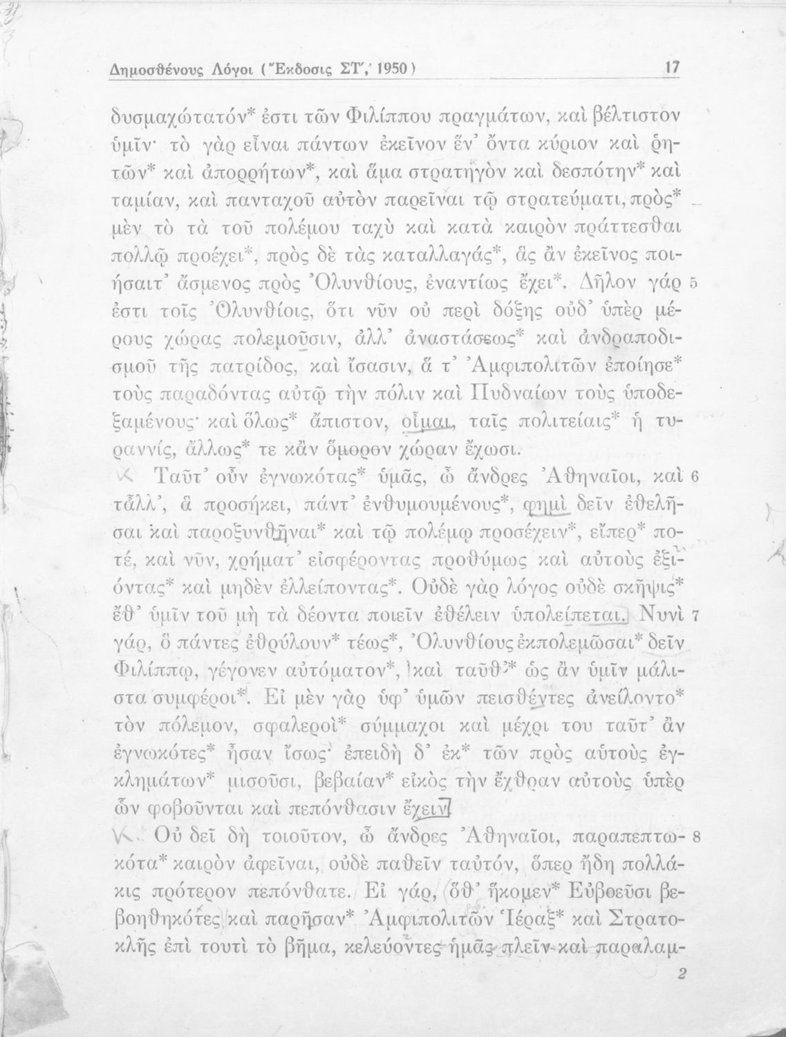 Σχολικό εγχειρίδιο Αρχαίων Ελληνικών Ε΄ Γυμνασίου που περιέχει τους Ολυνθιακούς Α΄ και Β΄ και τους Φιλιππικούς Α΄ και Β΄ του Δημοσθένη, βιογραφικό σημείωμα, λεξιλόγιο και ερμηνευτικά και ετυμολογικά σχόλια.