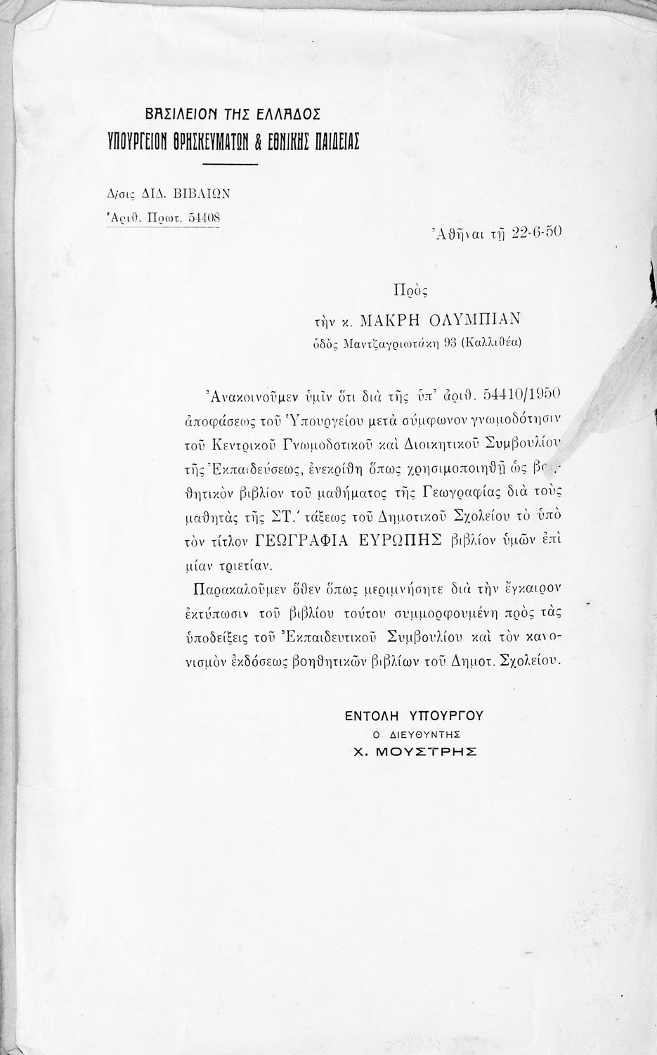 Υπουργική απόφαση / Σύμβαση: 54410/1950