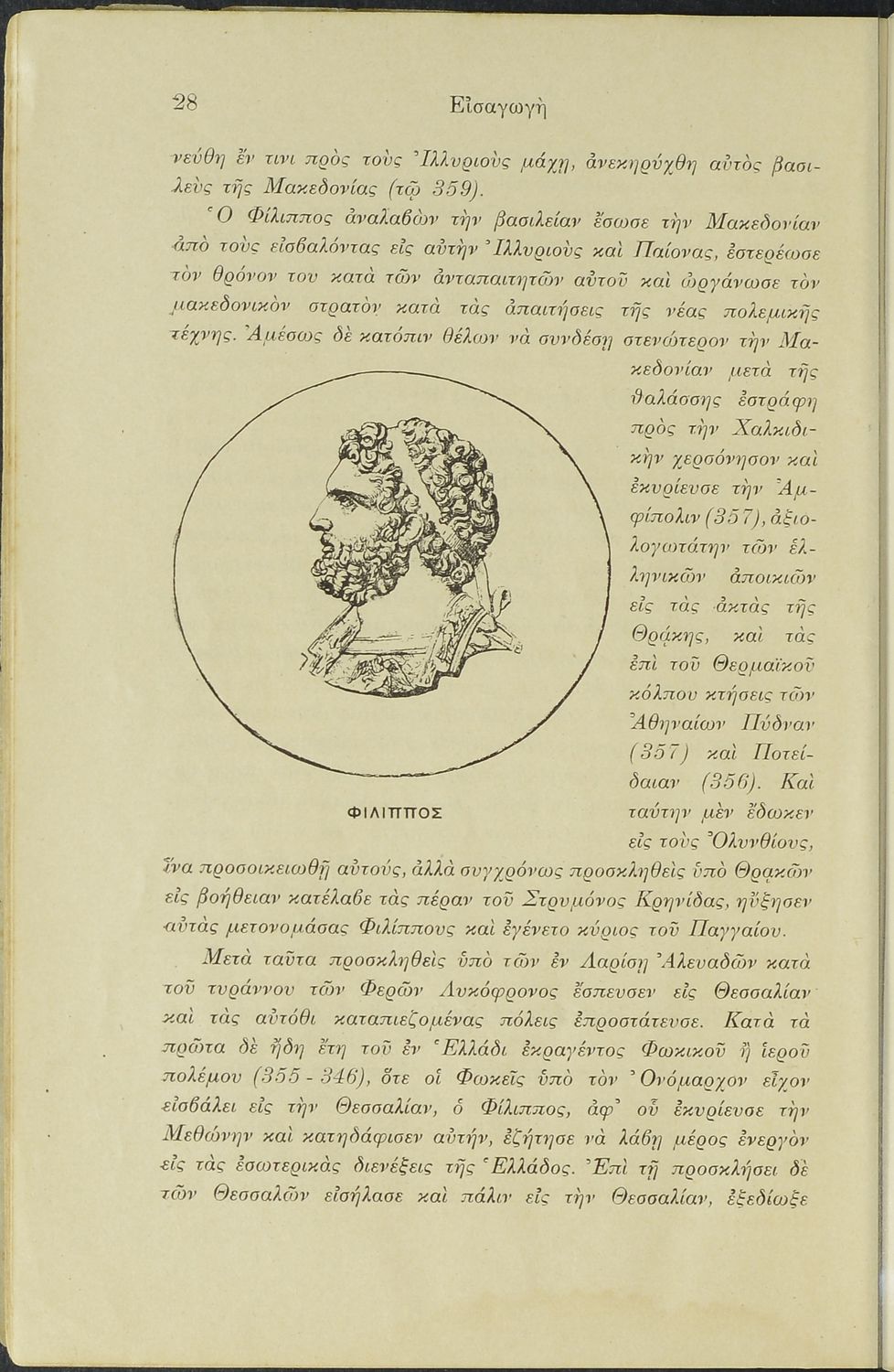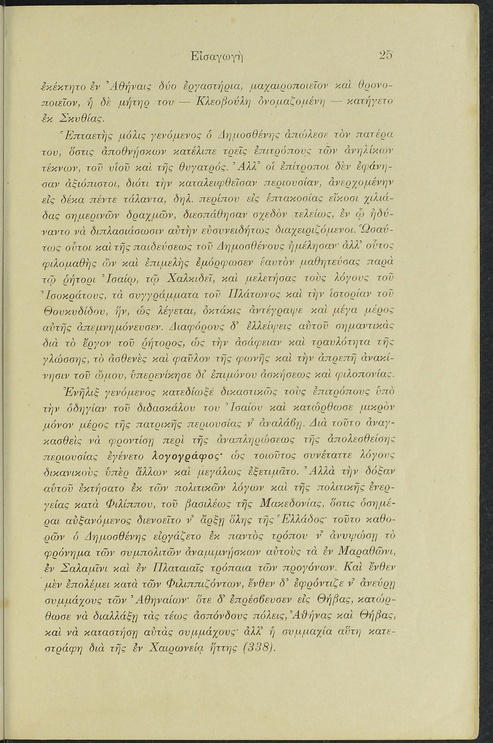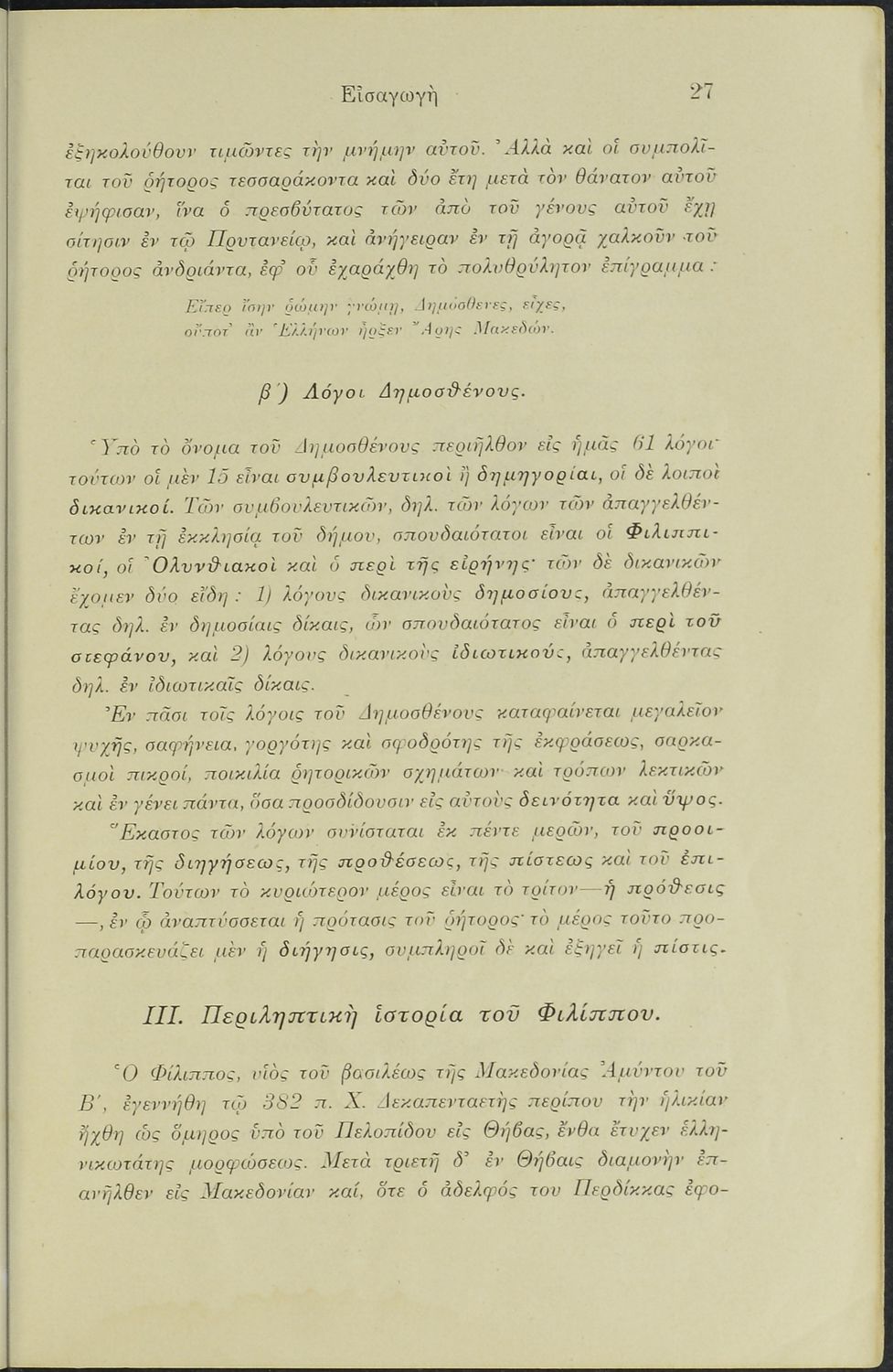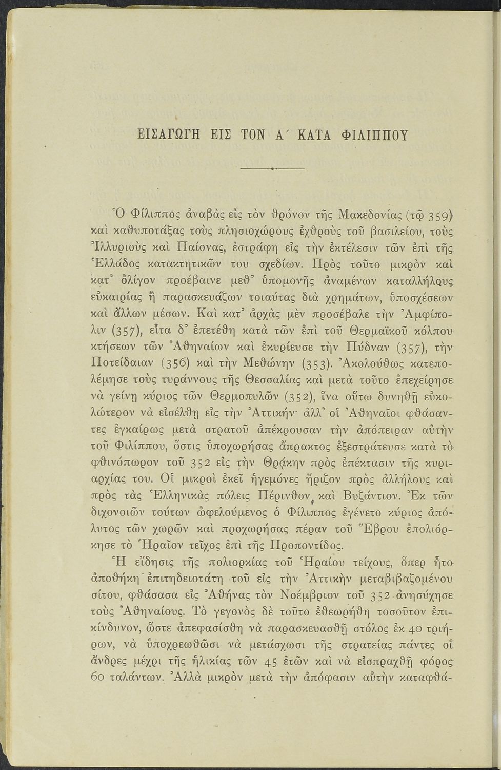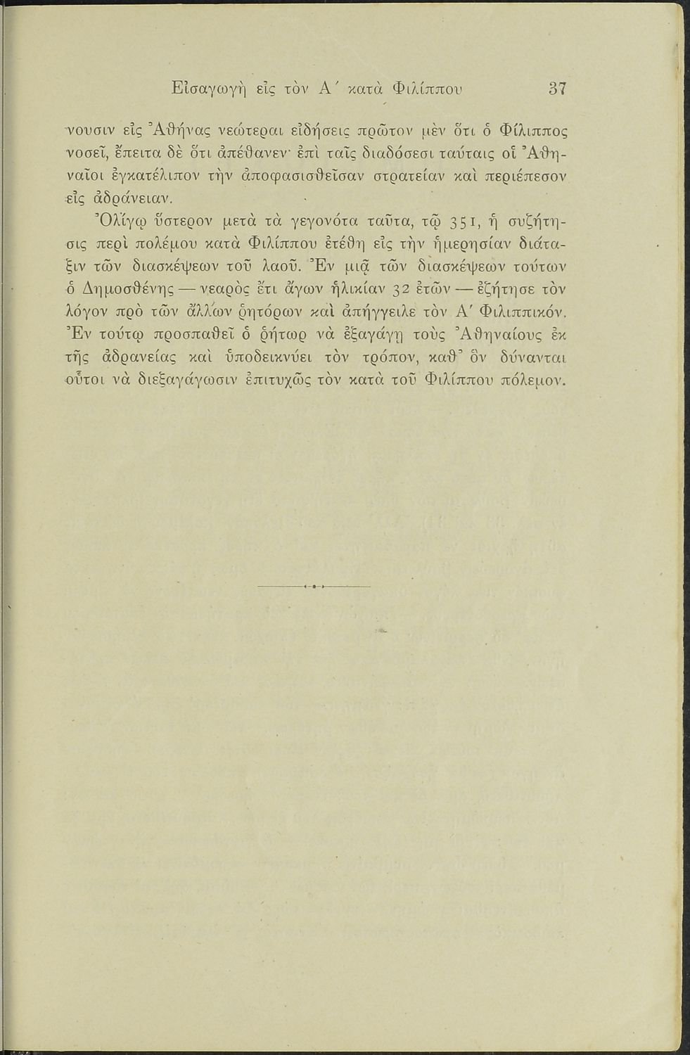 Σχολικό εγχειρίδιο Αρχαίων Ελληνικών Γυμνασίου που περιλαμβάνει το Λόγο του Δημοσθένη Α΄ κατά Φιλίππου, ερμηνευτικά σχόλια και χάρτη.