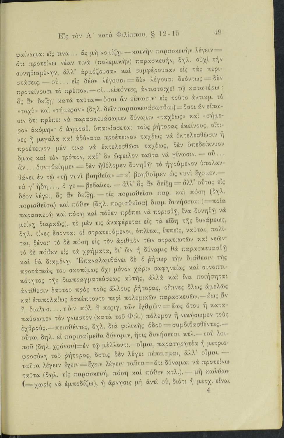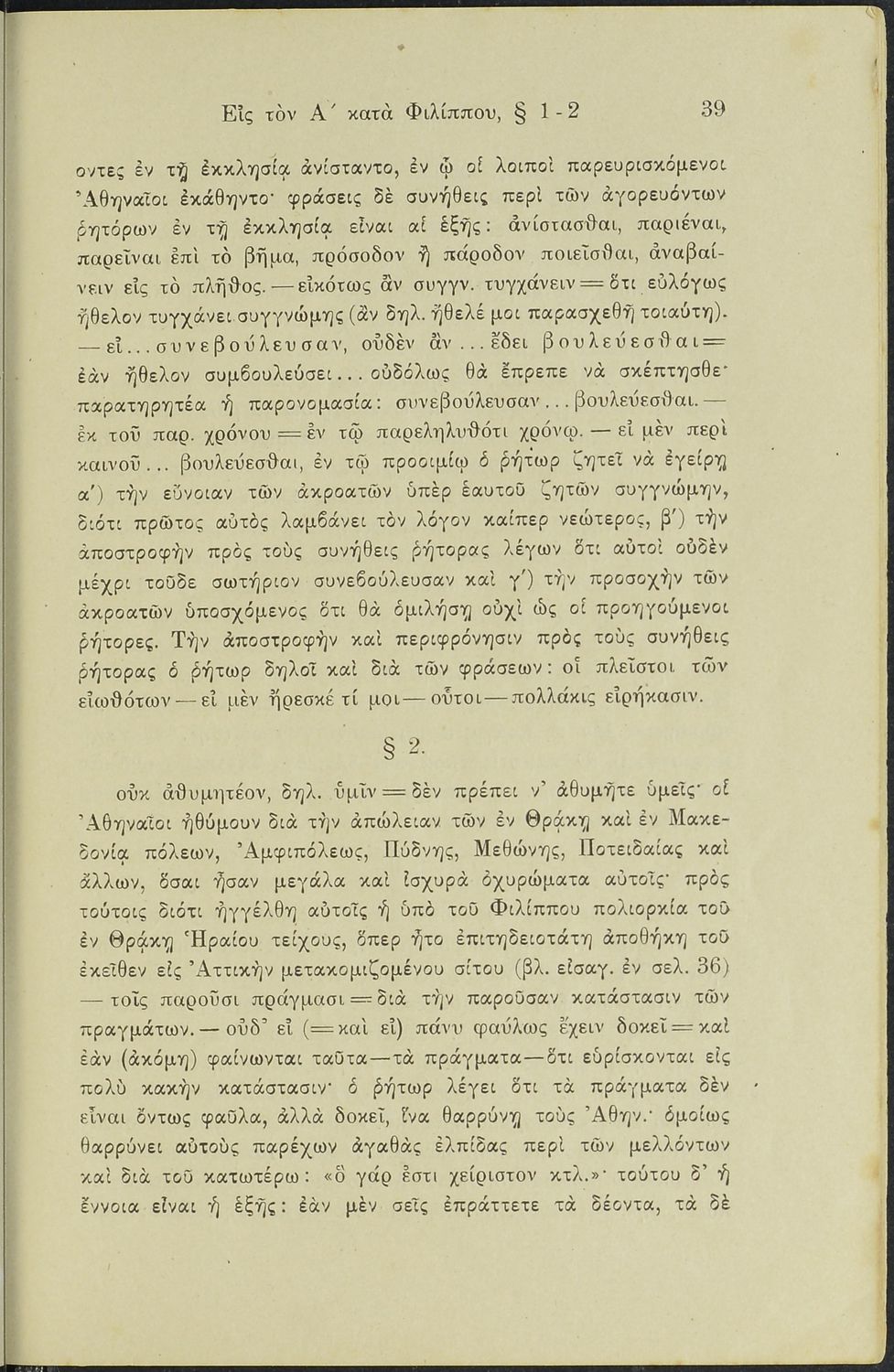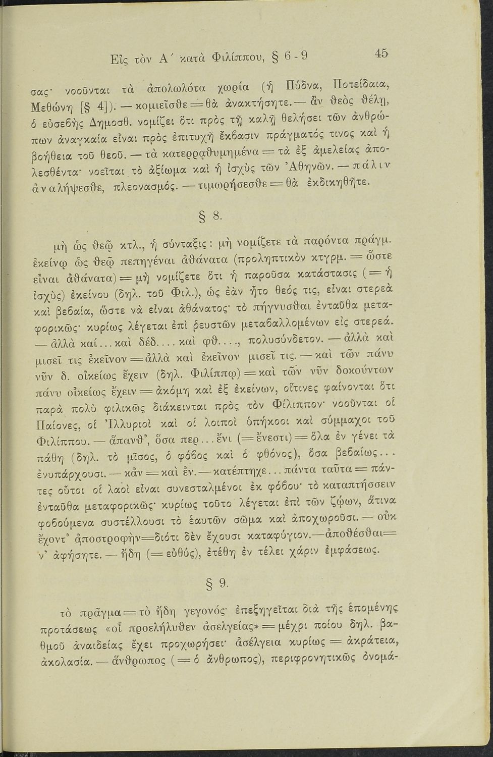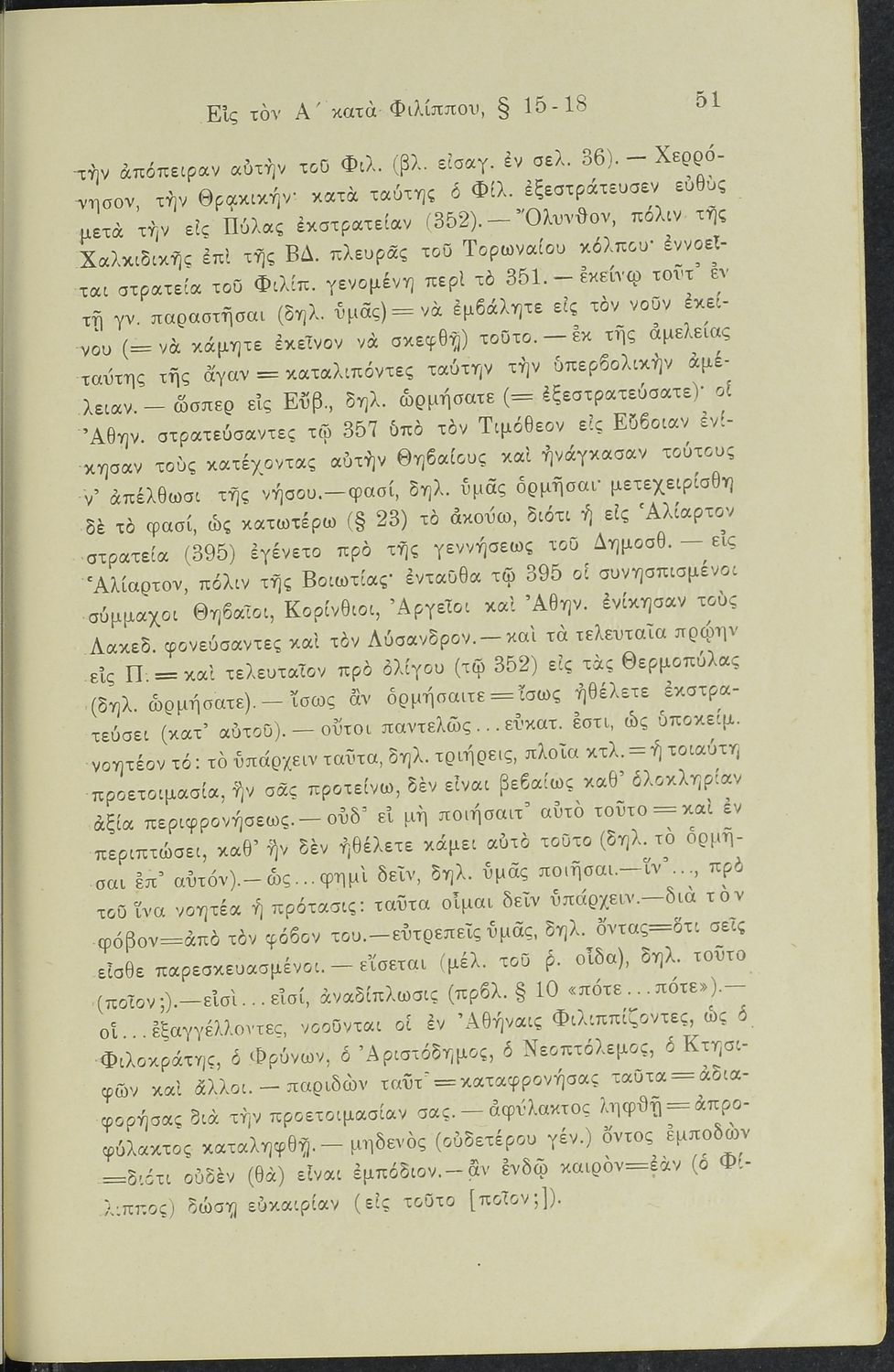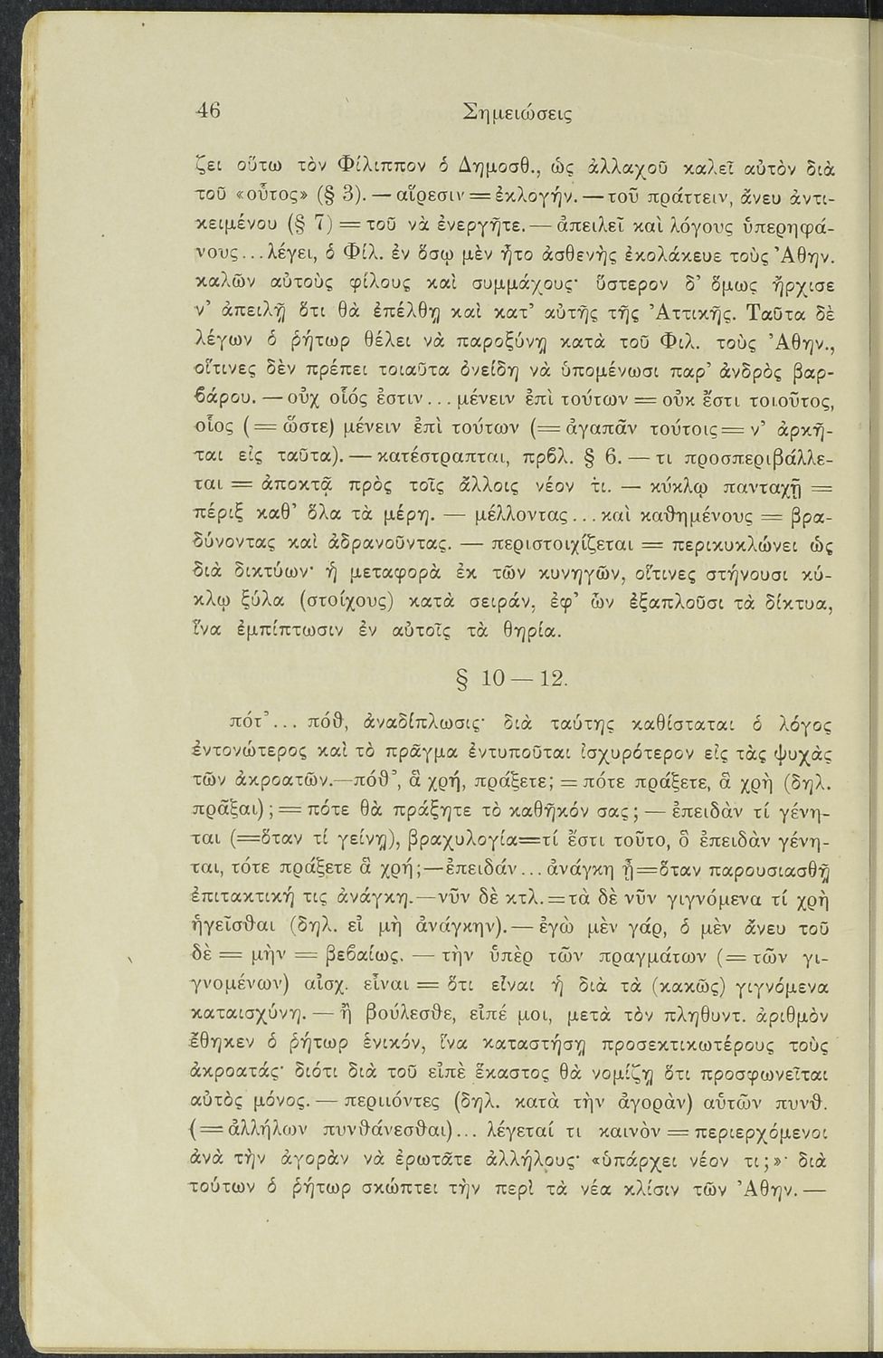 Σχολικό εγχειρίδιο Αρχαίων Ελληνικών Γυμνασίου που περιλαμβάνει το Λόγο του Δημοσθένη Α΄ κατά Φιλίππου, ερμηνευτικά σχόλια και χάρτη.