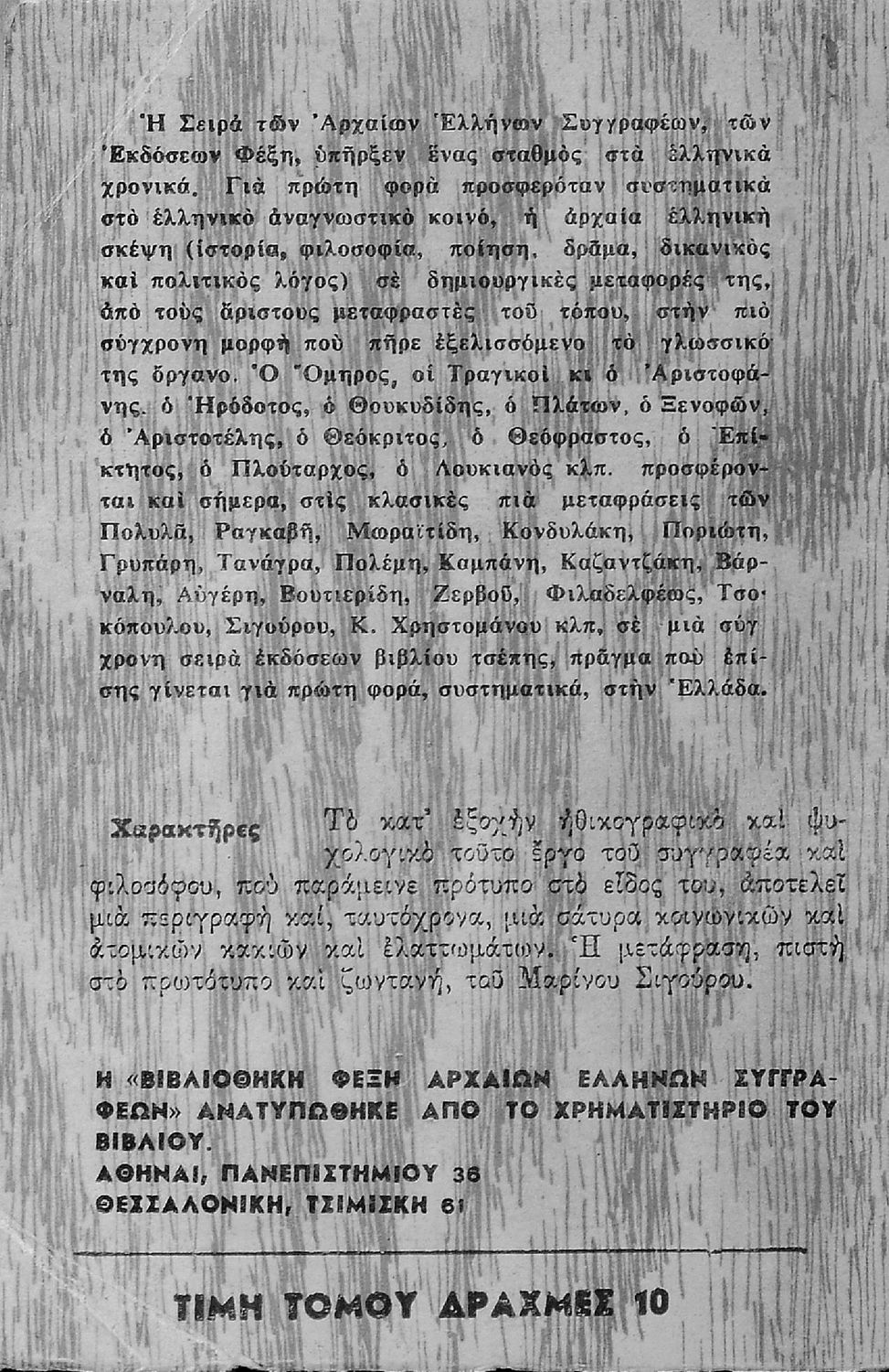Μαθητικό βοήθημα Αρχαίων Ελληνικών της Γ΄ τάξης των τετρατάξιων Γυμνασίων. Το βιβλίο περιέχει το έργο του Θεόφραστου Χαρακτήρες από μετάφραση.