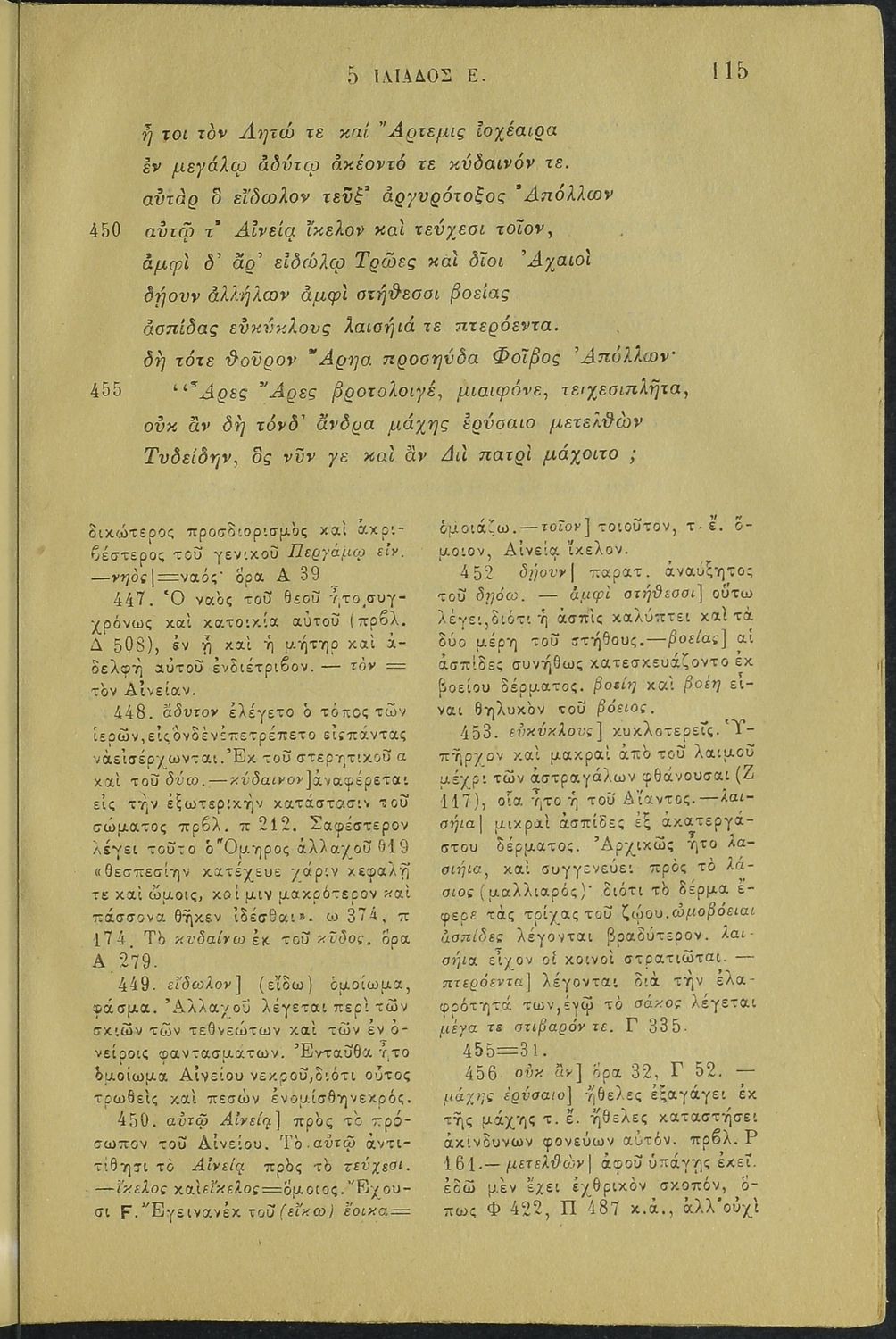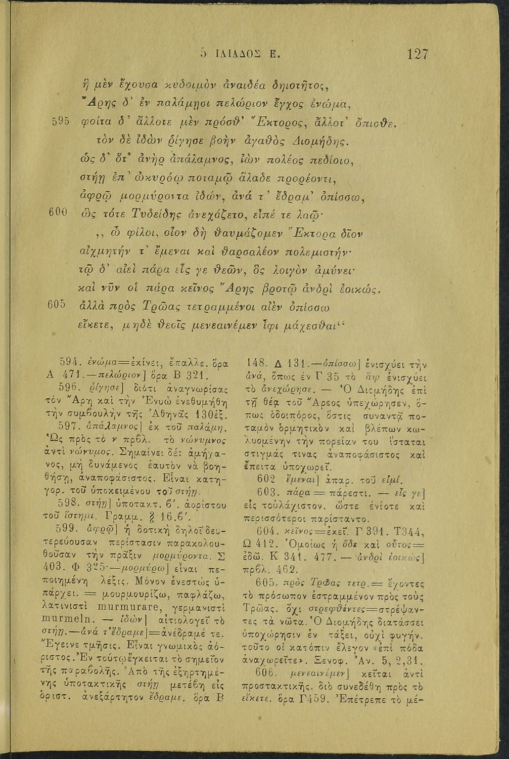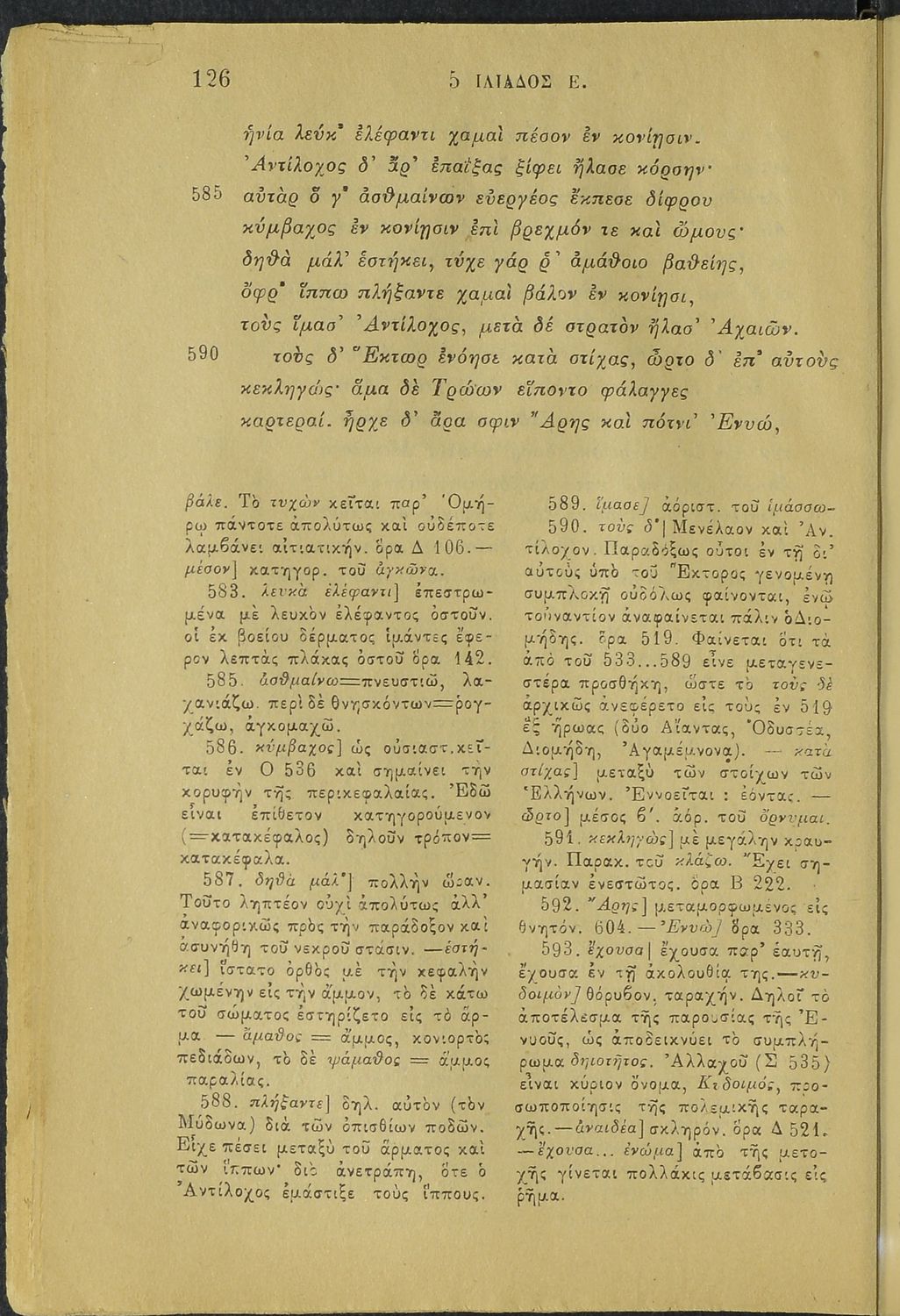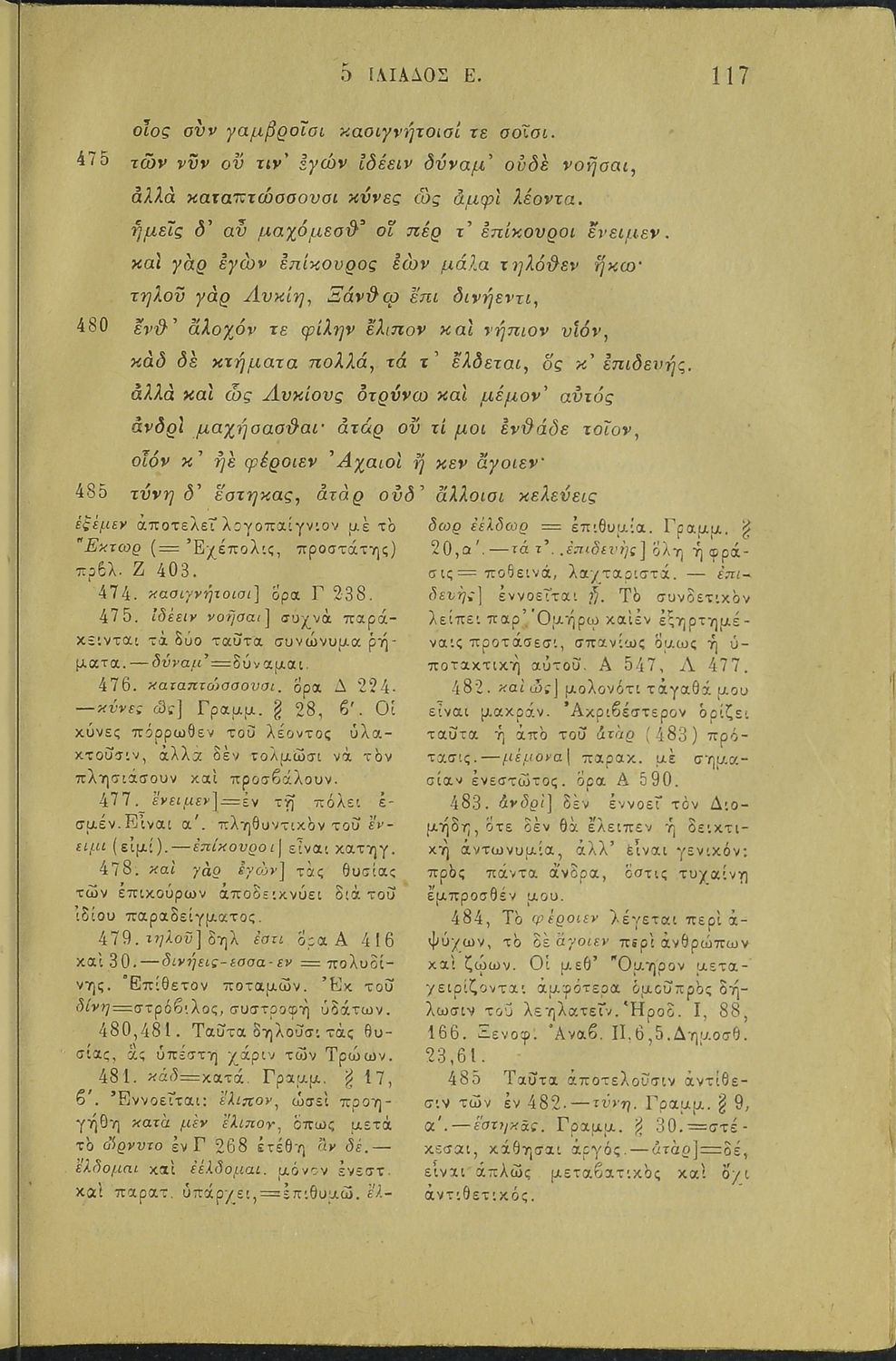 Μαθητικό βοήθημα για το μάθημα των Αρχαίων Ελληνικών στο Γυμνάσιο. Περιέχει τη ραψωδία Ε της Ιλιάδας καθώς και πραγματολογικά σχόλια του συγγραφέα. Ο συγγραφέας ήταν πρώην Γυμνασιάρχης.