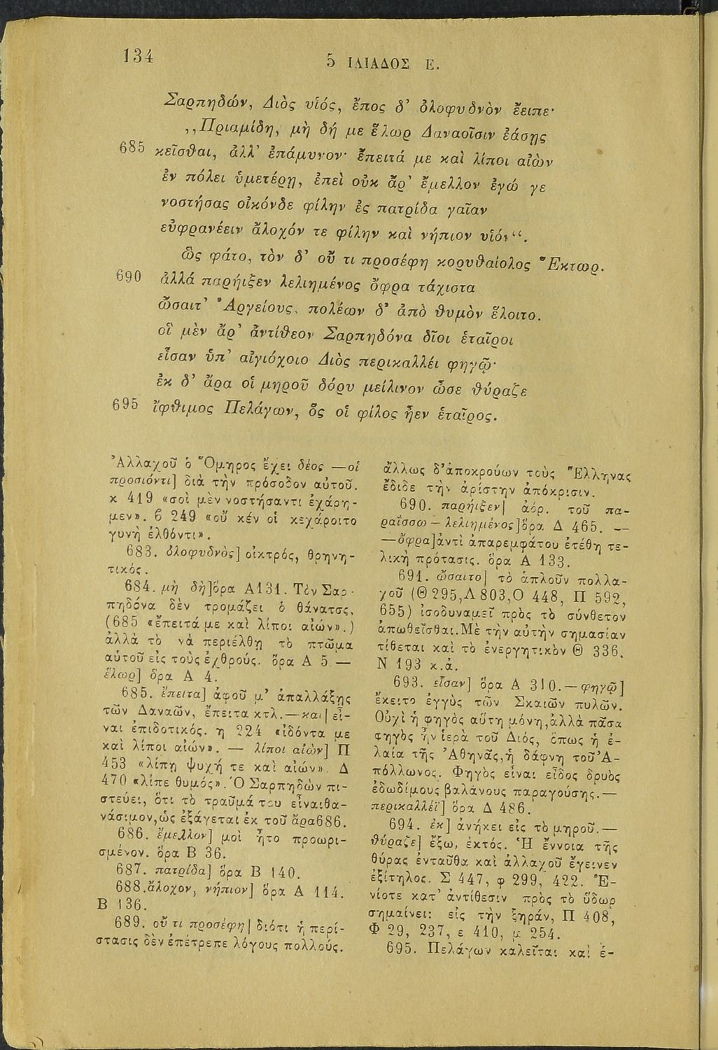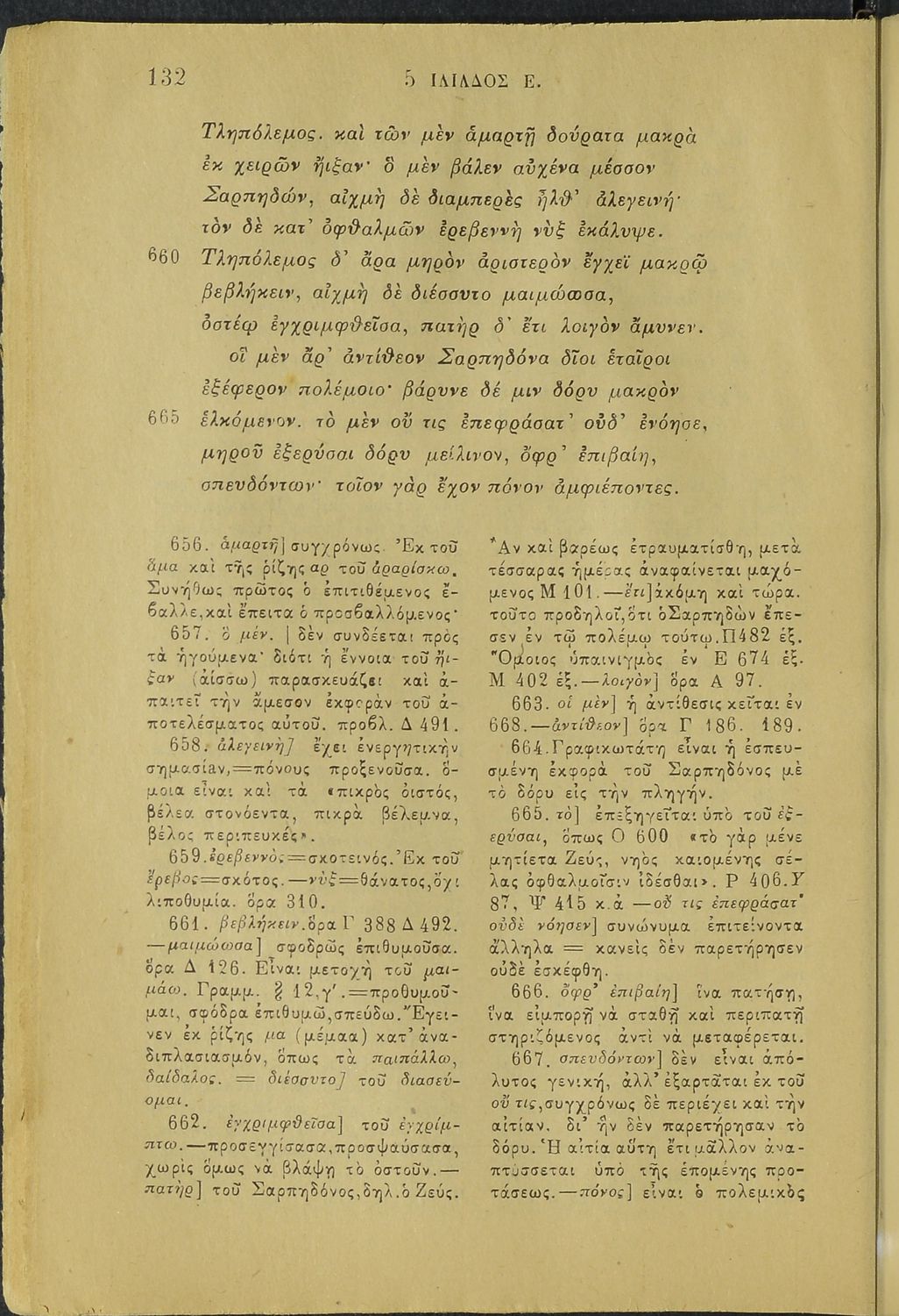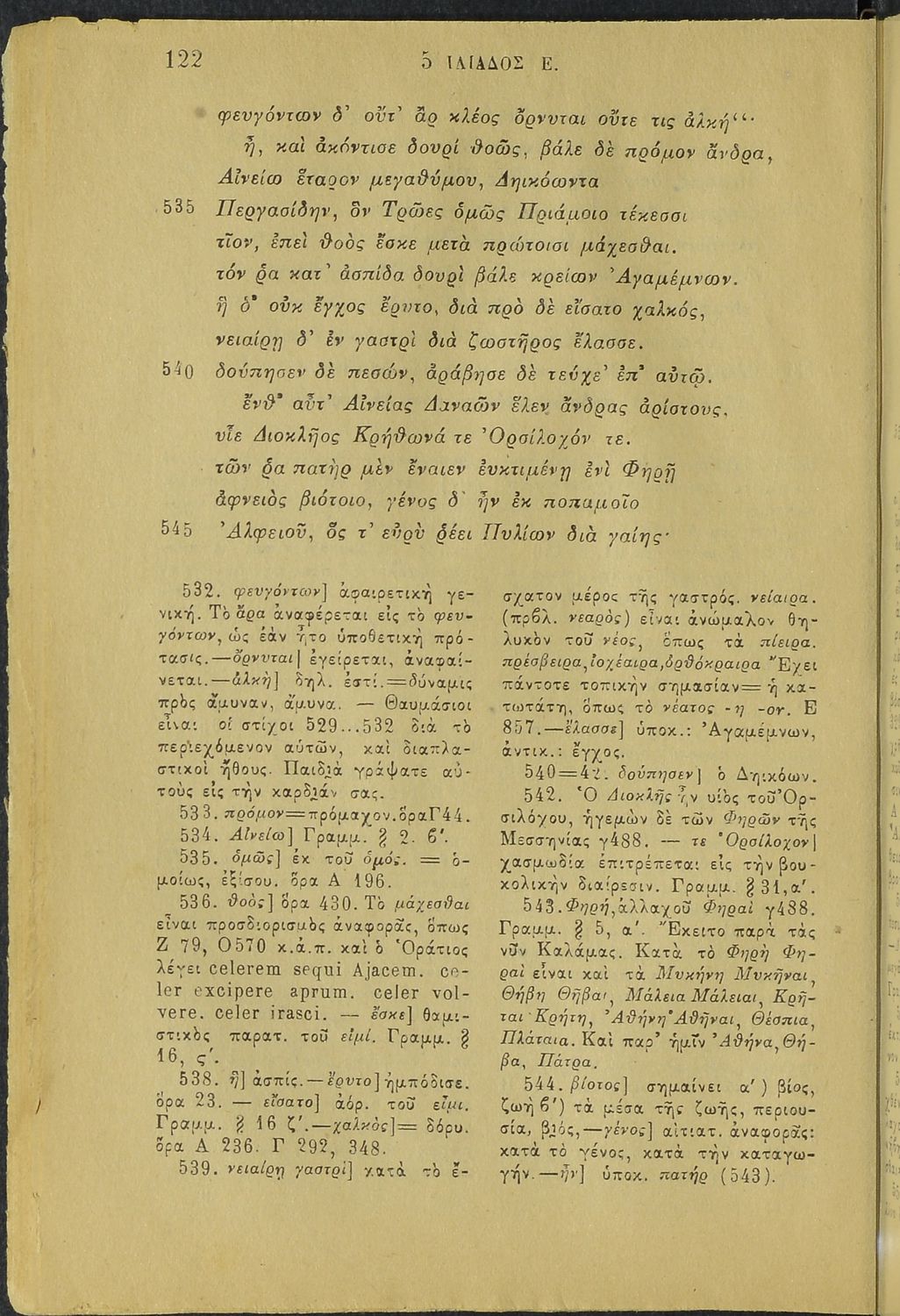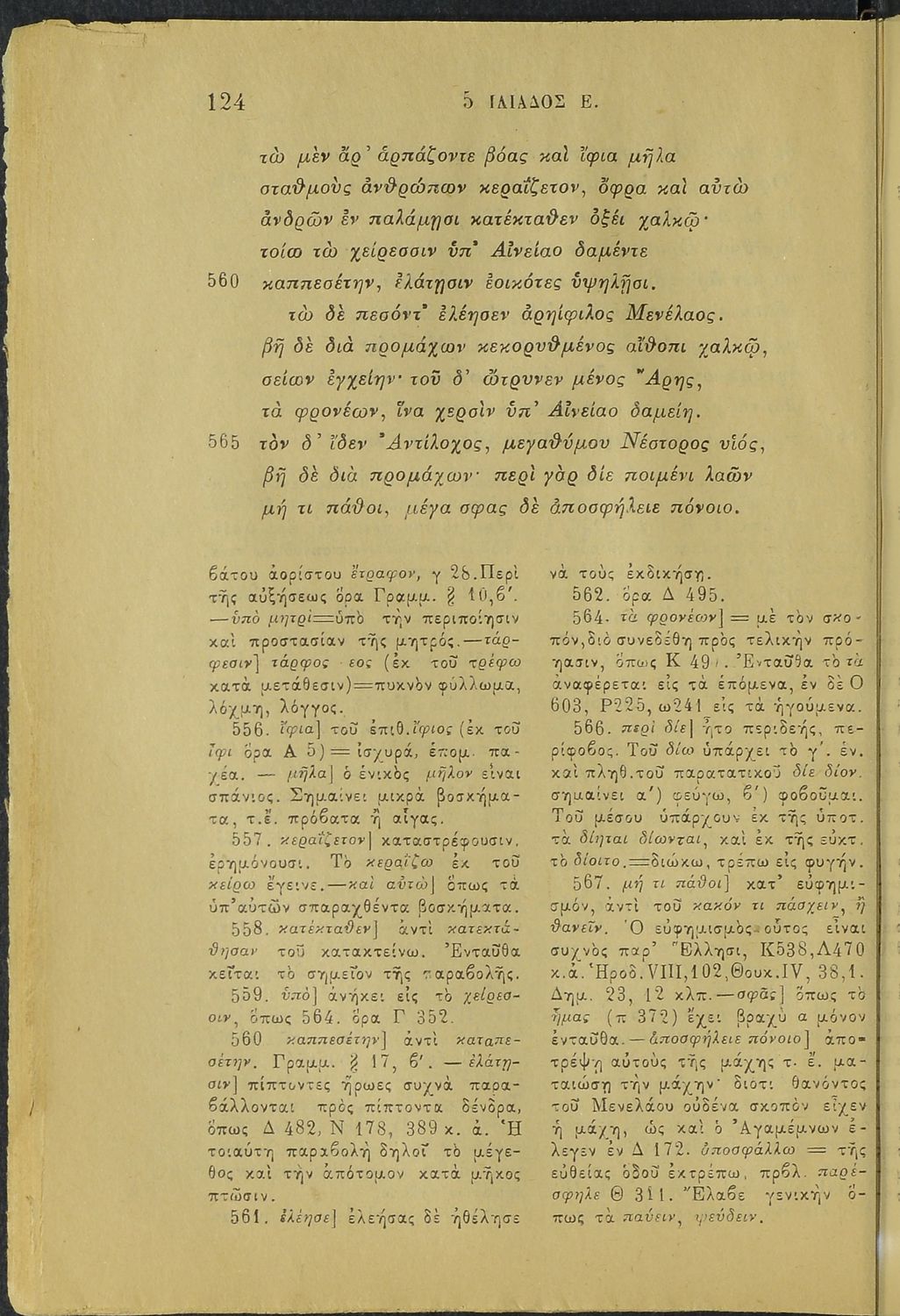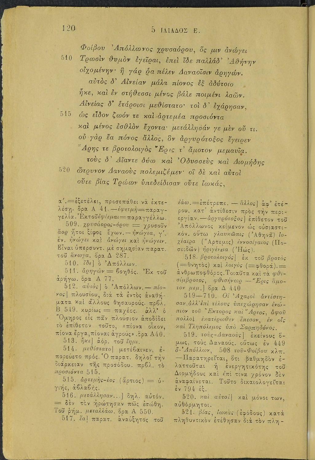 Μαθητικό βοήθημα για το μάθημα των Αρχαίων Ελληνικών στο Γυμνάσιο. Περιέχει τη ραψωδία Ε της Ιλιάδας καθώς και πραγματολογικά σχόλια του συγγραφέα. Ο συγγραφέας ήταν πρώην Γυμνασιάρχης.