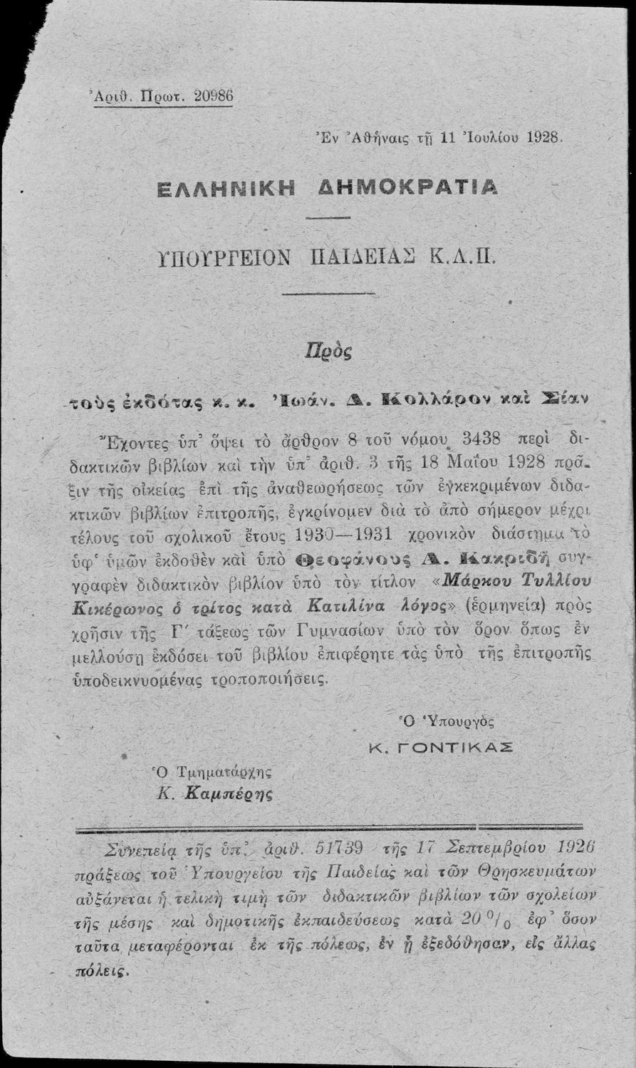 Εκδότης: Ιωάννης Δ. Κολλάρος Έτος έκδοσης: 1928 Τόπος έκδοσης: Αθήνα Έκδοση: 6η Υπουργική απόφαση / Σύμβαση: 20986/11-7-1928 Έτος έγκρισης: 1928 |