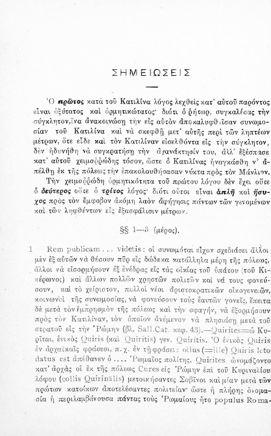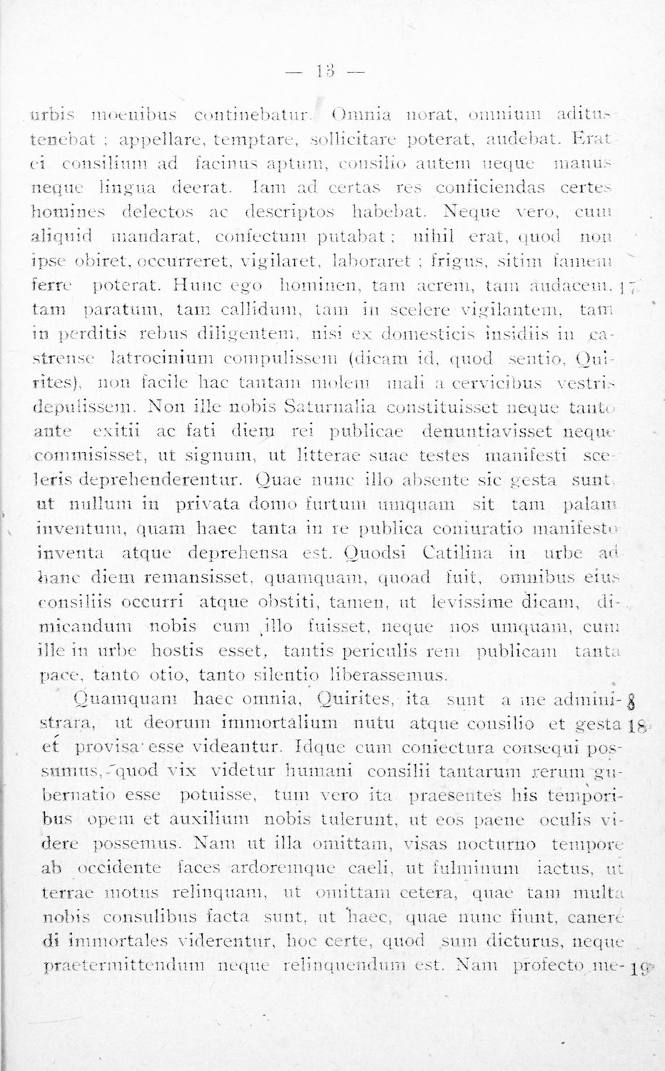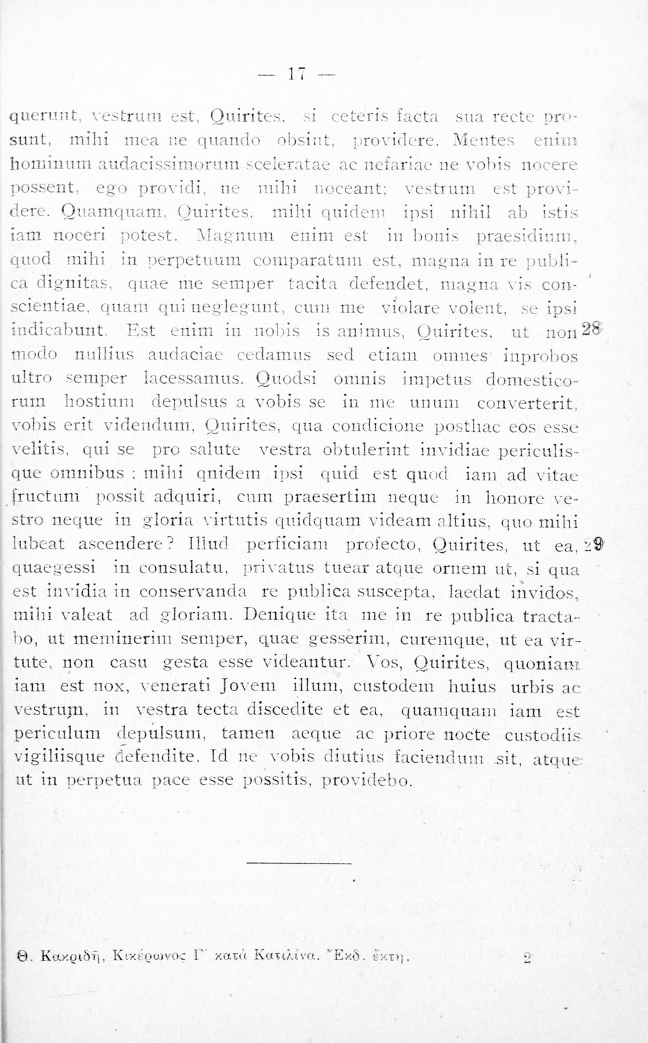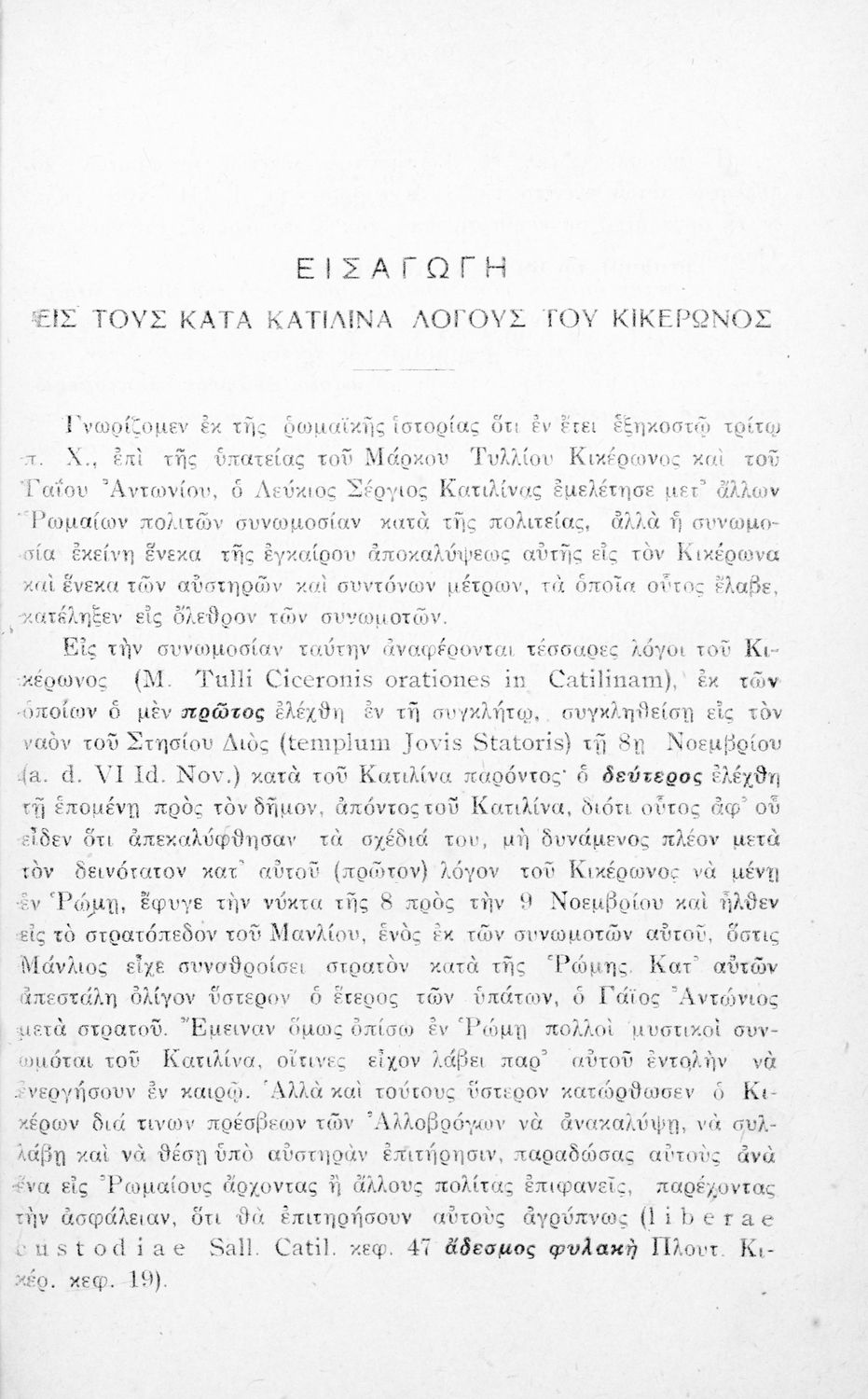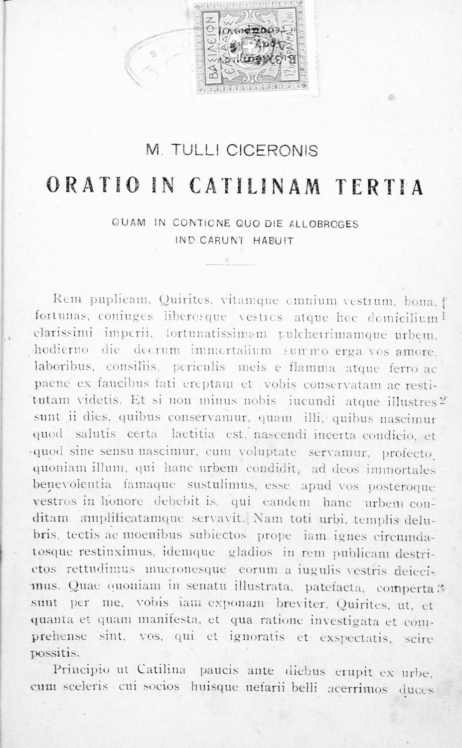 Σχολικό εγχειρίδιο Λατινικών Γ΄ Γυμνασίου που περιλαμβάνει την εισαγωγή στο έργο και τη ζωή του Κικέρωνα, το λατινικό κείμενο του Τρίτου Λόγου κατά Κατιλίνα και ερμηνευτικά, γραμματικά και πραγματολογικά σχόλια.