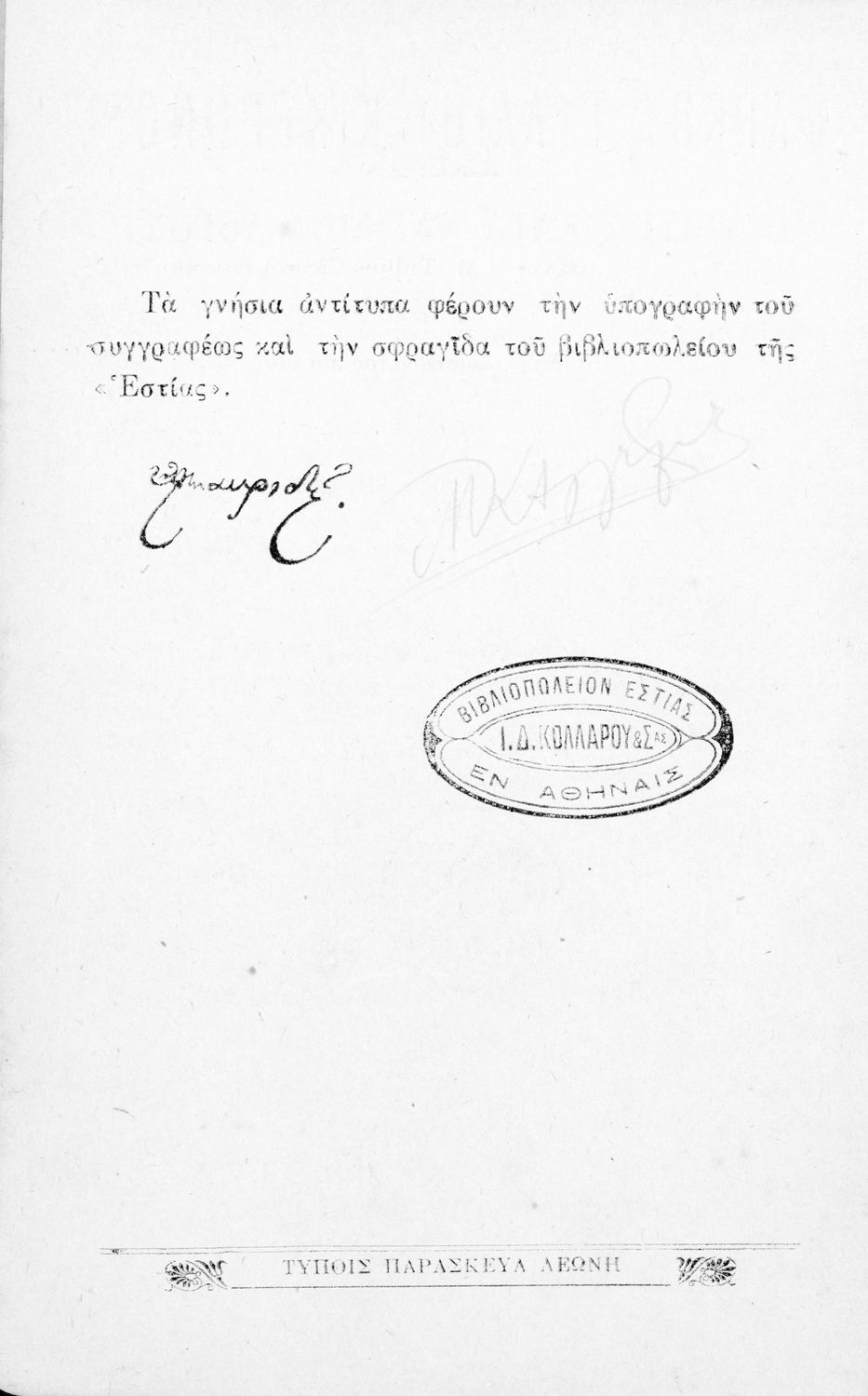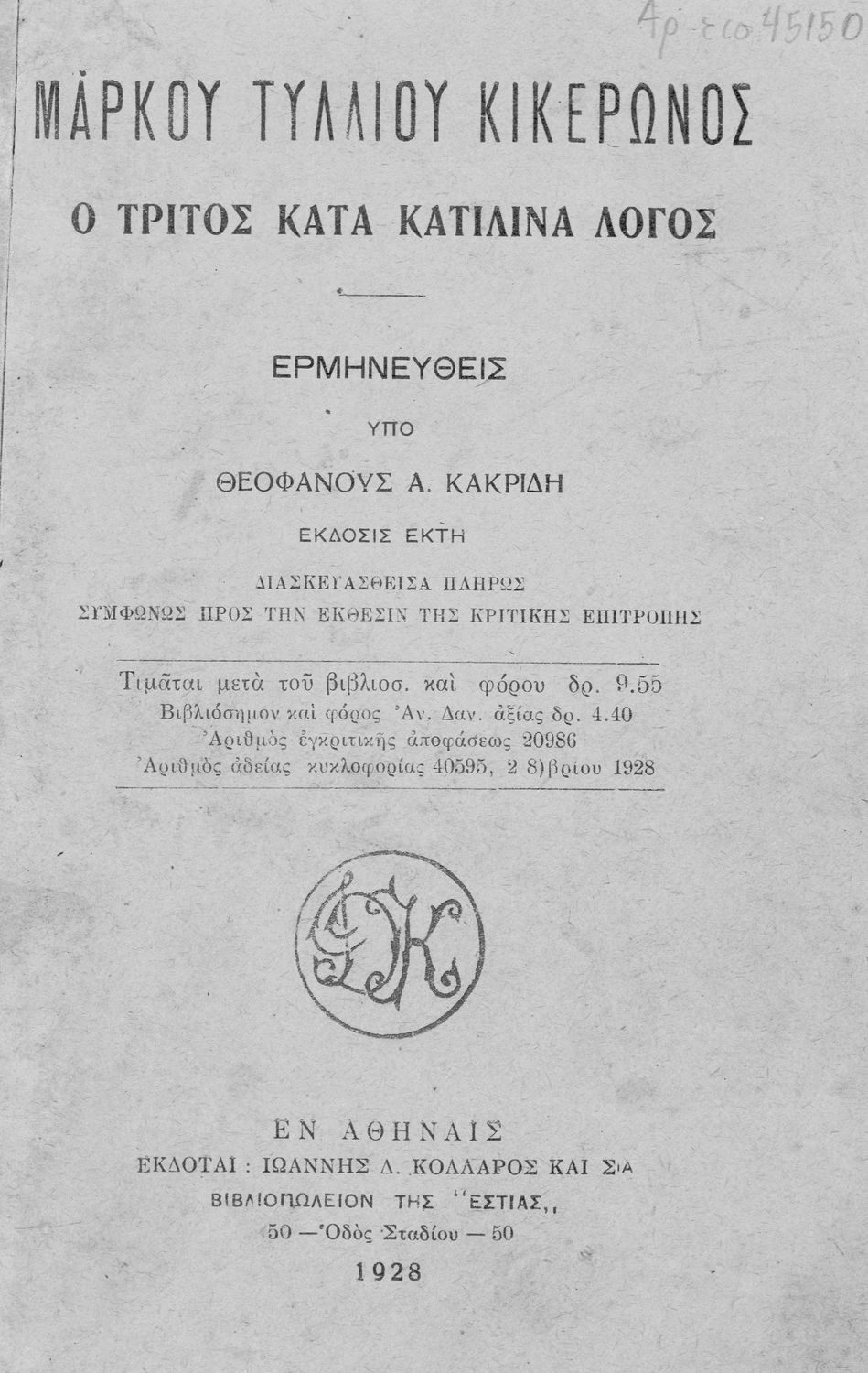 Εκδότης: Ιωάννης Δ. Κολλάρος Έτος έκδοσης: 1928 Τόπος έκδοσης: Αθήνα Έκδοση: 6η Υπουργική απόφαση / Σύμβαση: 20986/11-7-1928 Έτος έγκρισης: 1928 |