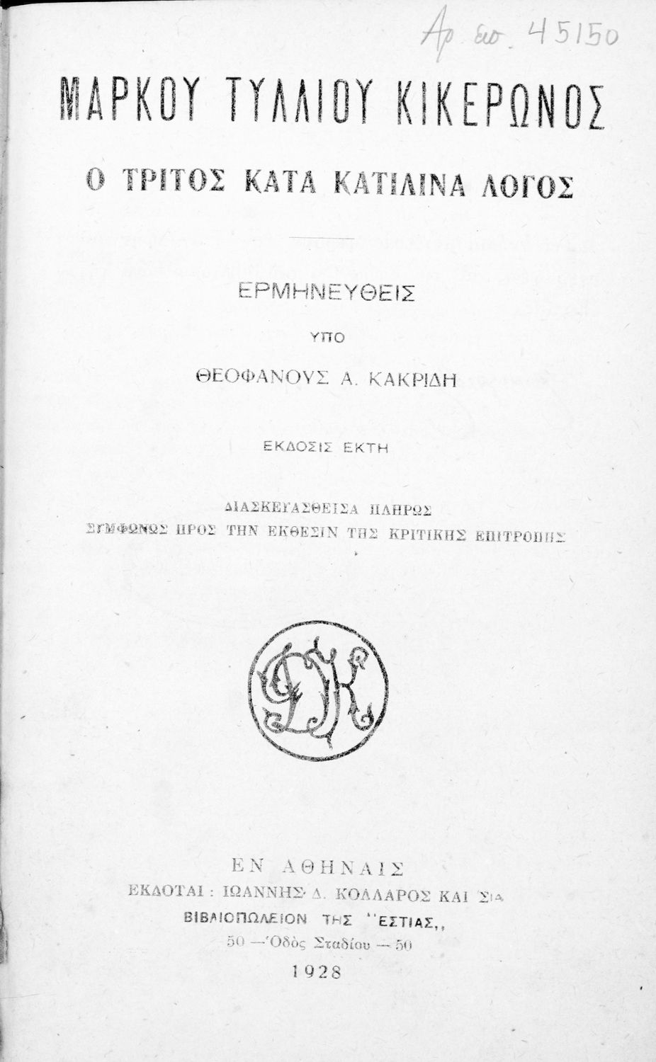 Κωδικός αναγνώρισης: 01-45150a Τίτλος: Μάρκου Τυλλίου Κικέρωνος ο Τρίτος κατά Κατιλίνα Λόγος προς χρήσιν των μαθητών της Γ΄ τάξεως του Γυμνασίου Συγγραφέας: Μάρκος Τύλλιος Κικέρωνας (M. Tullius Cicero), Θεοφάνης Α. Κακριδής (σχόλια, σημειώσεις) Μέγεθος και υπόστρωμα: Σχολικό εγχειρίδιο, 22εκ., σκληρό εξώφυλλο, 56 σελίδες. |