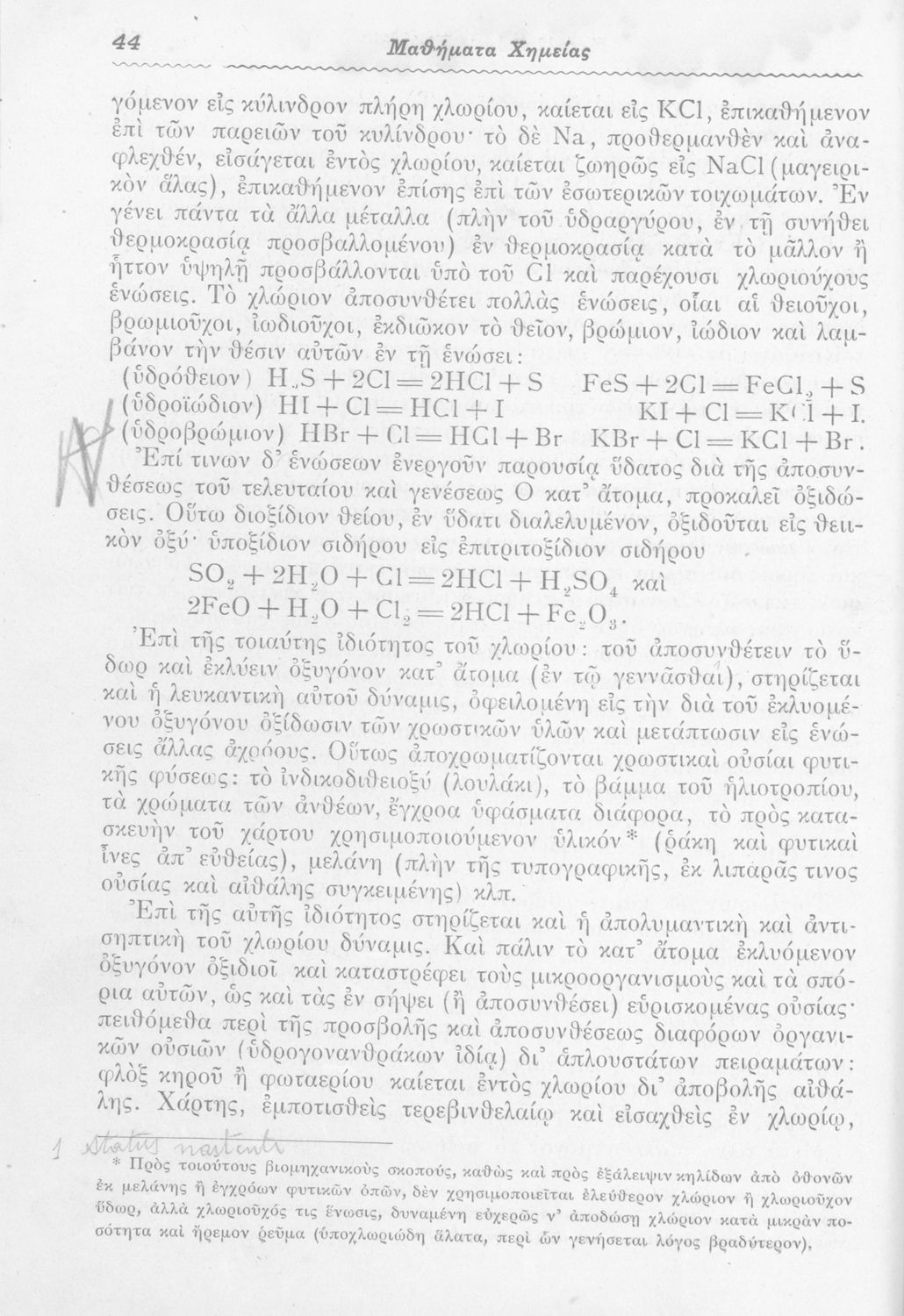 Σχολικό εγχειρίδιο Χημείας για τους μαθητές του Γυμνασίου. Παρουσιάζει μια συνολική επισκόπηση της Οργανικής και της Ανόργανης Χημείας, τις ιδιότητες των χημικών ενώσεων, των μέταλλα και των αμέταλλων.